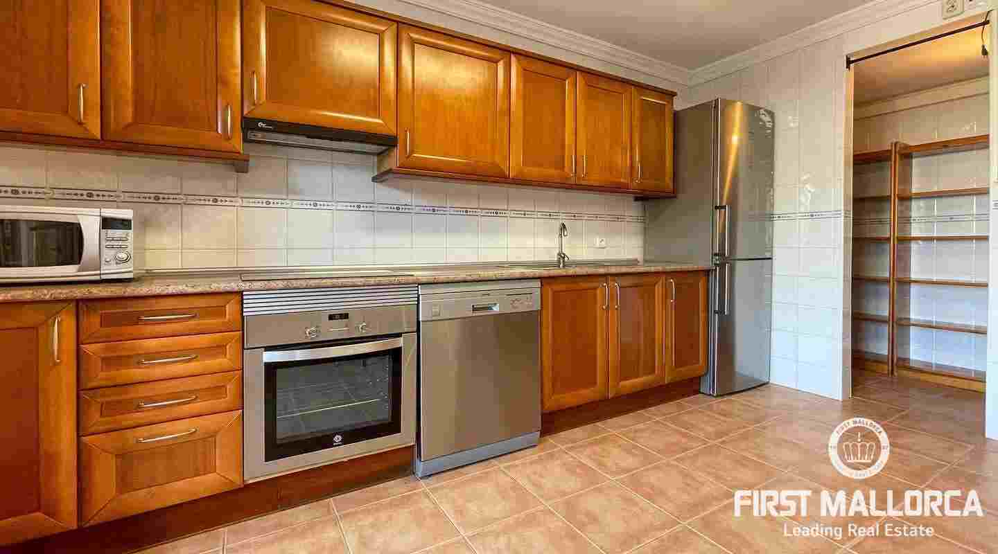 Auf der unteren Etage befindet sich ein großzügiger Wohn-Essbereich, eine voll ausgestattete Küche mit Vorratskammer, einer Waschküche und ein Gäste-WC. Von der Küche aus gelangt man zu der 100m2 großen Außenterrasse, die auf zwei Ebenen unterteilt ist. Die obere Etage des Reihenhauses verfügt derzeit über 3 Schlafzimmer und 2 Badezimmer, eines davon en-Suite. Alle Schlafzimmer bieten bodentiefe Fenster, die viel Licht spenden. Das Masterschlafzimmer kann ohne viel Aufwand wieder in zwei Schlafzimmer unterteilt werden, so dass die Immobilie insgesamt 4 Schlafzimmer bietet.