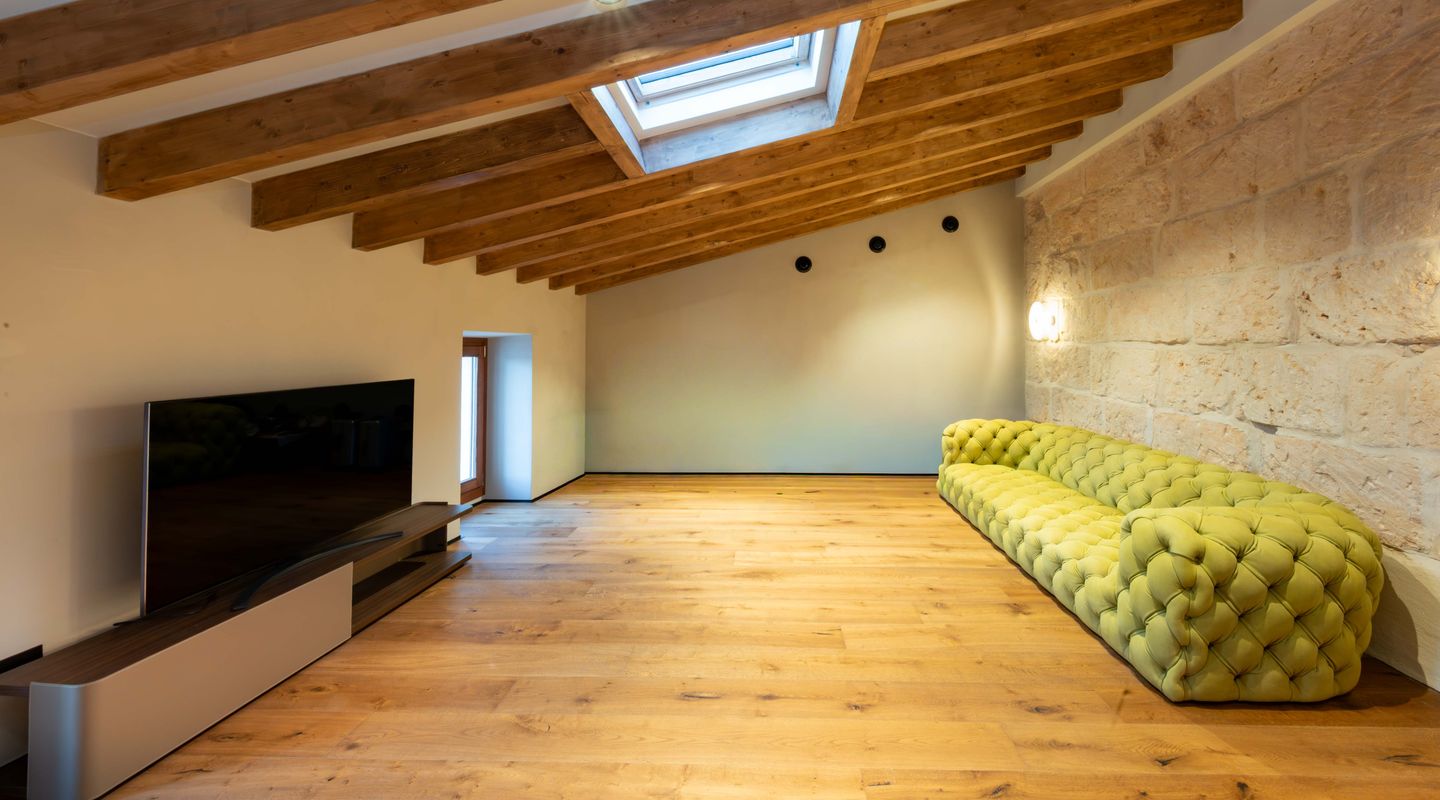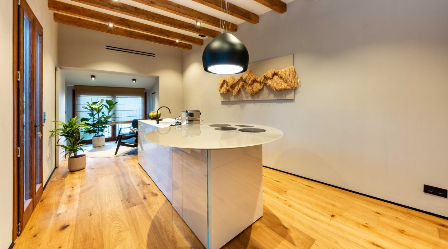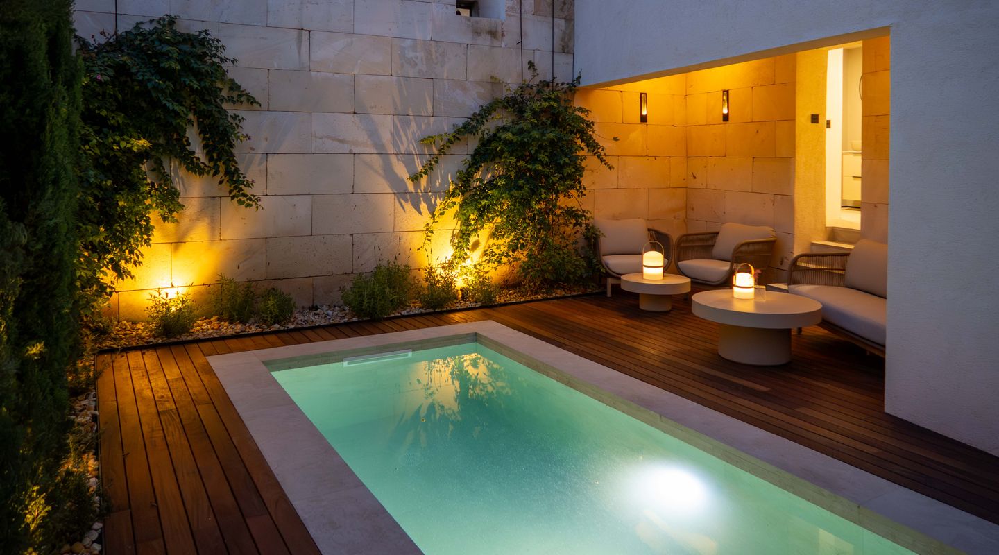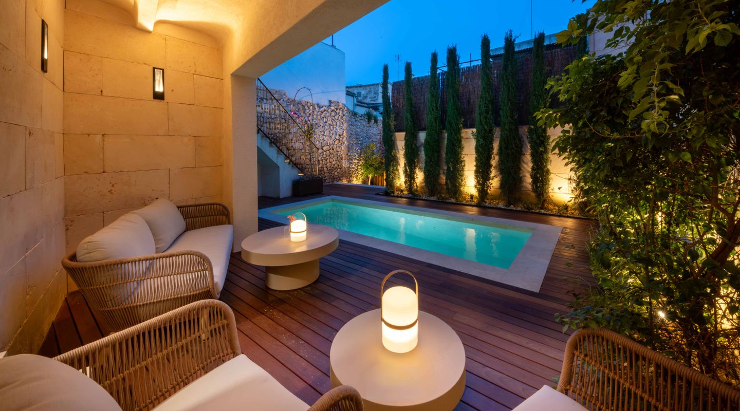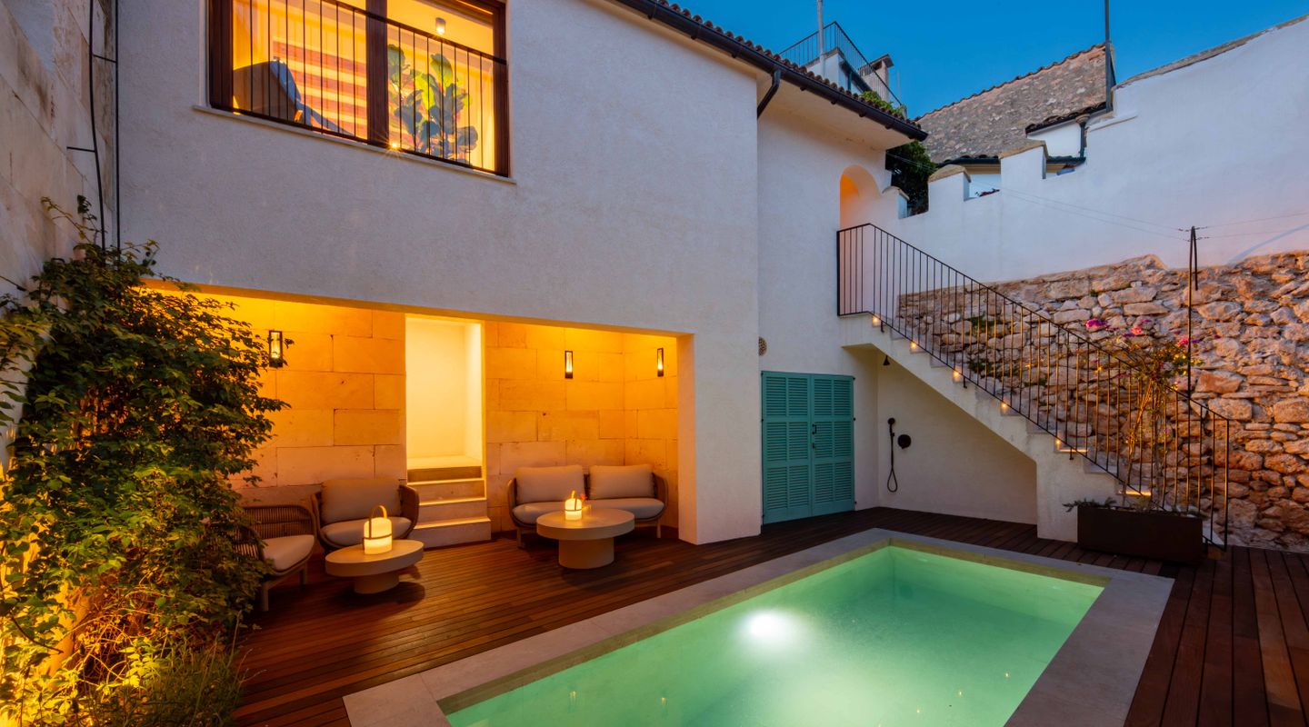 Die Außenbereiche schaffen eine private Oase im Dorfzentrum mit Swimmingpool, charmantem Esspatio, Terrasse und Balkonen mit offenem Ausblick. Eine seltene Besonderheit in dieser Lage ist die Garage für zwei Fahrzeuge, ergänzt durch großzügige Abstellflächen, Hauswirtschaftsraum, Fußbodenheizung in den Bädern sowie integrierte Klimaanlage mit Wärmepumpe.
