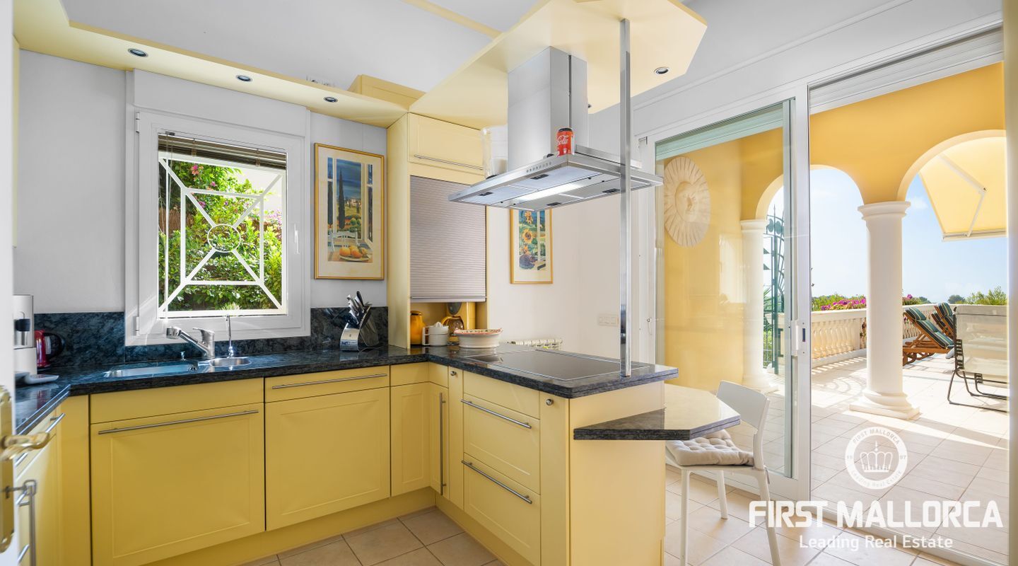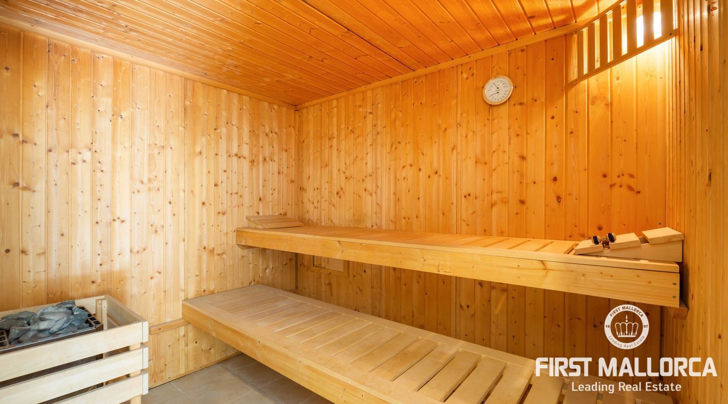 Die Hauptwohnebene verfügt über eine Küche, Büro, Waschküche, Fitnessraum, Sauna mit Dusche und TV, Gästebad und einen offenen Wohn-Essbereich mit Zugang zur teilweise überdachten Terrasse und Blick über den Infinity-Pool bis zum Meer.