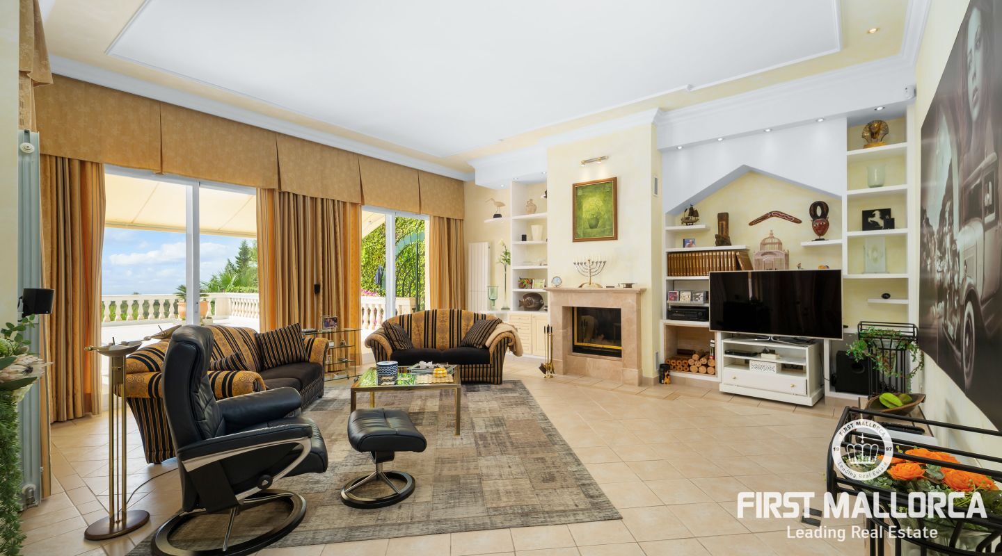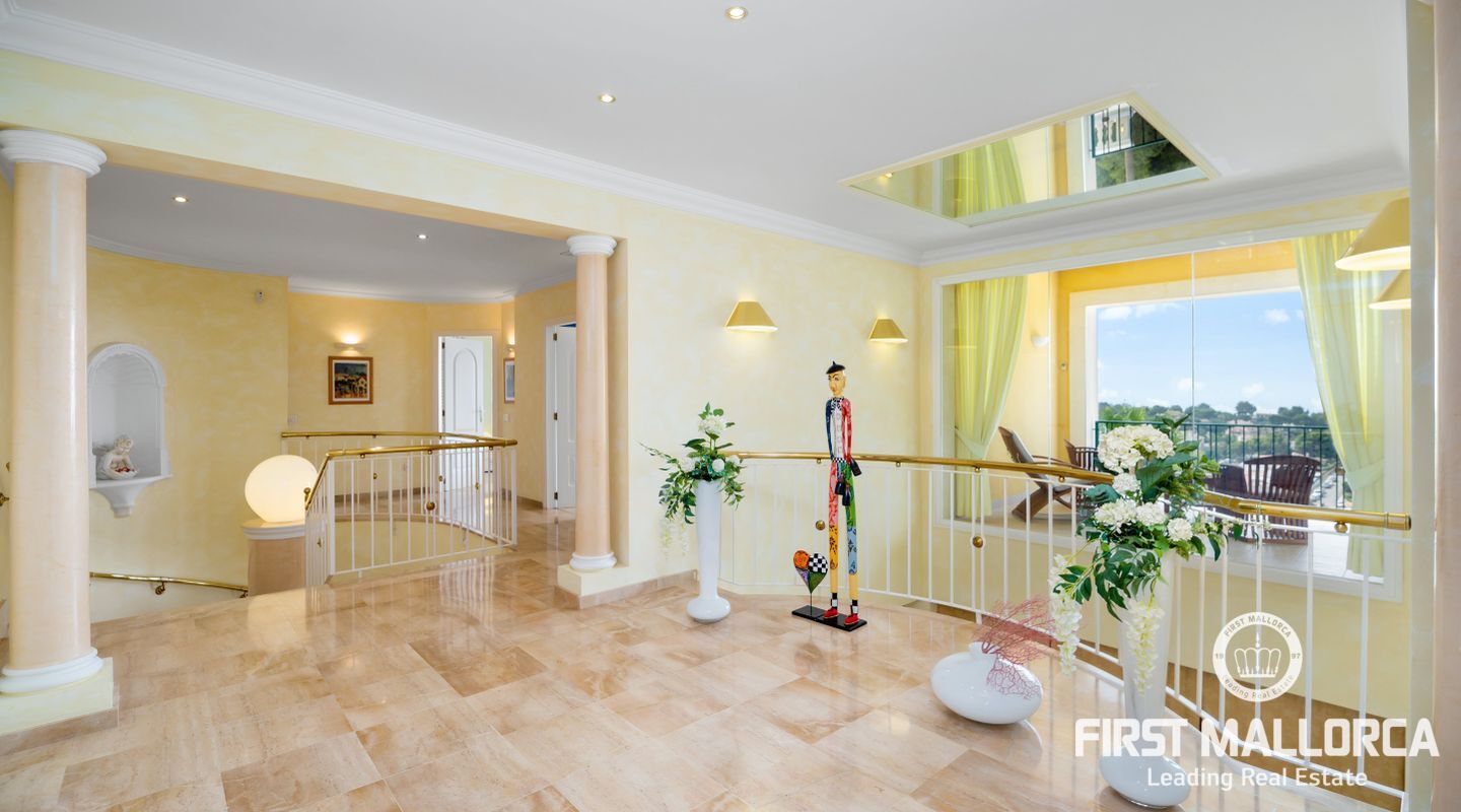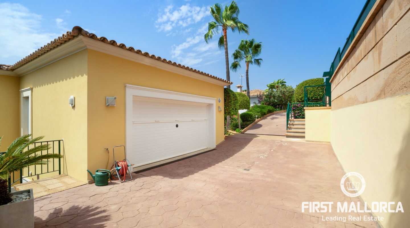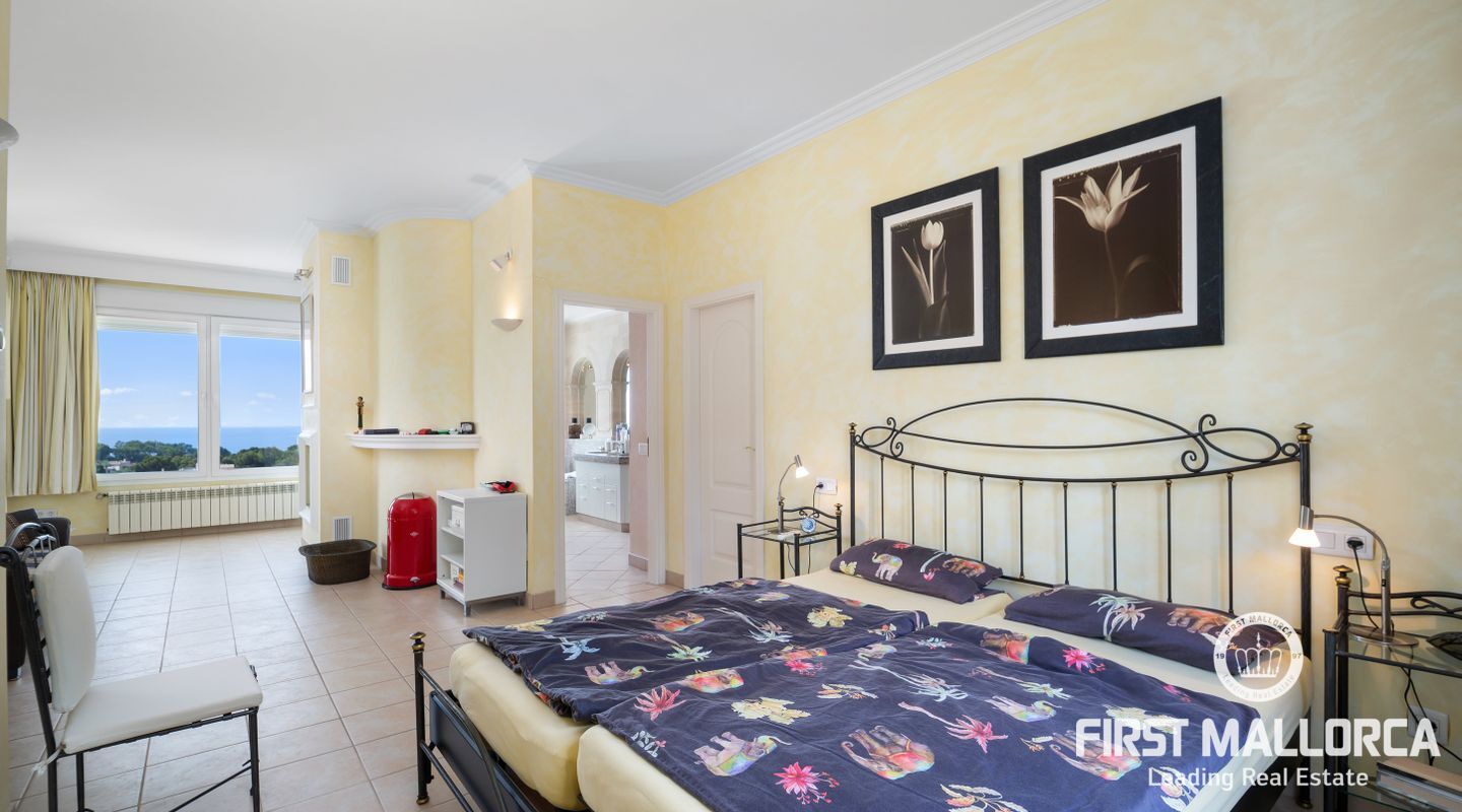 Die nach Süden ausgerichtete Villa ist in zwei Etagen unterteilt. Im Obergeschoss befinden sich der Eingang, die Garage mit direktem Zugang zum Haus, der Aufzug, das Hauptschlafzimmer mit Bad, begehbarem Kleiderschrank, Kamin und einer privaten Terrasse sowie 2 Doppel-Schlafzimmer mit Bad en suite und Zugang zu einer Terrasse. Alle Schlafzimmer bieten Meerblick.