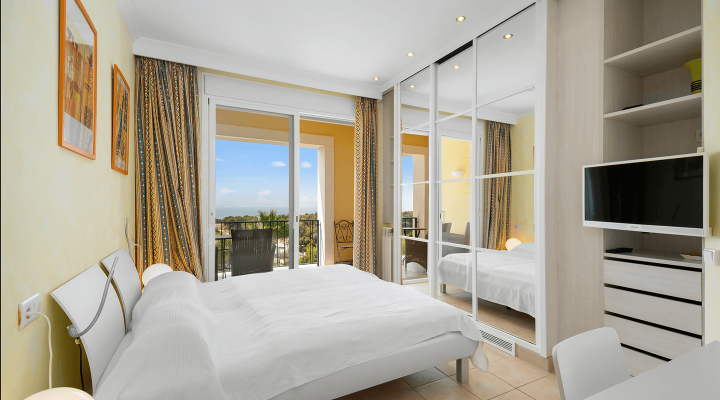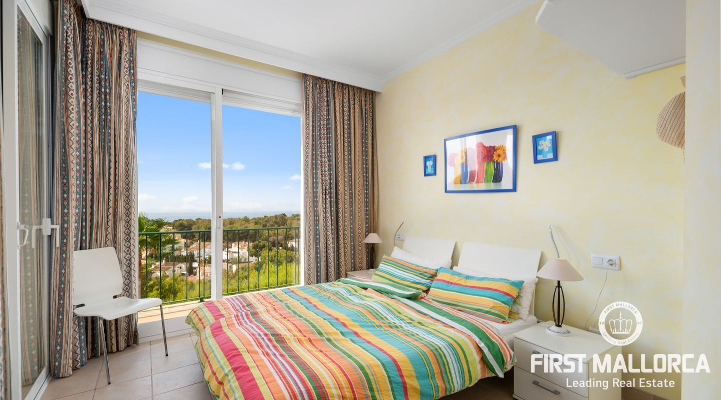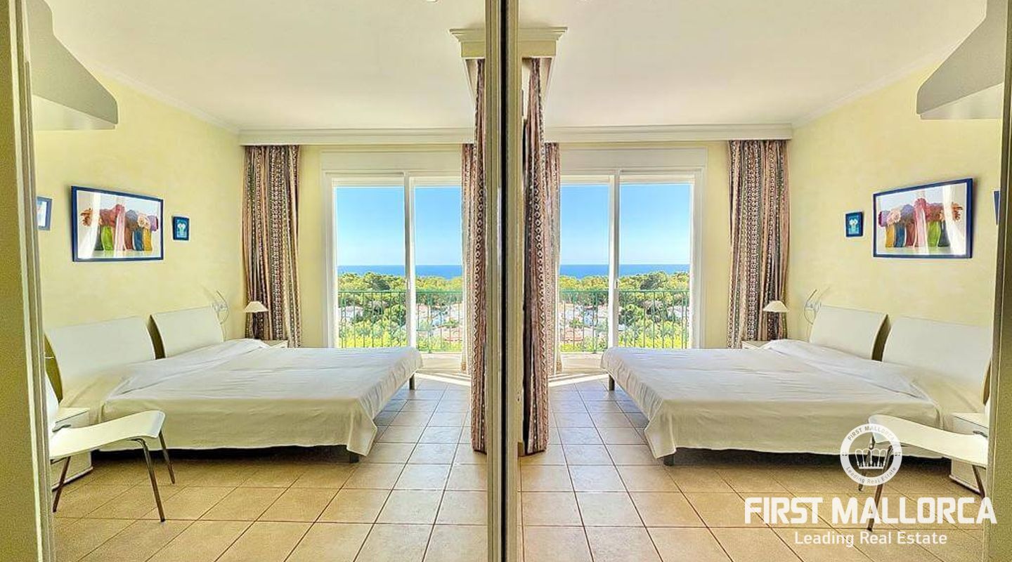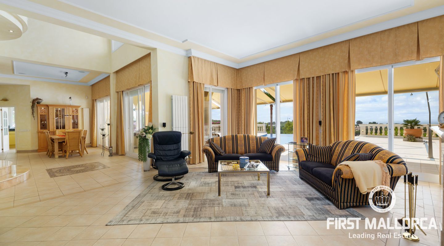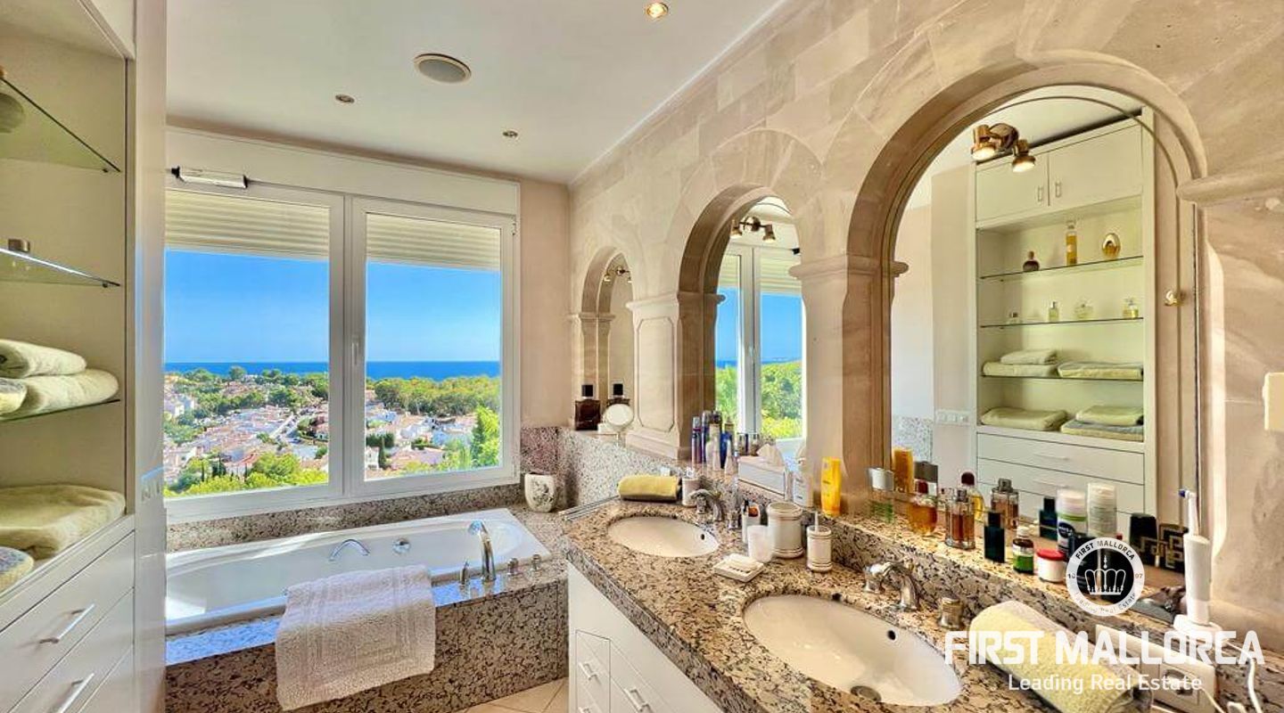 Die nach Süden ausgerichtete Villa ist in zwei Etagen unterteilt. Im Obergeschoss befinden sich der Eingang, die Garage mit direktem Zugang zum Haus, der Aufzug, das Hauptschlafzimmer mit Bad, begehbarem Kleiderschrank, Kamin und einer privaten Terrasse sowie 2 Doppel-Schlafzimmer mit Bad en suite und Zugang zu einer Terrasse. Alle Schlafzimmer bieten Meerblick.