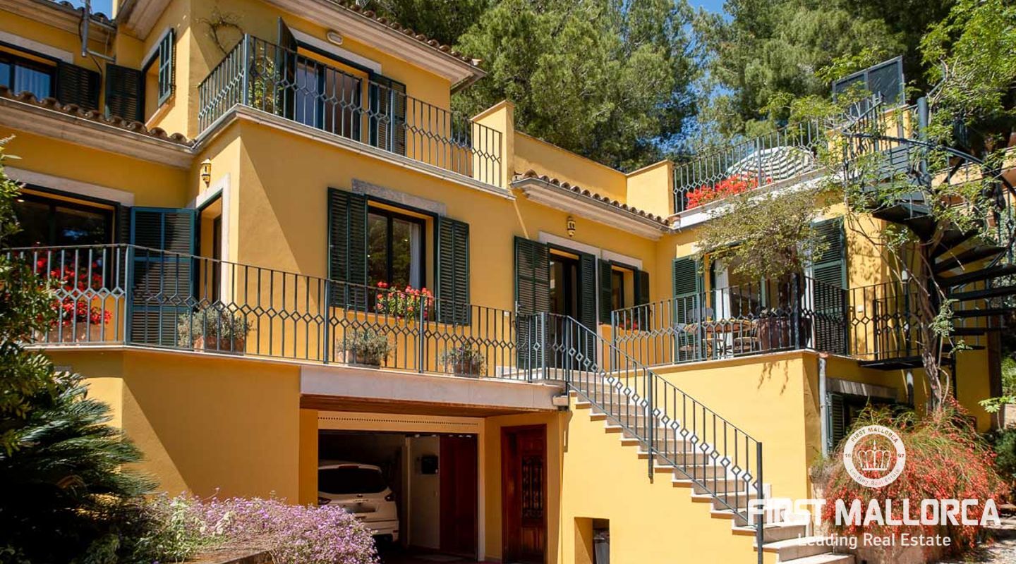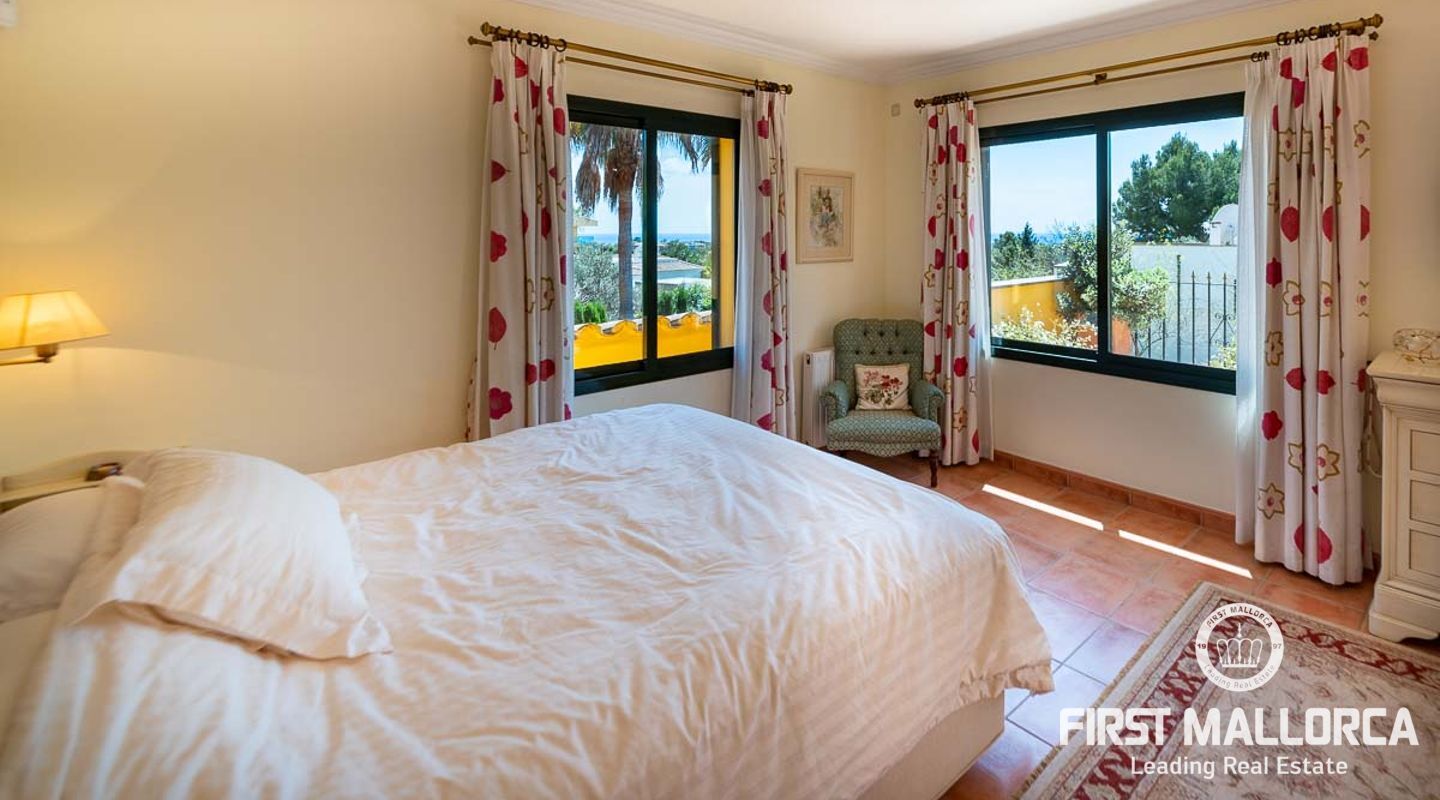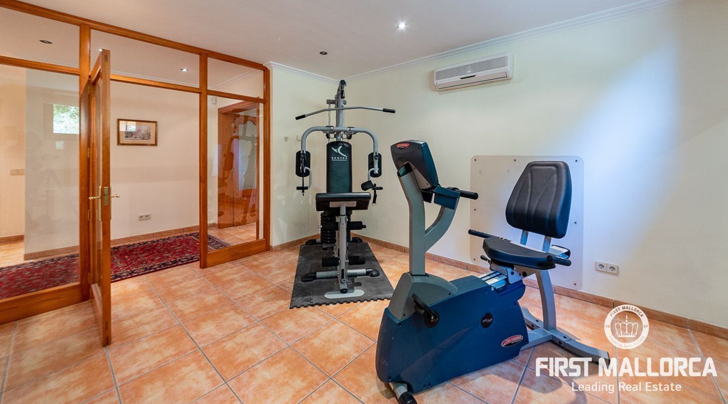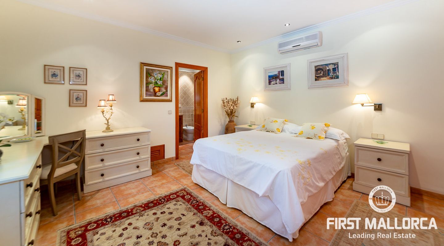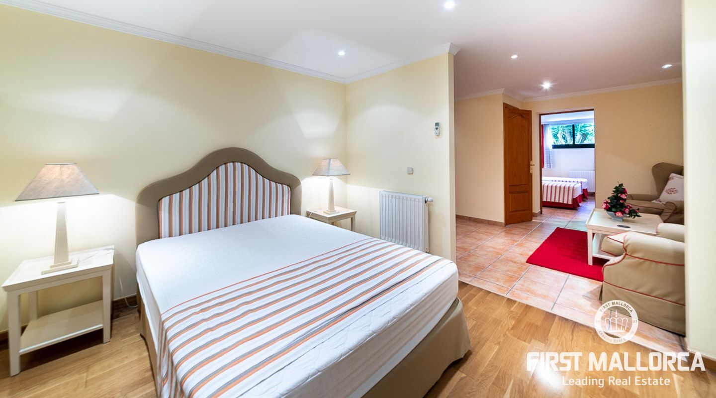 Dieses weitläufige Anwesen mit teilweisem Meerblick genießt eine privilegierte Lage in der Nähe des Golfplatzes Royal Bendinat und befindet sich in einer der begehrtesten Gegenden Mallorcas. Die Villa ist ideal für Familien, die eine großzügige Aufteilung benötigen, um gemeinsam oder mit Freunden zu genießen, da es viel Platz mit der folgenden Aufteilung gibt; Eingang in eine Empfangshalle mit dem Wohn-/Esszimmer in der Nähe genießen einen offenen Kamin und Türen, die auf die überdachte Terrasse und schönen Garten führen. Außerdem befinden sich auf dieser Ebene die voll ausgestattete Küche im Landhausstil, ein Doppelschlafzimmer mit eigenem Bad, ein Gäste-WC und eine Verbindungstür, die in den erst kürzlich errichteten Teil des Hauses führt. Dieser Bereich verfügt über ein Doppelschlafzimmer, ein 2º-Wohnzimmer mit Terrasse und eine Treppe, die hinunter in die untere Ebene führt, wo sich ein Gästeapartment mit zwei Schlafzimmern, einer Kochnische und einem Wohnzimmer, ein Fitnessraum, ein Weinkeller, eine Waschküche, ein großes Lager und die Garage befinden. Die obere Ebene des Anwesens besteht aus einem Hauptschlafzimmer mit eigenem Bad, begehbarem Kleiderschrank und einer privaten offenen Terrasse. Zusätzlich gibt es ein weiteres Doppelschlafzimmer mit eigenem Bad, das direkten Zugang zu einer großen Terrasse hat.