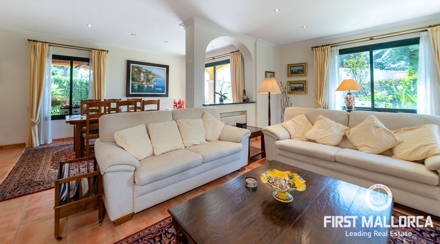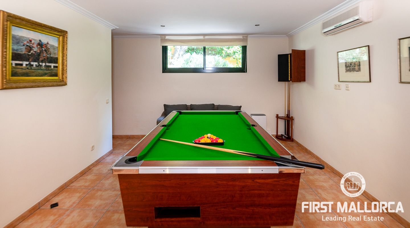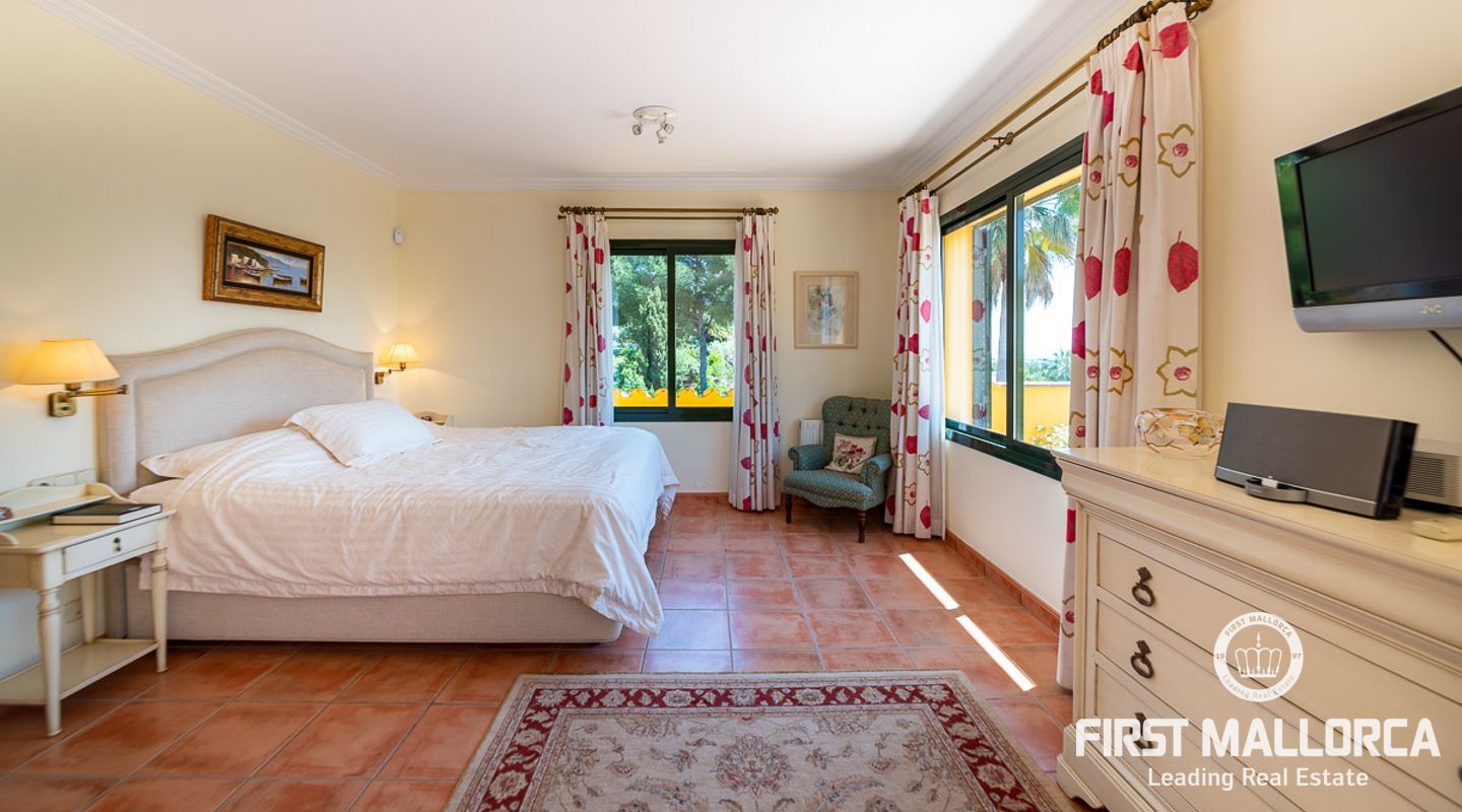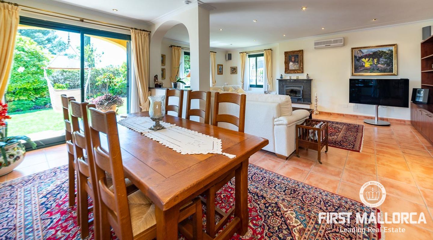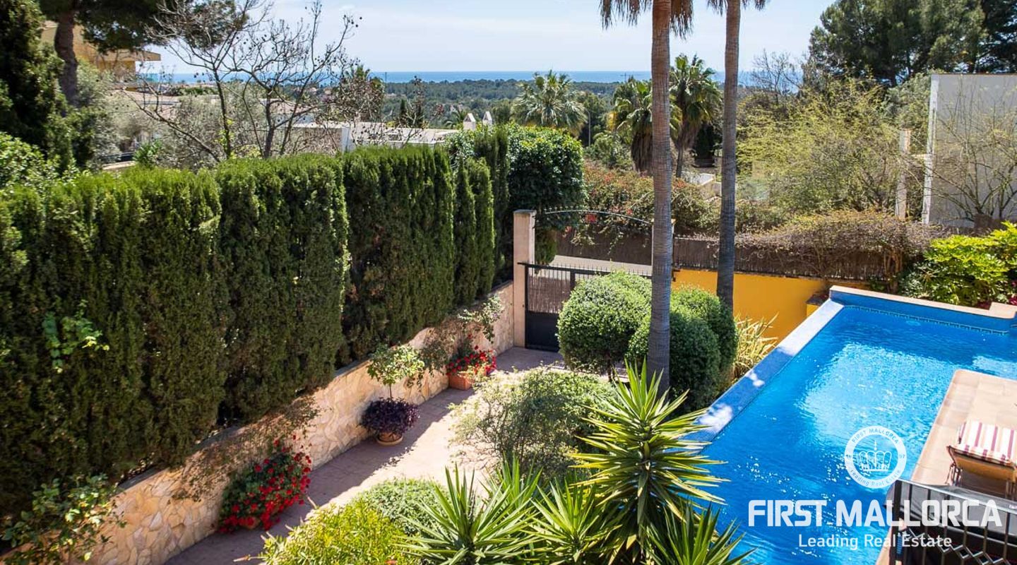 Dieses weitläufige Anwesen mit teilweisem Meerblick genießt eine privilegierte Lage in der Nähe des Golfplatzes Royal Bendinat und befindet sich in einer der begehrtesten Gegenden Mallorcas. Die Villa ist ideal für Familien, die eine großzügige Aufteilung benötigen, um gemeinsam oder mit Freunden zu genießen, da es viel Platz mit der folgenden Aufteilung gibt; Eingang in eine Empfangshalle mit dem Wohn-/Esszimmer in der Nähe genießen einen offenen Kamin und Türen, die auf die überdachte Terrasse und schönen Garten führen. Außerdem befinden sich auf dieser Ebene die voll ausgestattete Küche im Landhausstil, ein Doppelschlafzimmer mit eigenem Bad, ein Gäste-WC und eine Verbindungstür, die in den erst kürzlich errichteten Teil des Hauses führt. Dieser Bereich verfügt über ein Doppelschlafzimmer, ein 2º-Wohnzimmer mit Terrasse und eine Treppe, die hinunter in die untere Ebene führt, wo sich ein Gästeapartment mit zwei Schlafzimmern, einer Kochnische und einem Wohnzimmer, ein Fitnessraum, ein Weinkeller, eine Waschküche, ein großes Lager und die Garage befinden. Die obere Ebene des Anwesens besteht aus einem Hauptschlafzimmer mit eigenem Bad, begehbarem Kleiderschrank und einer privaten offenen Terrasse. Zusätzlich gibt es ein weiteres Doppelschlafzimmer mit eigenem Bad, das direkten Zugang zu einer großen Terrasse hat.
