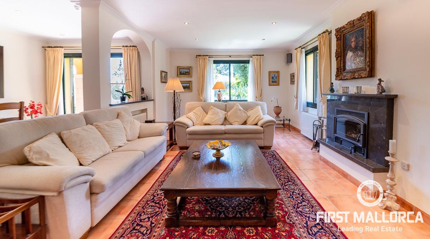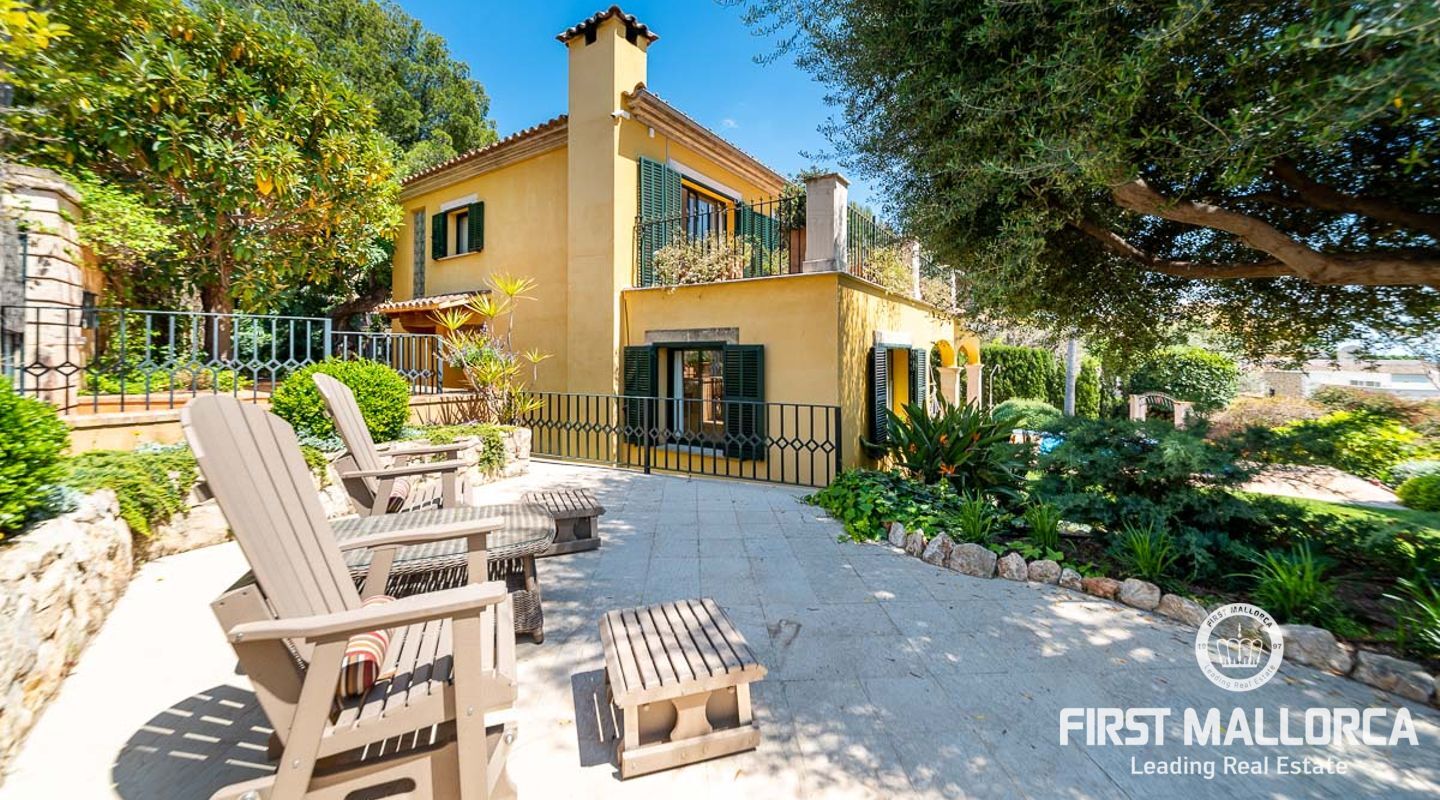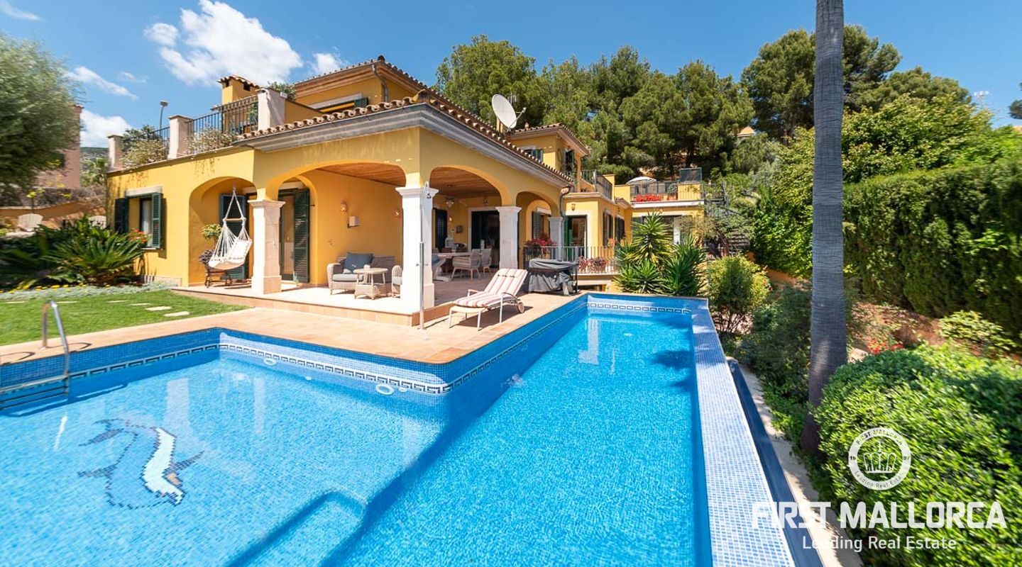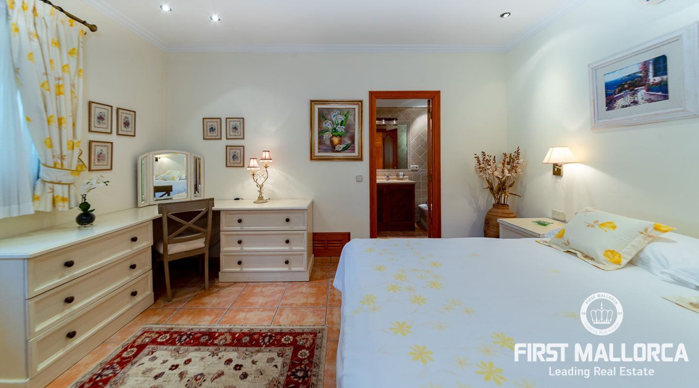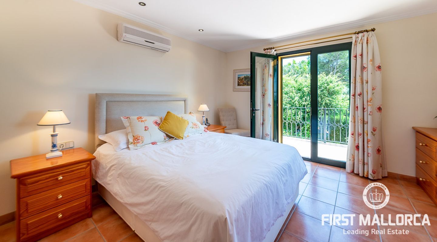 Dieses weitläufige Anwesen mit teilweisem Meerblick genießt eine privilegierte Lage in der Nähe des Golfplatzes Royal Bendinat und befindet sich in einer der begehrtesten Gegenden Mallorcas. Die Villa ist ideal für Familien, die eine großzügige Aufteilung benötigen, um gemeinsam oder mit Freunden zu genießen, da es viel Platz mit der folgenden Aufteilung gibt; Eingang in eine Empfangshalle mit dem Wohn-/Esszimmer in der Nähe genießen einen offenen Kamin und Türen, die auf die überdachte Terrasse und schönen Garten führen. Außerdem befinden sich auf dieser Ebene die voll ausgestattete Küche im Landhausstil, ein Doppelschlafzimmer mit eigenem Bad, ein Gäste-WC und eine Verbindungstür, die in den erst kürzlich errichteten Teil des Hauses führt. Dieser Bereich verfügt über ein Doppelschlafzimmer, ein 2º-Wohnzimmer mit Terrasse und eine Treppe, die hinunter in die untere Ebene führt, wo sich ein Gästeapartment mit zwei Schlafzimmern, einer Kochnische und einem Wohnzimmer, ein Fitnessraum, ein Weinkeller, eine Waschküche, ein großes Lager und die Garage befinden. Die obere Ebene des Anwesens besteht aus einem Hauptschlafzimmer mit eigenem Bad, begehbarem Kleiderschrank und einer privaten offenen Terrasse. Zusätzlich gibt es ein weiteres Doppelschlafzimmer mit eigenem Bad, das direkten Zugang zu einer großen Terrasse hat.