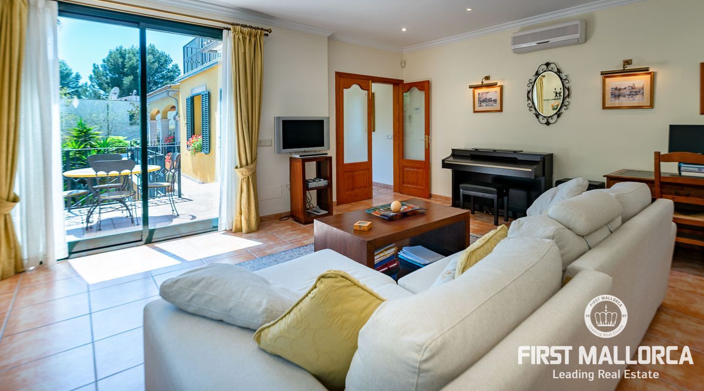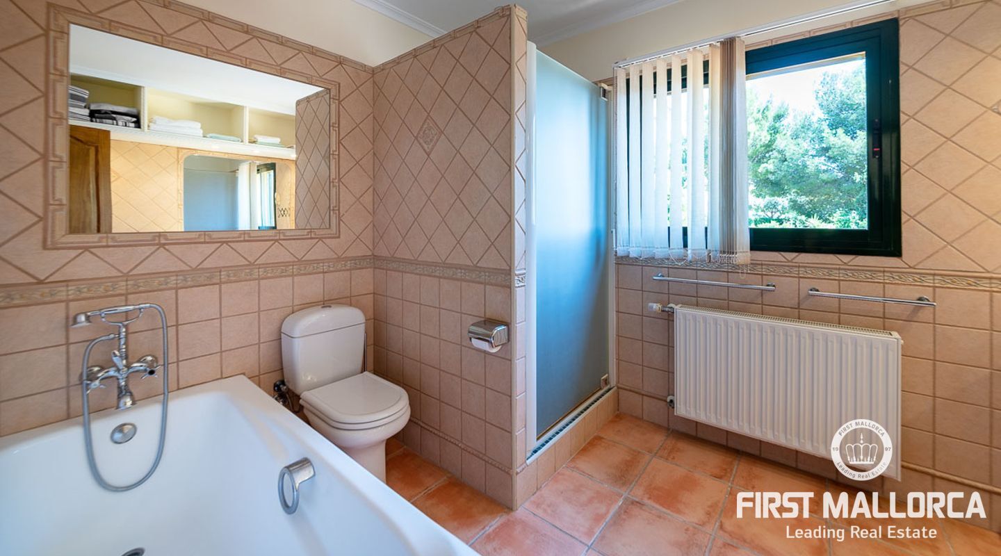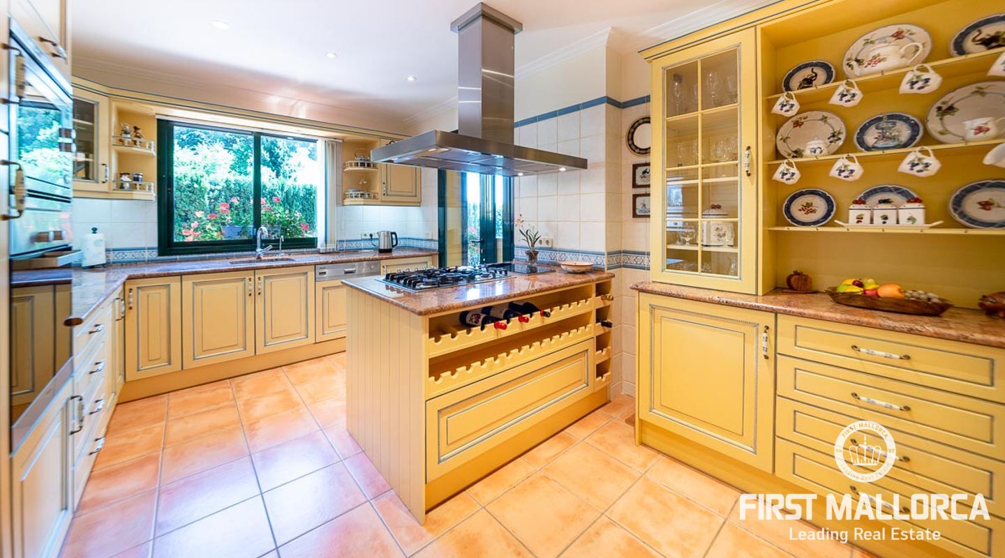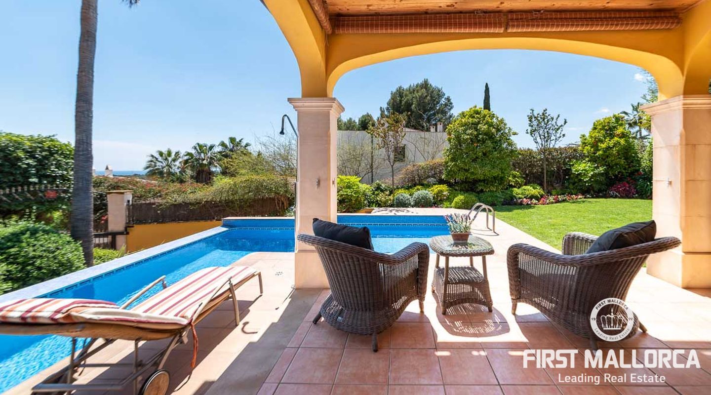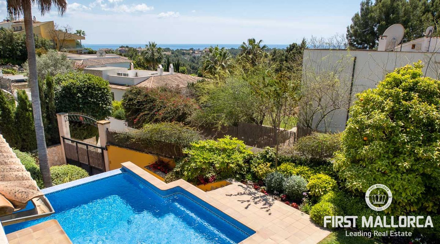 Dieses weitläufige Anwesen mit teilweisem Meerblick genießt eine privilegierte Lage in der Nähe des Golfplatzes Royal Bendinat und befindet sich in einer der begehrtesten Gegenden Mallorcas. Die Villa ist ideal für Familien, die eine großzügige Aufteilung benötigen, um gemeinsam oder mit Freunden zu genießen, da es viel Platz mit der folgenden Aufteilung gibt; Eingang in eine Empfangshalle mit dem Wohn-/Esszimmer in der Nähe genießen einen offenen Kamin und Türen, die auf die überdachte Terrasse und schönen Garten führen. Außerdem befinden sich auf dieser Ebene die voll ausgestattete Küche im Landhausstil, ein Doppelschlafzimmer mit eigenem Bad, ein Gäste-WC und eine Verbindungstür, die in den erst kürzlich errichteten Teil des Hauses führt. Dieser Bereich verfügt über ein Doppelschlafzimmer, ein 2º-Wohnzimmer mit Terrasse und eine Treppe, die hinunter in die untere Ebene führt, wo sich ein Gästeapartment mit zwei Schlafzimmern, einer Kochnische und einem Wohnzimmer, ein Fitnessraum, ein Weinkeller, eine Waschküche, ein großes Lager und die Garage befinden. Die obere Ebene des Anwesens besteht aus einem Hauptschlafzimmer mit eigenem Bad, begehbarem Kleiderschrank und einer privaten offenen Terrasse. Zusätzlich gibt es ein weiteres Doppelschlafzimmer mit eigenem Bad, das direkten Zugang zu einer großen Terrasse hat.
