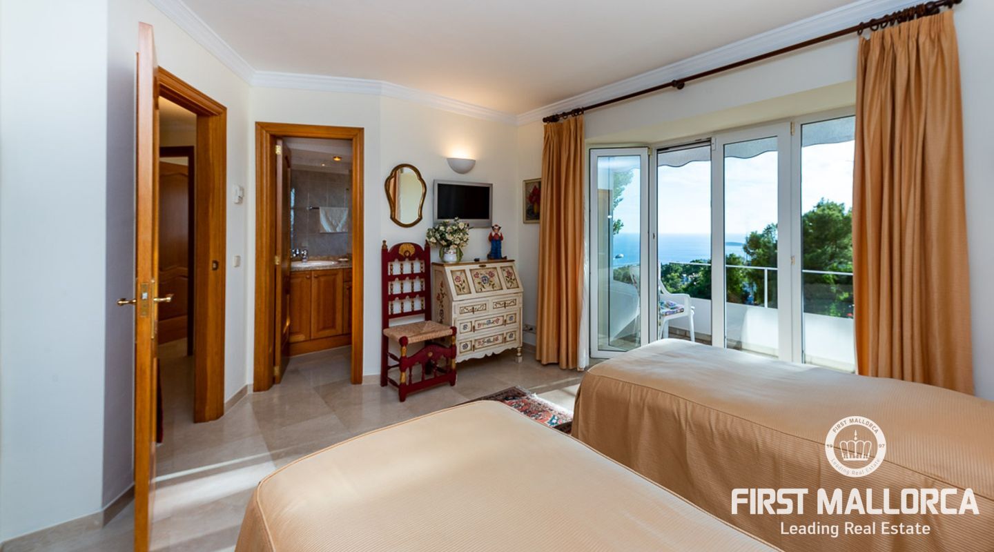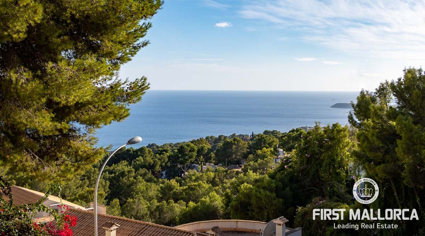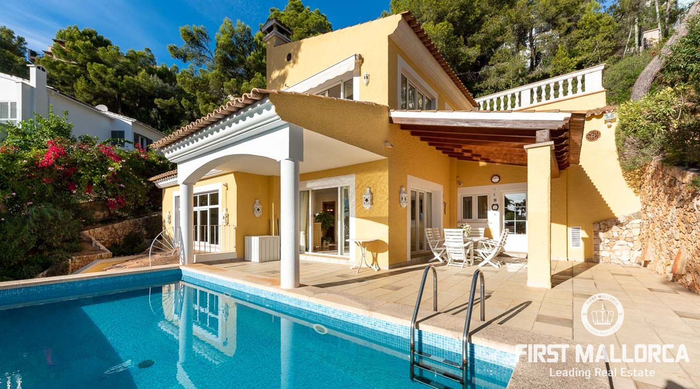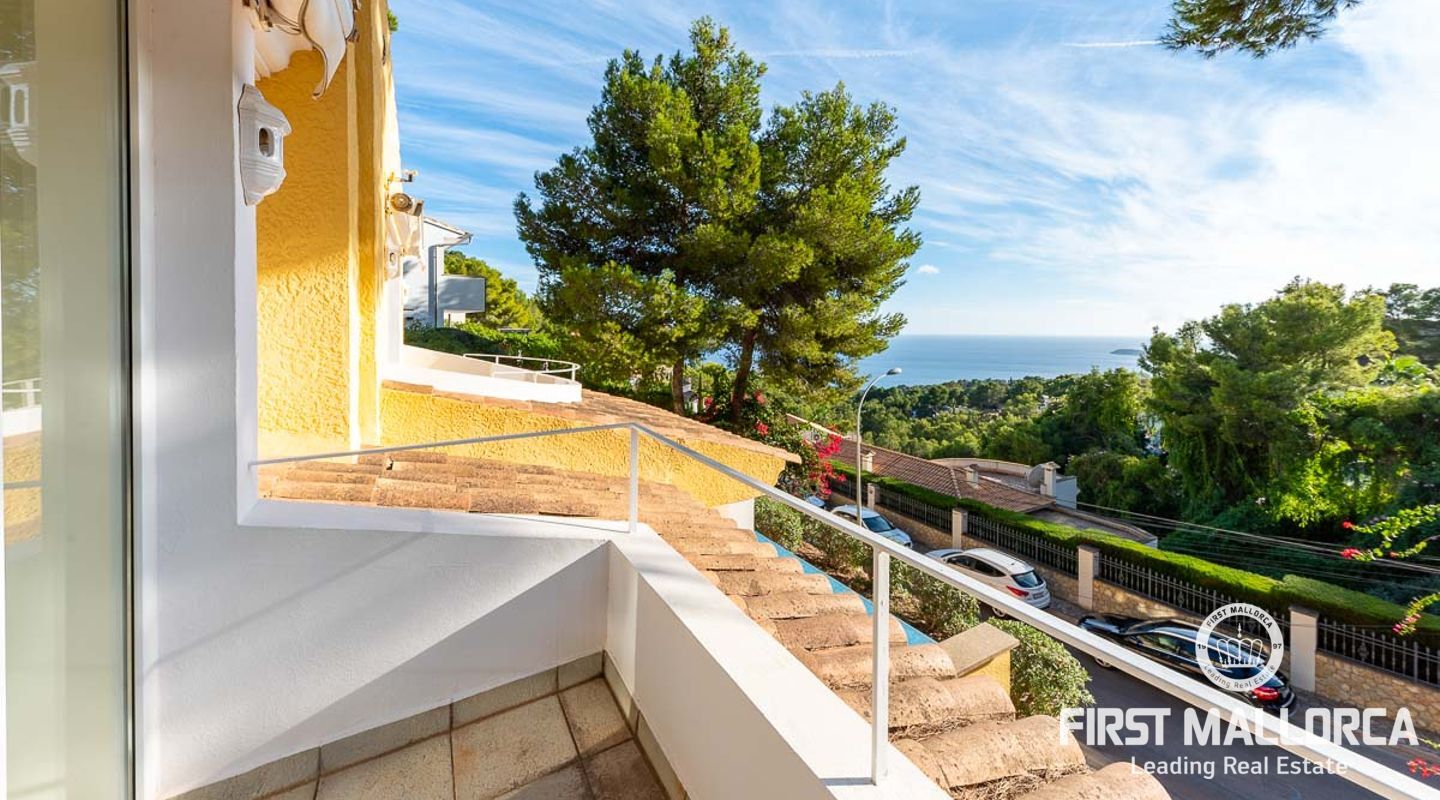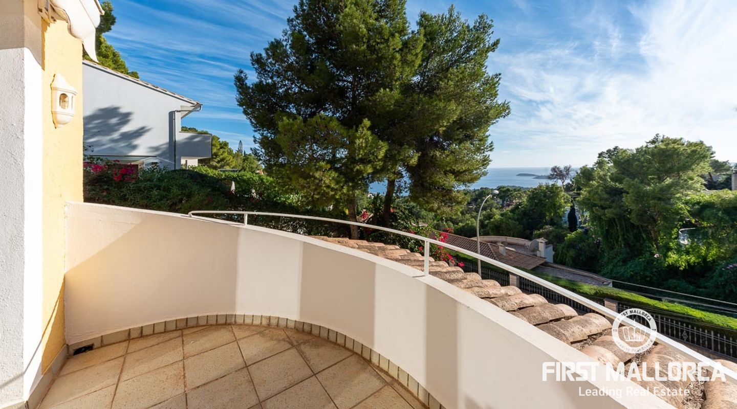 Diese Villa im mediterranen Stil verfügt über Meerblick und Südausrichtung. Sie befindet sich oberhalb des noblen Hafen von Puerto Portals in der Villenurbanisation Costa d'en Blanes. Die Immobilie ist in gepflegtem Zustand und lädt mit ihren großzügigen Terrassen mit Meerblick, privatem Pool und schönem Garten dazu ein, das mediterrane Klima und die Sonne Mallorcas zu genießen. Im Erdgeschoss schließt der offene Wohn- und Essbereich direkt an die Poolterrasse an, wodurch der Übergang zwischen Innen- und Außen fließend wird. Auf dieser Ebene gibt es zudem ein Schlafzimmer mit eigenem Bad. Im oberen Stockwerk gibt es 3 weitere Schlafzimmer, alle mit Bad en suite.