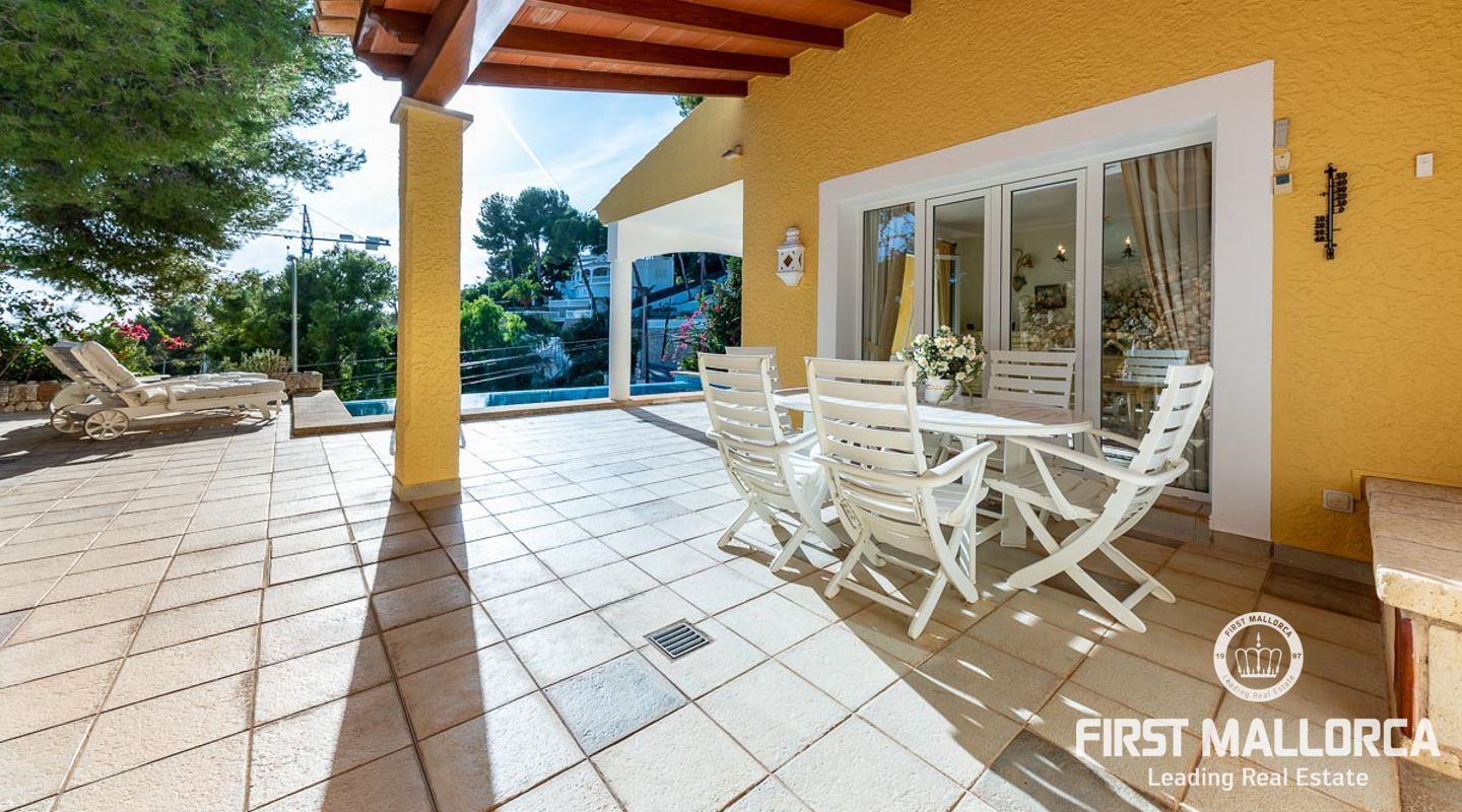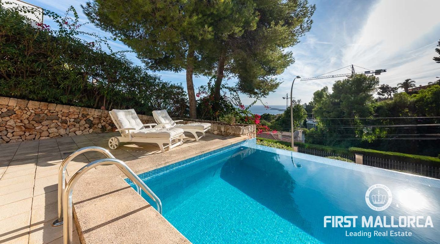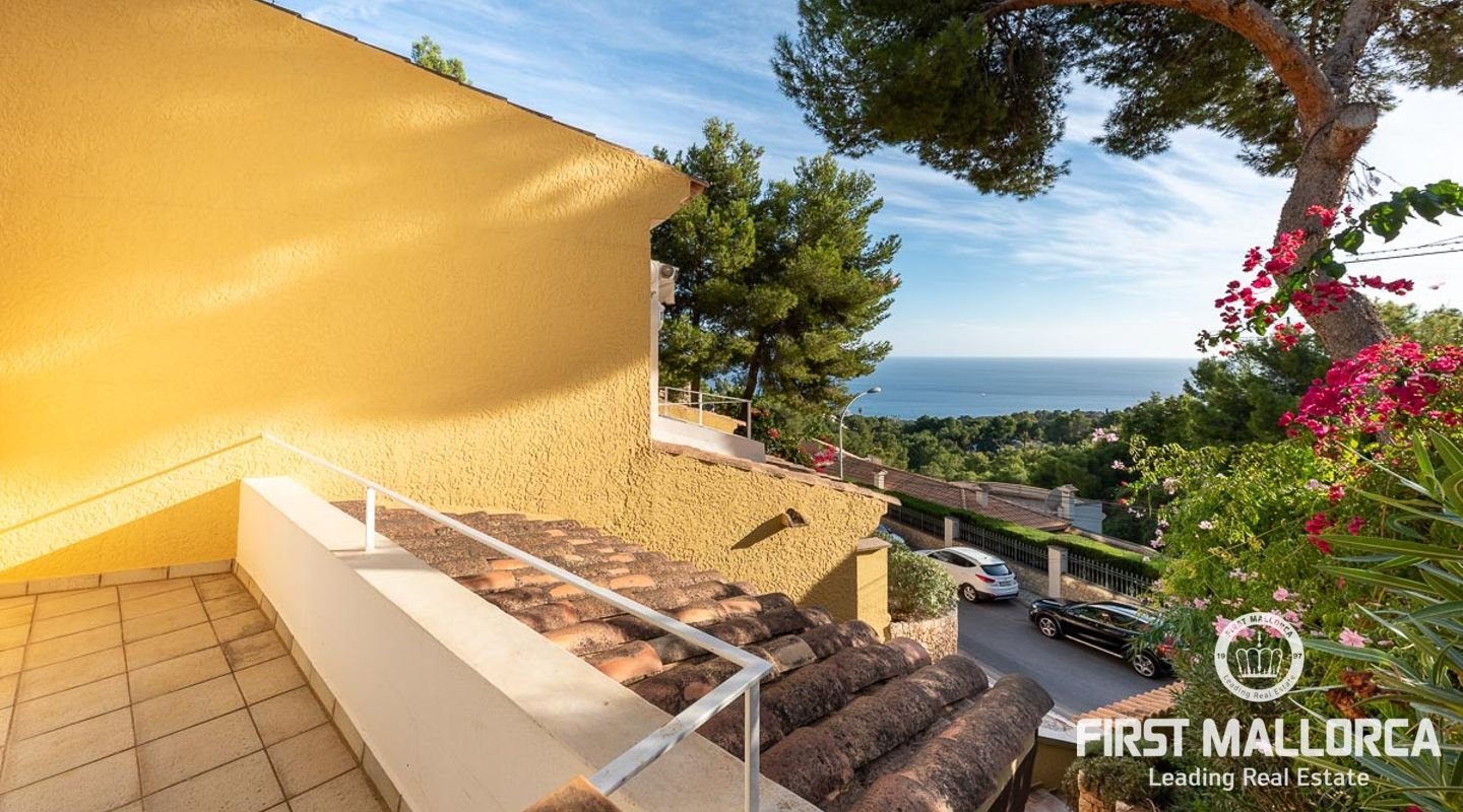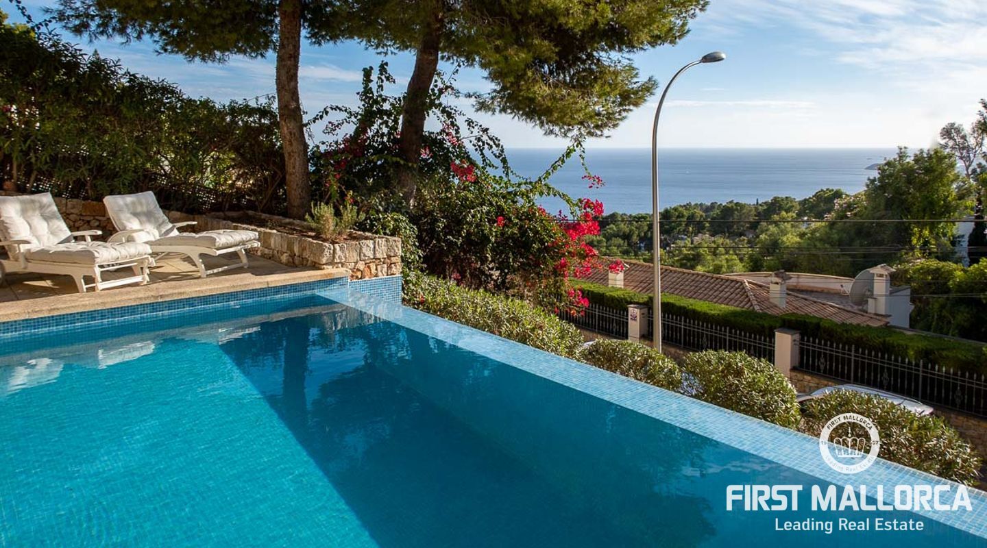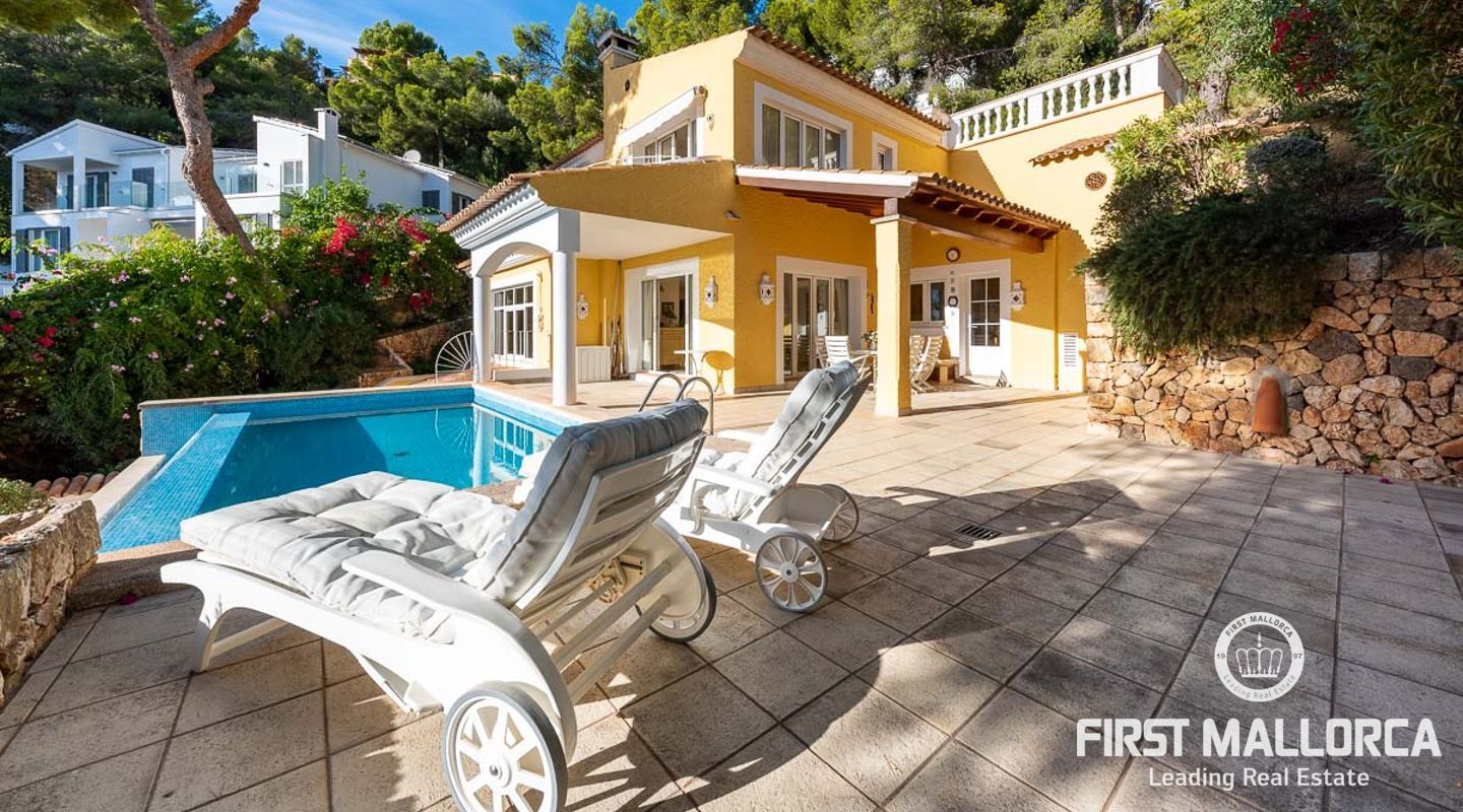 Diese Villa im mediterranen Stil verfügt über Meerblick und Südausrichtung. Sie befindet sich oberhalb des noblen Hafen von Puerto Portals in der Villenurbanisation Costa d'en Blanes. Die Immobilie ist in gepflegtem Zustand und lädt mit ihren großzügigen Terrassen mit Meerblick, privatem Pool und schönem Garten dazu ein, das mediterrane Klima und die Sonne Mallorcas zu genießen. Im Erdgeschoss schließt der offene Wohn- und Essbereich direkt an die Poolterrasse an, wodurch der Übergang zwischen Innen- und Außen fließend wird. Auf dieser Ebene gibt es zudem ein Schlafzimmer mit eigenem Bad. Im oberen Stockwerk gibt es 3 weitere Schlafzimmer, alle mit Bad en suite.
