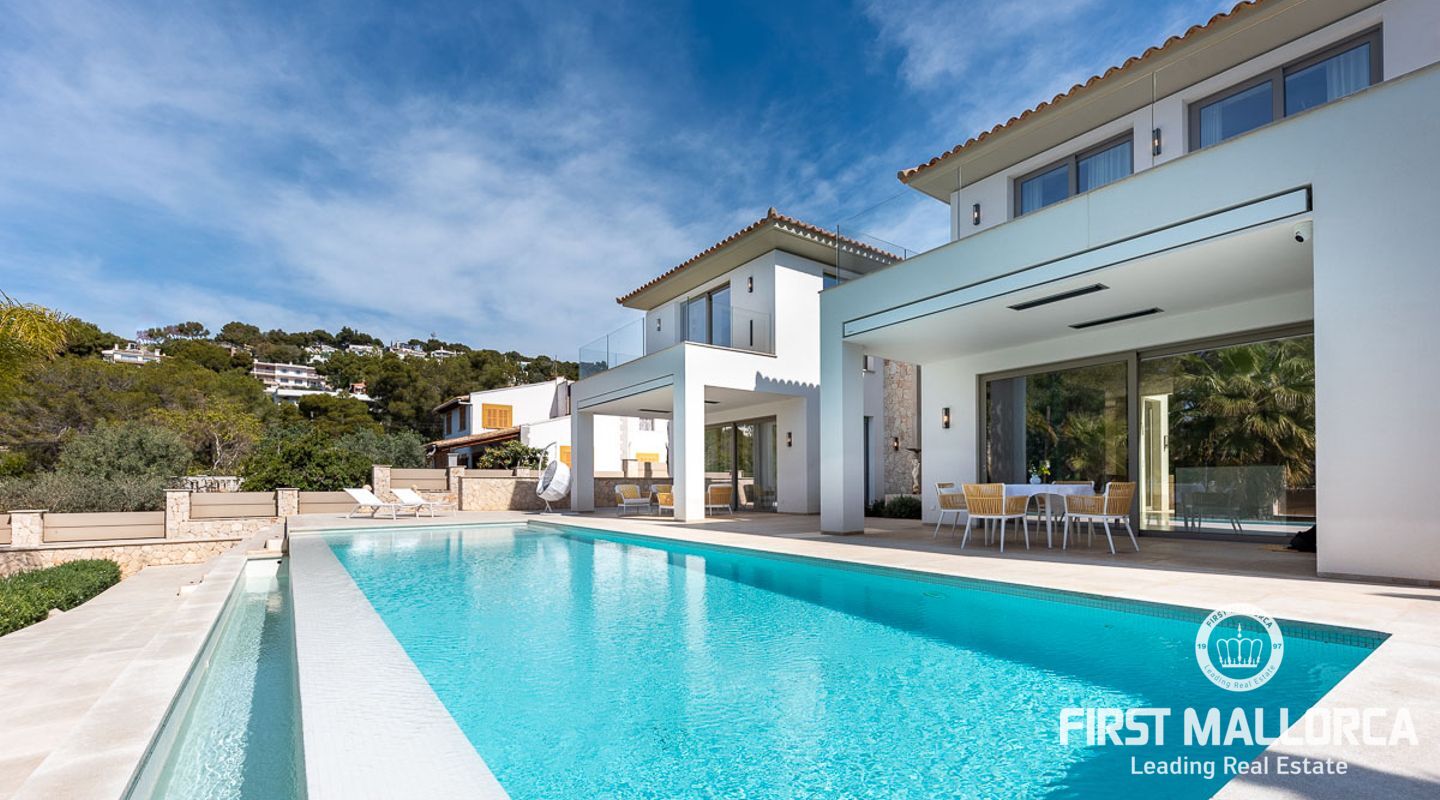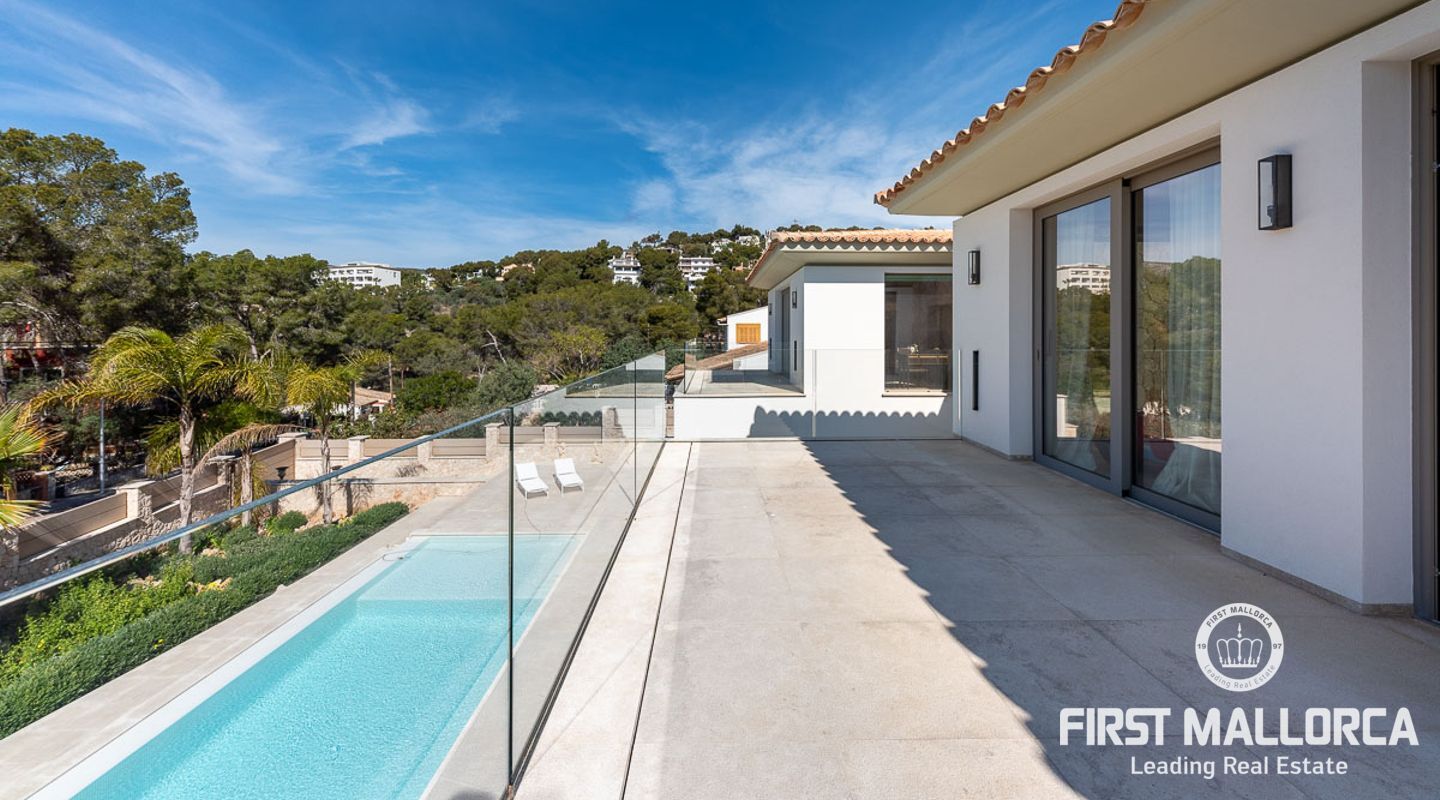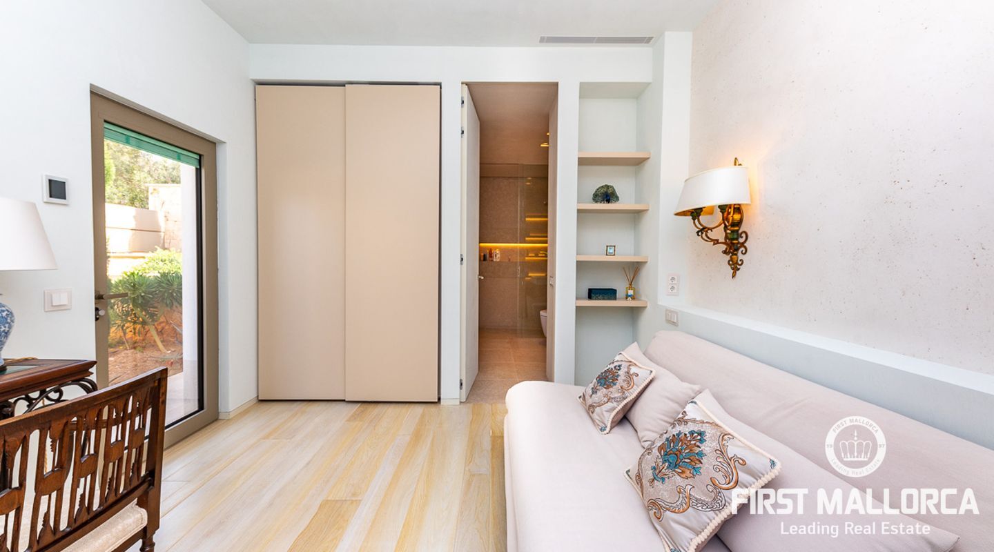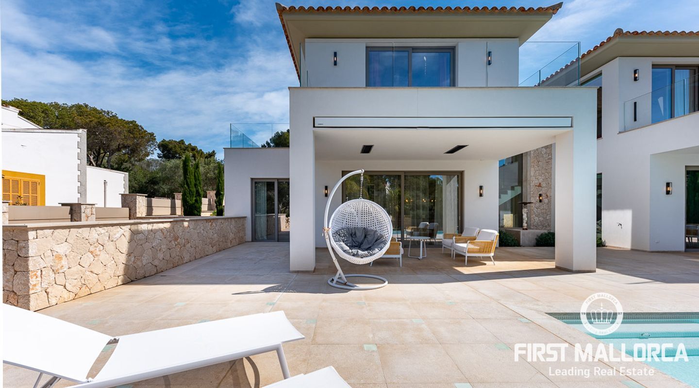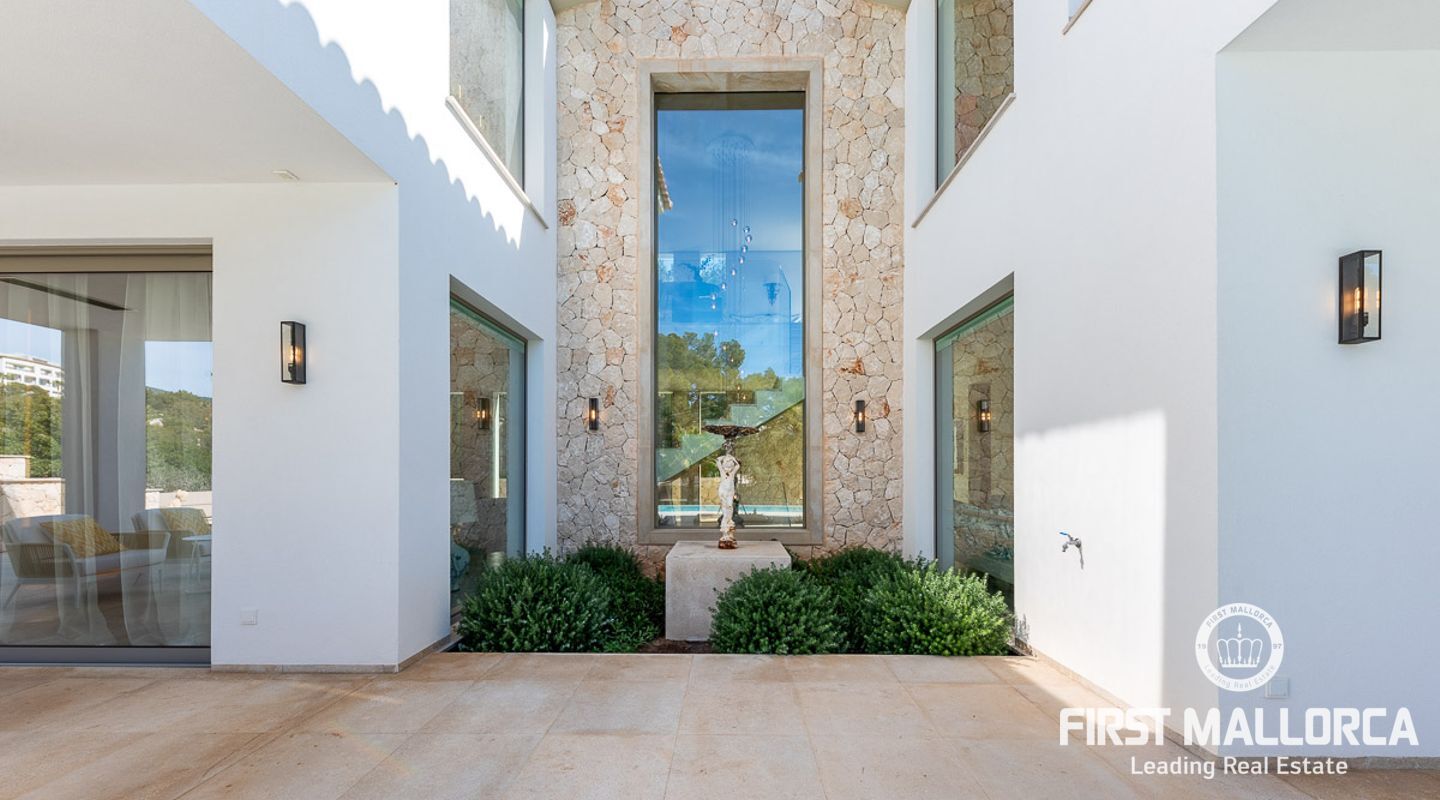 Diese in 2020 gebaute Villa befindet sich in Lauflage zu einem der schönsten Strände im Südwesten, sowie Hafen von Puerto Portals und dem kleinen Einkaufsort Portals Nous. Das angebotene Objekt wurde mit viel Naturstein im Aussenbereich gefertigt und fügt sich harmonisch in die mediterrane Umgebung ein. Nicht nur die beste Technik, sondern auch viele charmante und hochwertige Details wie spezielles Holzparkett von Vassaletti, eine Küche von Birgit Müller sowie speziell veredelte Wandflächen, sind bei der Realiserung dieses Projekts zum Einsatz gekommen. Auf einem südlich ausgerichteteten Grundstück bietet diese Villa auf drei Etagen ca. 520m2 bebaute Fläche. Im UG mit direktem Zugang zum Haus liegt die Tiefgarage mit Platz für 4 PKW, ebenfalls befindet sich hier ein grosser HWR. Über eine Treppe gelangt man in den Hauptbereich mit grosser Luxus Einbau und Essbereich, das Wohnzimmer ist separat angelegt, desweiteren gibt es hier ein Gäste WC. Über grosse Schiebtetüren erreicht man den Aussenbereich der teilweise überdacht ist. Hier gibt es auch den Zugang zum separaten Gästeschlafzimmer mit eigenem Bad. Der 12 x4 grosse Swimmingpool lädt zum Baden ein, Sonne gibt es den ganzen Tag, Sommer wie Winter. Im ersten OG liegen das Hauptschlafzimmer sowie zwei Gästeschlafzimmer, die sich ein Bad teilen. Ausstattungsmerkmale dieser mediterranen Villa sind: Naturstein Böden, Echtholz Parkett, Fussbodenheizung, Klimaanlage warm/kalt, Gaskamin, Beschattungssyteme, Domotic System, Alarmanlage, Hauswirtschaftsraum, Speisekammer. Wenn Sie eine perfekte Familienvilla mit unmittelbarem Strandzugang suchen, hier sind es nur wenige Minuten zu Fuss bis ans Wasser. Bitte zögern Sie nicht unser freundliches Firrst Mallorca Verkaufsteam wegen weiterer Details oder zwecks Terminierung einer Besichtigung zu kontaktieren.