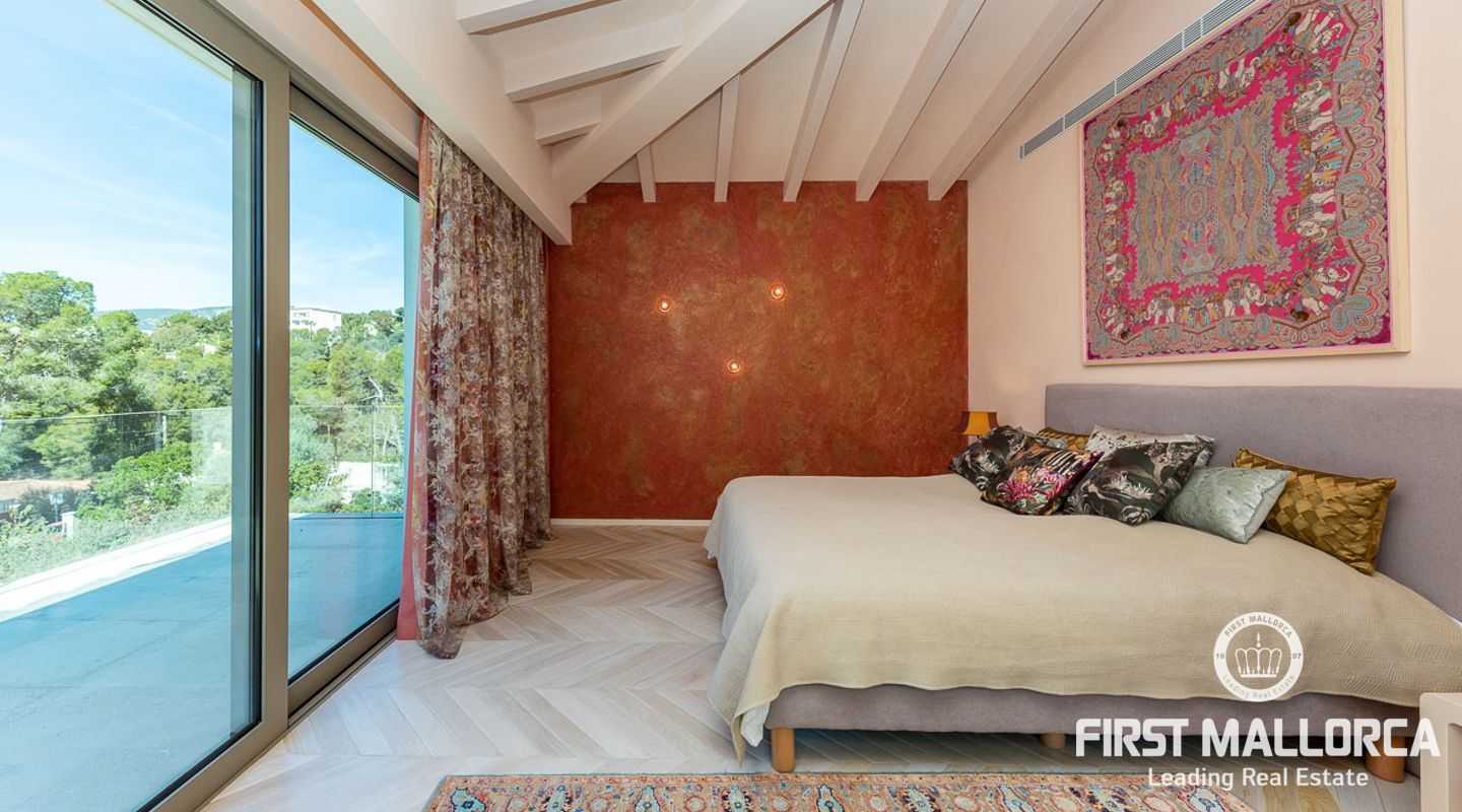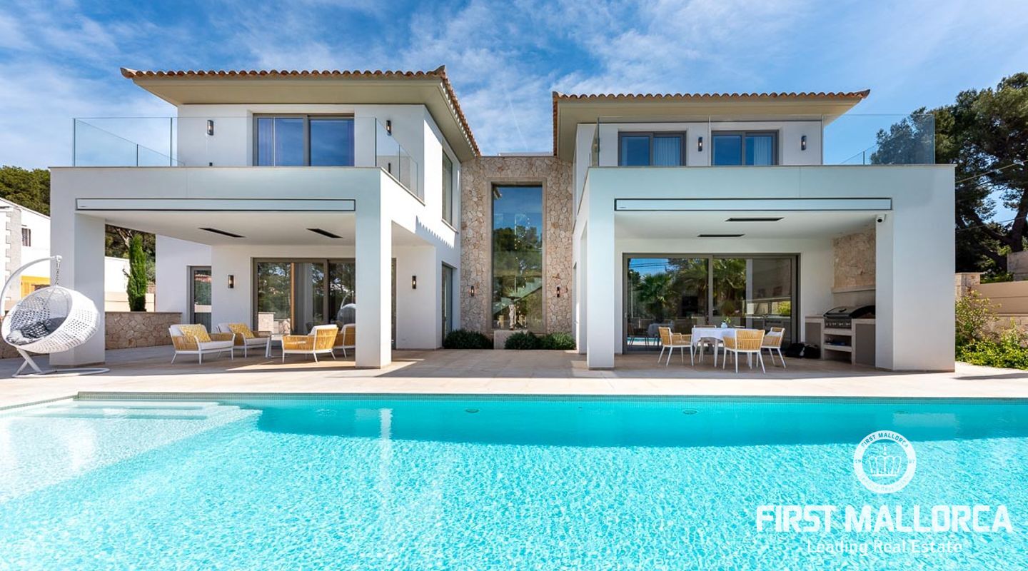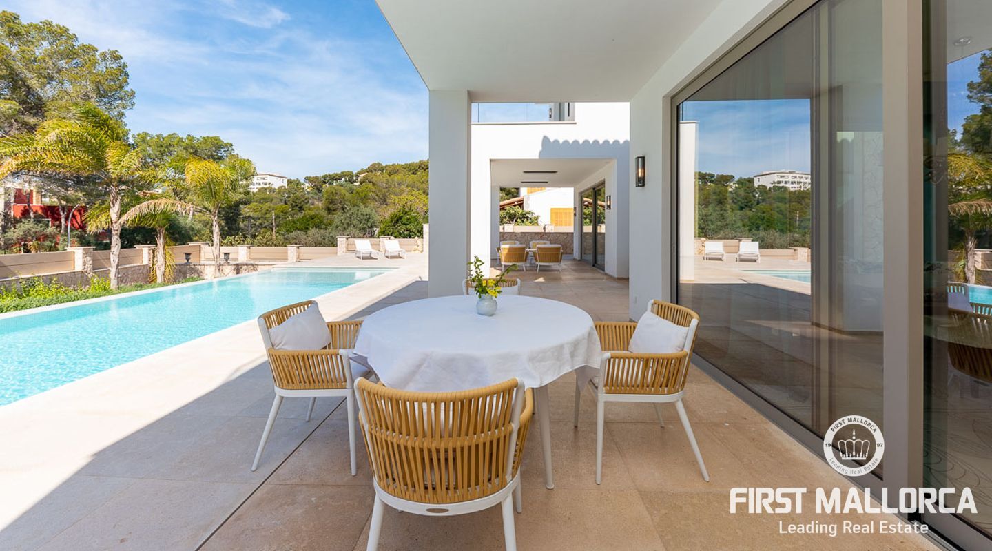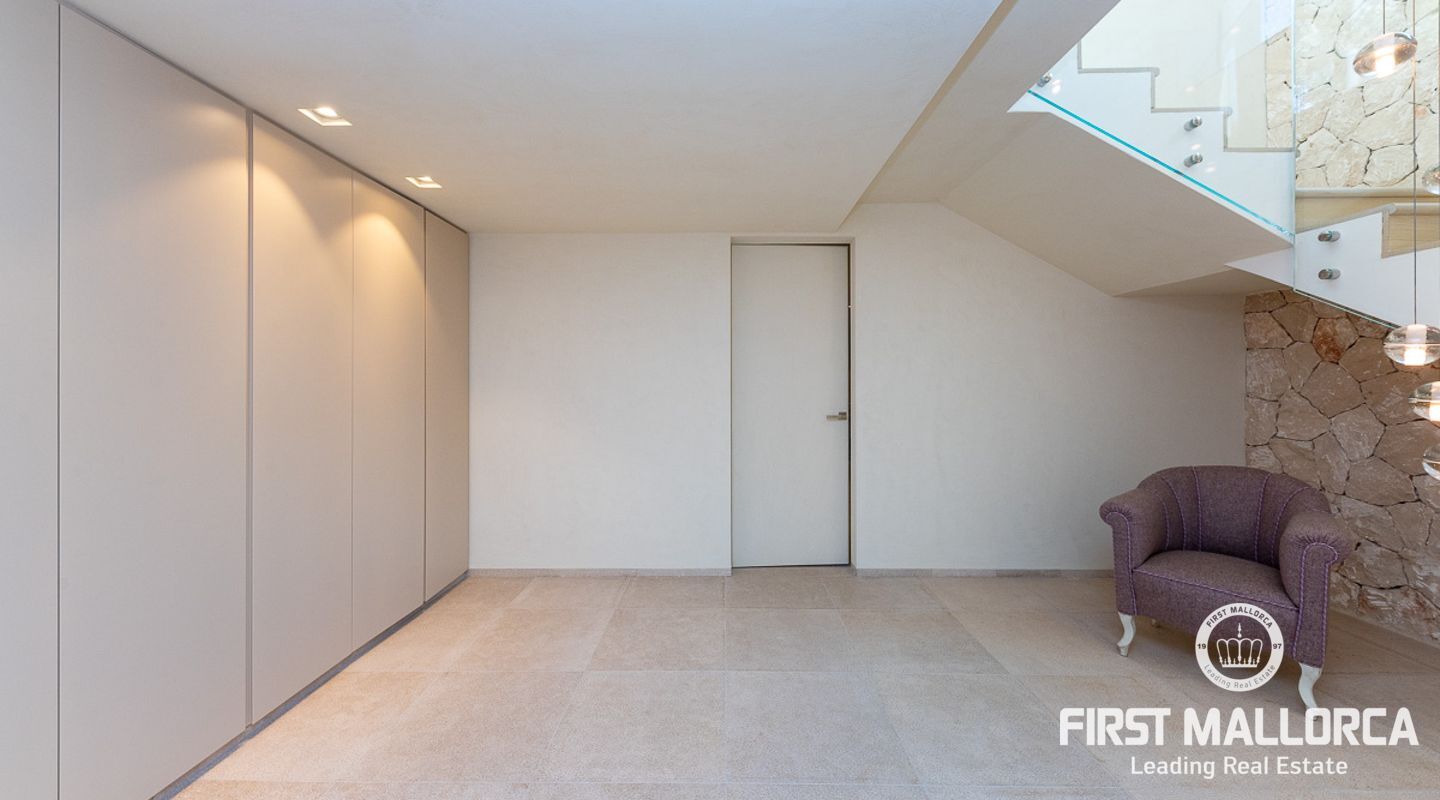 Diese in 2020 gebaute Villa befindet sich in Lauflage zu einem der schönsten Strände im Südwesten, sowie Hafen von Puerto Portals und dem kleinen Einkaufsort Portals Nous. Das angebotene Objekt wurde mit viel Naturstein im Aussenbereich gefertigt und fügt sich harmonisch in die mediterrane Umgebung ein. Nicht nur die beste Technik, sondern auch viele charmante und hochwertige Details wie spezielles Holzparkett von Vassaletti, eine Küche von Birgit Müller sowie speziell veredelte Wandflächen, sind bei der Realiserung dieses Projekts zum Einsatz gekommen. Auf einem südlich ausgerichteteten Grundstück bietet diese Villa auf drei Etagen ca. 520m2 bebaute Fläche. Im UG mit direktem Zugang zum Haus liegt die Tiefgarage mit Platz für 4 PKW, ebenfalls befindet sich hier ein grosser HWR. Über eine Treppe gelangt man in den Hauptbereich mit grosser Luxus Einbau und Essbereich, das Wohnzimmer ist separat angelegt, desweiteren gibt es hier ein Gäste WC. Über grosse Schiebtetüren erreicht man den Aussenbereich der teilweise überdacht ist. Hier gibt es auch den Zugang zum separaten Gästeschlafzimmer mit eigenem Bad. Der 12 x4 grosse Swimmingpool lädt zum Baden ein, Sonne gibt es den ganzen Tag, Sommer wie Winter. Im ersten OG liegen das Hauptschlafzimmer sowie zwei Gästeschlafzimmer, die sich ein Bad teilen. Ausstattungsmerkmale dieser mediterranen Villa sind: Naturstein Böden, Echtholz Parkett, Fussbodenheizung, Klimaanlage warm/kalt, Gaskamin, Beschattungssyteme, Domotic System, Alarmanlage, Hauswirtschaftsraum, Speisekammer. Wenn Sie eine perfekte Familienvilla mit unmittelbarem Strandzugang suchen, hier sind es nur wenige Minuten zu Fuss bis ans Wasser. Bitte zögern Sie nicht unser freundliches Firrst Mallorca Verkaufsteam wegen weiterer Details oder zwecks Terminierung einer Besichtigung zu kontaktieren.