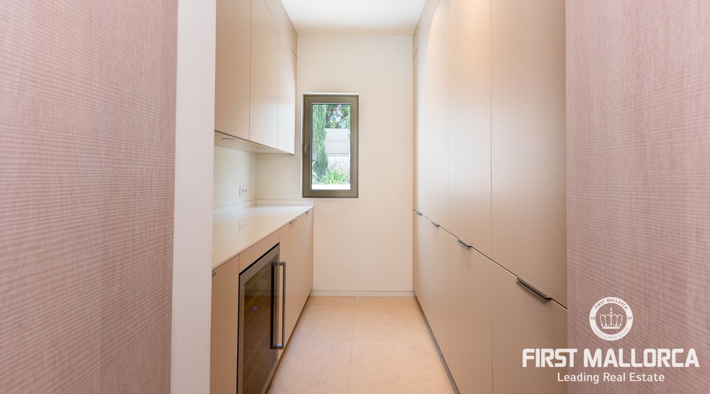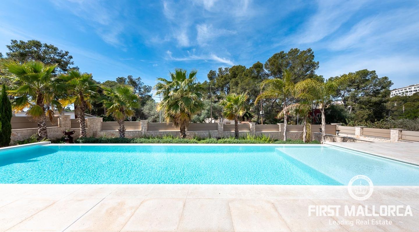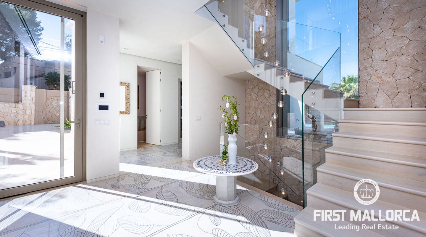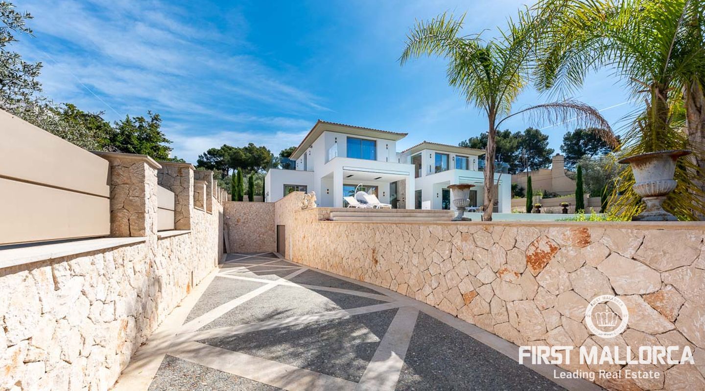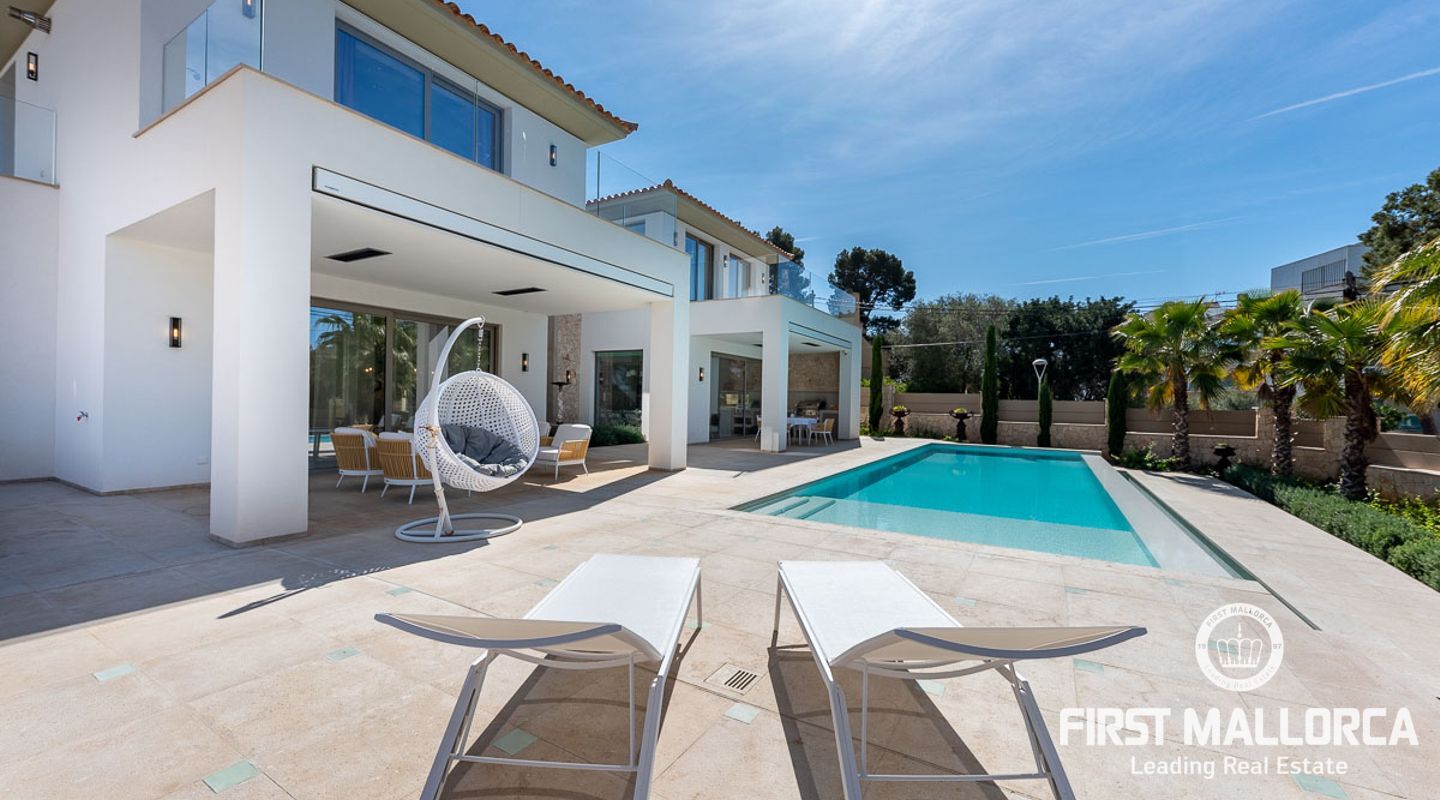 Diese in 2020 gebaute Villa befindet sich in Lauflage zu einem der schönsten Strände im Südwesten, sowie Hafen von Puerto Portals und dem kleinen Einkaufsort Portals Nous. Das angebotene Objekt wurde mit viel Naturstein im Aussenbereich gefertigt und fügt sich harmonisch in die mediterrane Umgebung ein. Nicht nur die beste Technik, sondern auch viele charmante und hochwertige Details wie spezielles Holzparkett von Vassaletti, eine Küche von Birgit Müller sowie speziell veredelte Wandflächen, sind bei der Realiserung dieses Projekts zum Einsatz gekommen. Auf einem südlich ausgerichteteten Grundstück bietet diese Villa auf drei Etagen ca. 520m2 bebaute Fläche. Im UG mit direktem Zugang zum Haus liegt die Tiefgarage mit Platz für 4 PKW, ebenfalls befindet sich hier ein grosser HWR. Über eine Treppe gelangt man in den Hauptbereich mit grosser Luxus Einbau und Essbereich, das Wohnzimmer ist separat angelegt, desweiteren gibt es hier ein Gäste WC. Über grosse Schiebtetüren erreicht man den Aussenbereich der teilweise überdacht ist. Hier gibt es auch den Zugang zum separaten Gästeschlafzimmer mit eigenem Bad. Der 12 x4 grosse Swimmingpool lädt zum Baden ein, Sonne gibt es den ganzen Tag, Sommer wie Winter. Im ersten OG liegen das Hauptschlafzimmer sowie zwei Gästeschlafzimmer, die sich ein Bad teilen. Ausstattungsmerkmale dieser mediterranen Villa sind: Naturstein Böden, Echtholz Parkett, Fussbodenheizung, Klimaanlage warm/kalt, Gaskamin, Beschattungssyteme, Domotic System, Alarmanlage, Hauswirtschaftsraum, Speisekammer. Wenn Sie eine perfekte Familienvilla mit unmittelbarem Strandzugang suchen, hier sind es nur wenige Minuten zu Fuss bis ans Wasser. Bitte zögern Sie nicht unser freundliches Firrst Mallorca Verkaufsteam wegen weiterer Details oder zwecks Terminierung einer Besichtigung zu kontaktieren.