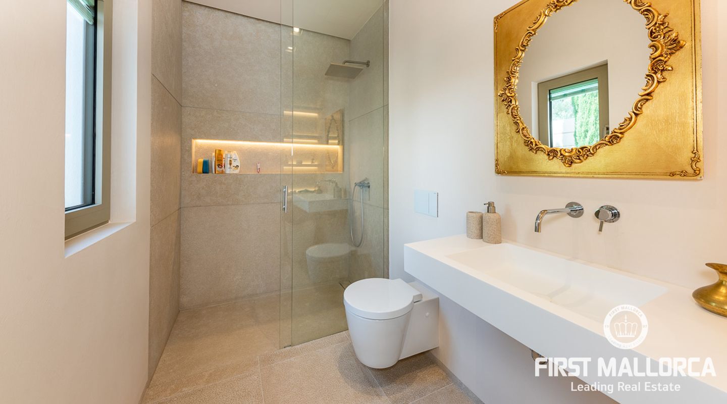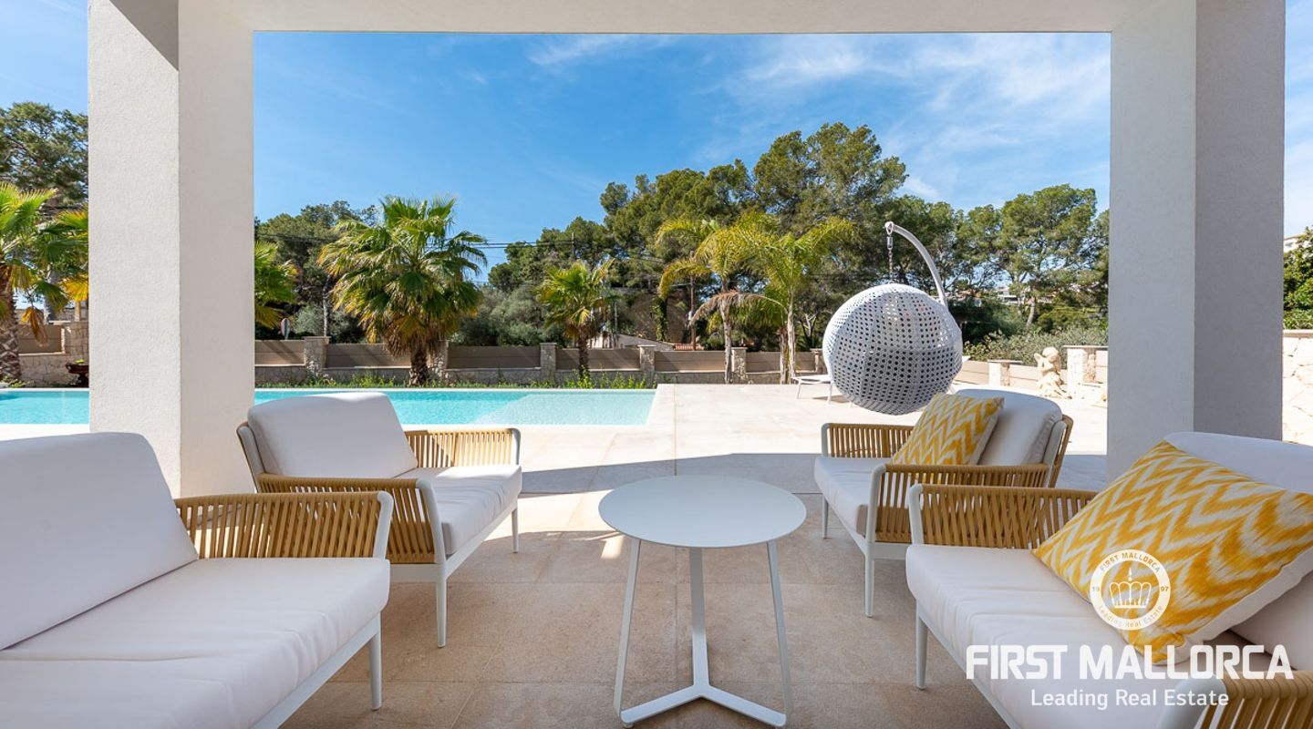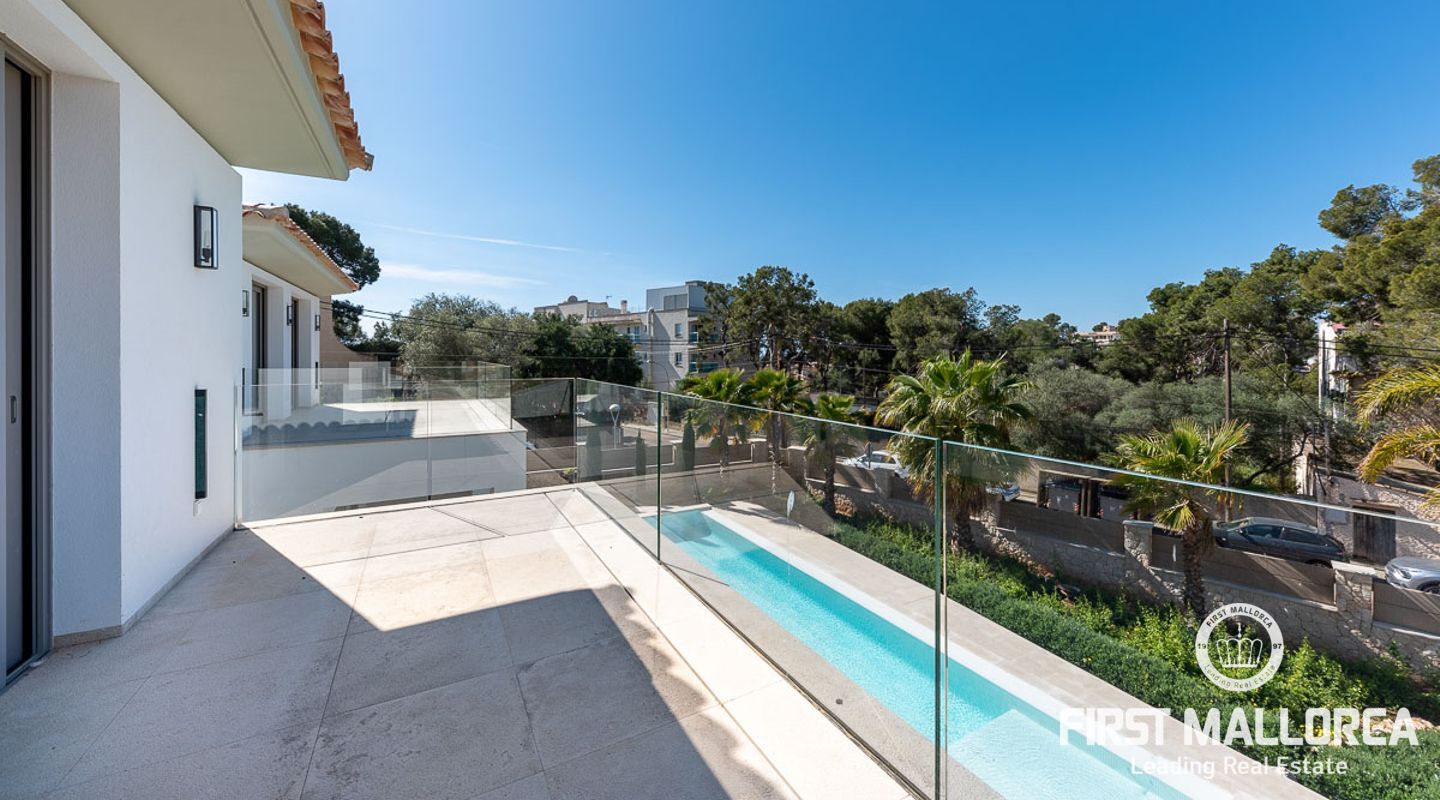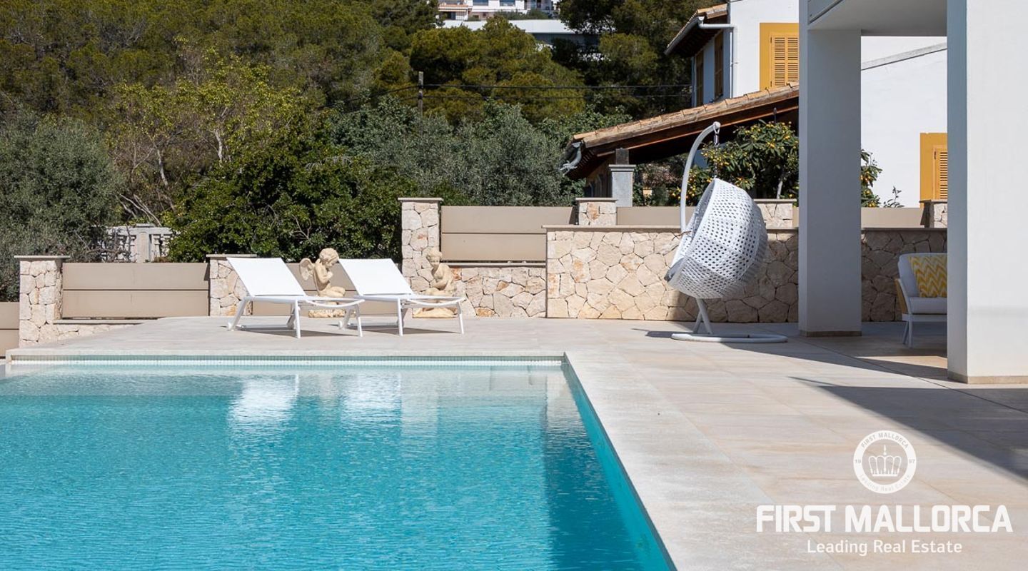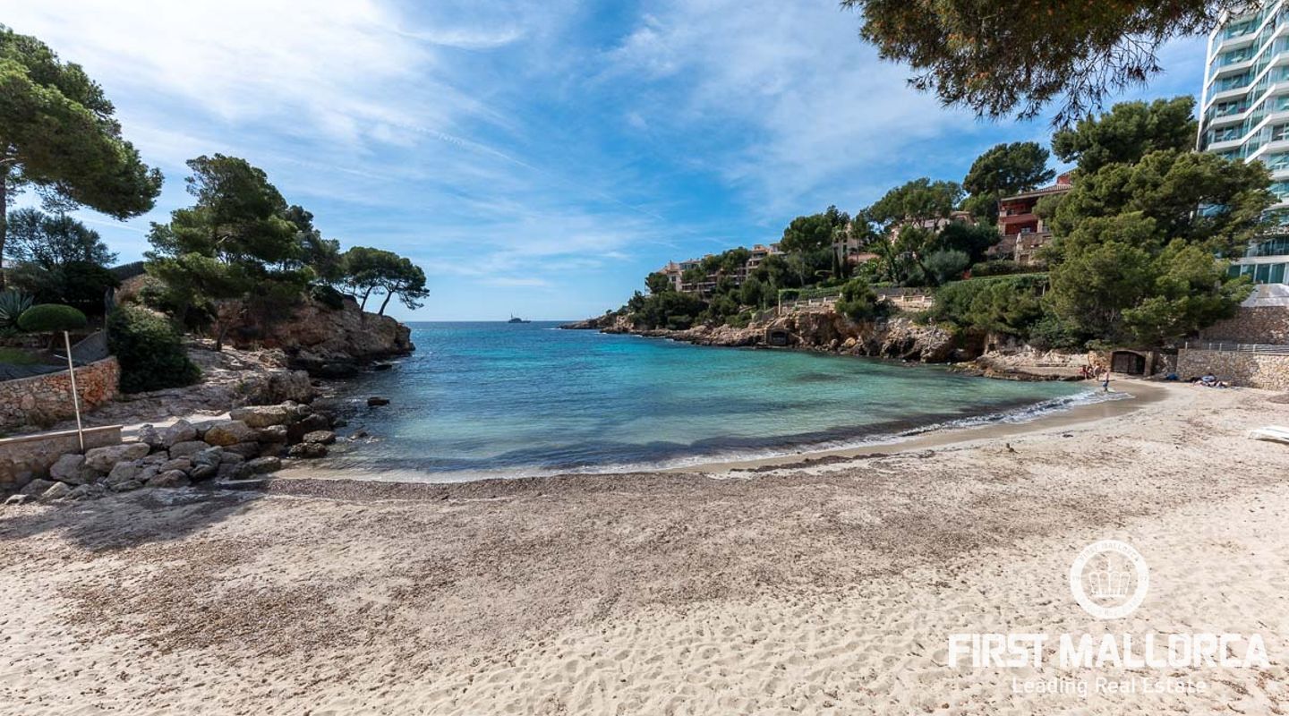 Diese in 2020 gebaute Villa befindet sich in Lauflage zu einem der schönsten Strände im Südwesten, sowie Hafen von Puerto Portals und dem kleinen Einkaufsort Portals Nous. Das angebotene Objekt wurde mit viel Naturstein im Aussenbereich gefertigt und fügt sich harmonisch in die mediterrane Umgebung ein. Nicht nur die beste Technik, sondern auch viele charmante und hochwertige Details wie spezielles Holzparkett von Vassaletti, eine Küche von Birgit Müller sowie speziell veredelte Wandflächen, sind bei der Realiserung dieses Projekts zum Einsatz gekommen. Auf einem südlich ausgerichteteten Grundstück bietet diese Villa auf drei Etagen ca. 520m2 bebaute Fläche. Im UG mit direktem Zugang zum Haus liegt die Tiefgarage mit Platz für 4 PKW, ebenfalls befindet sich hier ein grosser HWR. Über eine Treppe gelangt man in den Hauptbereich mit grosser Luxus Einbau und Essbereich, das Wohnzimmer ist separat angelegt, desweiteren gibt es hier ein Gäste WC. Über grosse Schiebtetüren erreicht man den Aussenbereich der teilweise überdacht ist. Hier gibt es auch den Zugang zum separaten Gästeschlafzimmer mit eigenem Bad. Der 12 x4 grosse Swimmingpool lädt zum Baden ein, Sonne gibt es den ganzen Tag, Sommer wie Winter. Im ersten OG liegen das Hauptschlafzimmer sowie zwei Gästeschlafzimmer, die sich ein Bad teilen. Ausstattungsmerkmale dieser mediterranen Villa sind: Naturstein Böden, Echtholz Parkett, Fussbodenheizung, Klimaanlage warm/kalt, Gaskamin, Beschattungssyteme, Domotic System, Alarmanlage, Hauswirtschaftsraum, Speisekammer. Wenn Sie eine perfekte Familienvilla mit unmittelbarem Strandzugang suchen, hier sind es nur wenige Minuten zu Fuss bis ans Wasser. Bitte zögern Sie nicht unser freundliches Firrst Mallorca Verkaufsteam wegen weiterer Details oder zwecks Terminierung einer Besichtigung zu kontaktieren.