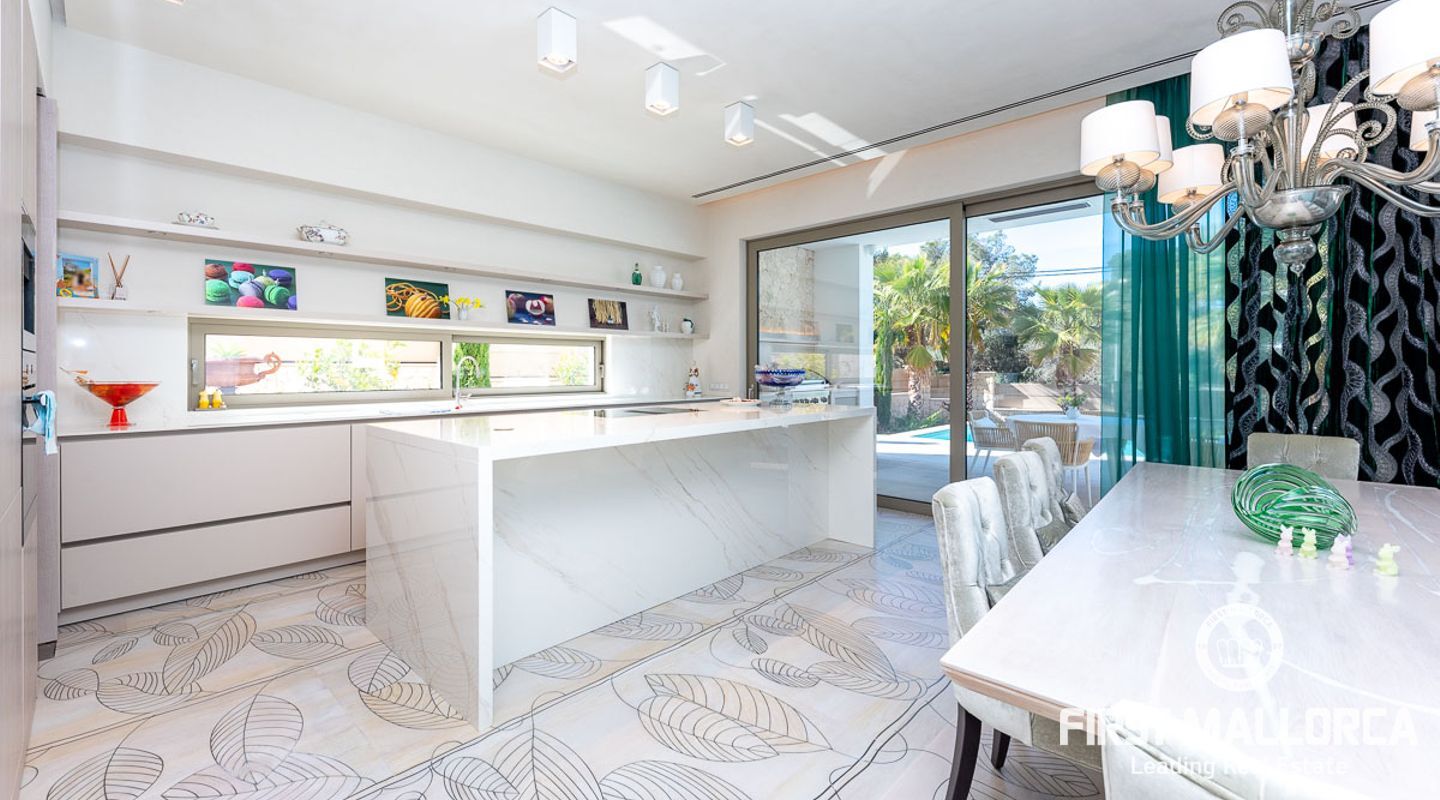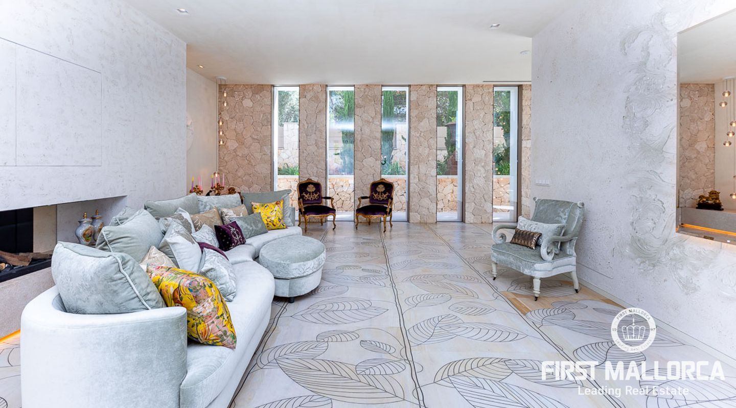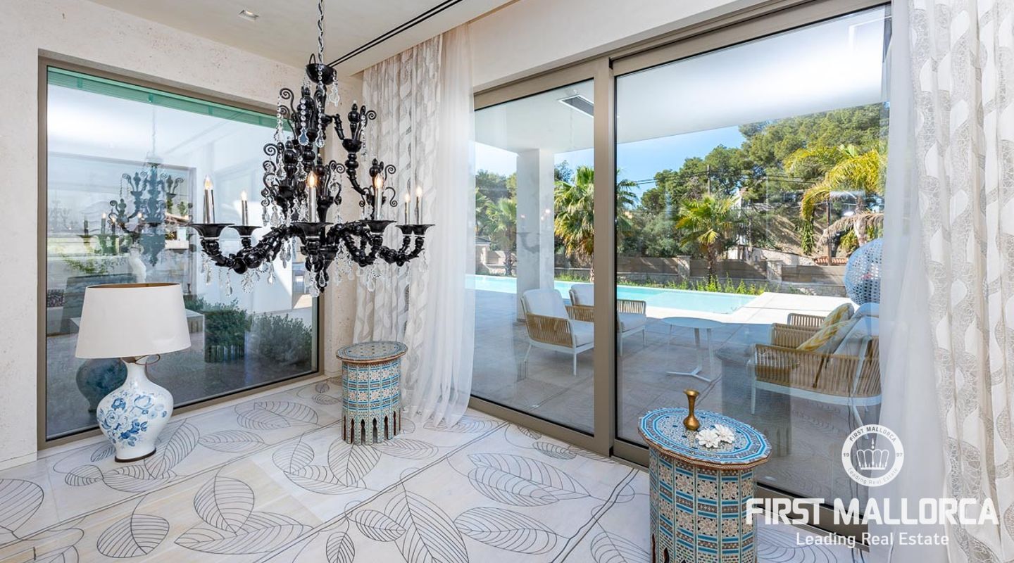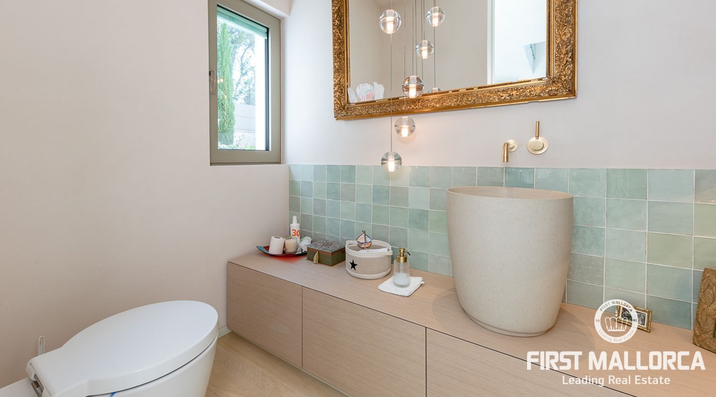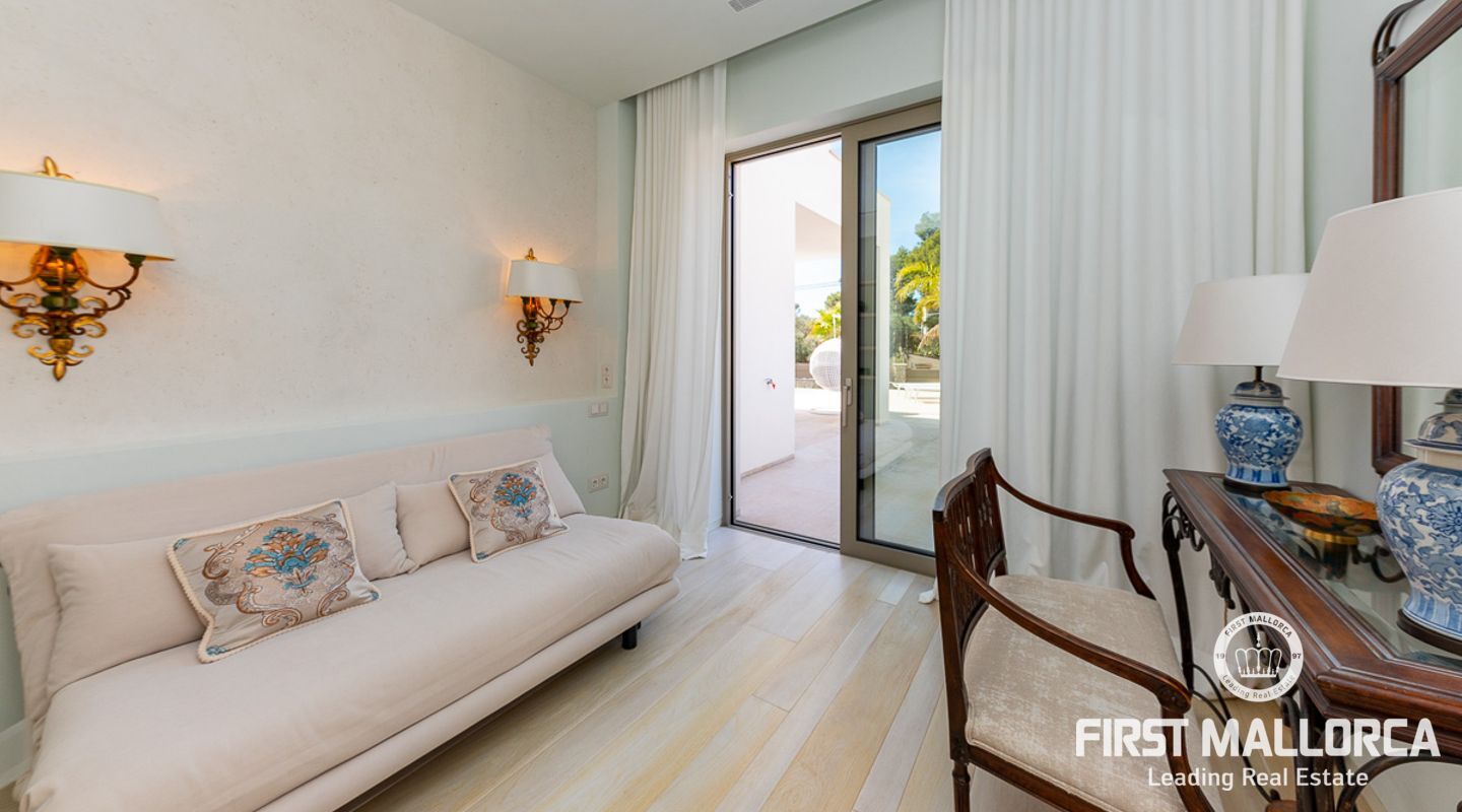 Diese in 2020 gebaute Villa befindet sich in Lauflage zu einem der schönsten Strände im Südwesten, sowie Hafen von Puerto Portals und dem kleinen Einkaufsort Portals Nous. Das angebotene Objekt wurde mit viel Naturstein im Aussenbereich gefertigt und fügt sich harmonisch in die mediterrane Umgebung ein. Nicht nur die beste Technik, sondern auch viele charmante und hochwertige Details wie spezielles Holzparkett von Vassaletti, eine Küche von Birgit Müller sowie speziell veredelte Wandflächen, sind bei der Realiserung dieses Projekts zum Einsatz gekommen. Auf einem südlich ausgerichteteten Grundstück bietet diese Villa auf drei Etagen ca. 520m2 bebaute Fläche. Im UG mit direktem Zugang zum Haus liegt die Tiefgarage mit Platz für 4 PKW, ebenfalls befindet sich hier ein grosser HWR. Über eine Treppe gelangt man in den Hauptbereich mit grosser Luxus Einbau und Essbereich, das Wohnzimmer ist separat angelegt, desweiteren gibt es hier ein Gäste WC. Über grosse Schiebtetüren erreicht man den Aussenbereich der teilweise überdacht ist. Hier gibt es auch den Zugang zum separaten Gästeschlafzimmer mit eigenem Bad. Der 12 x4 grosse Swimmingpool lädt zum Baden ein, Sonne gibt es den ganzen Tag, Sommer wie Winter. Im ersten OG liegen das Hauptschlafzimmer sowie zwei Gästeschlafzimmer, die sich ein Bad teilen. Ausstattungsmerkmale dieser mediterranen Villa sind: Naturstein Böden, Echtholz Parkett, Fussbodenheizung, Klimaanlage warm/kalt, Gaskamin, Beschattungssyteme, Domotic System, Alarmanlage, Hauswirtschaftsraum, Speisekammer. Wenn Sie eine perfekte Familienvilla mit unmittelbarem Strandzugang suchen, hier sind es nur wenige Minuten zu Fuss bis ans Wasser. Bitte zögern Sie nicht unser freundliches Firrst Mallorca Verkaufsteam wegen weiterer Details oder zwecks Terminierung einer Besichtigung zu kontaktieren.