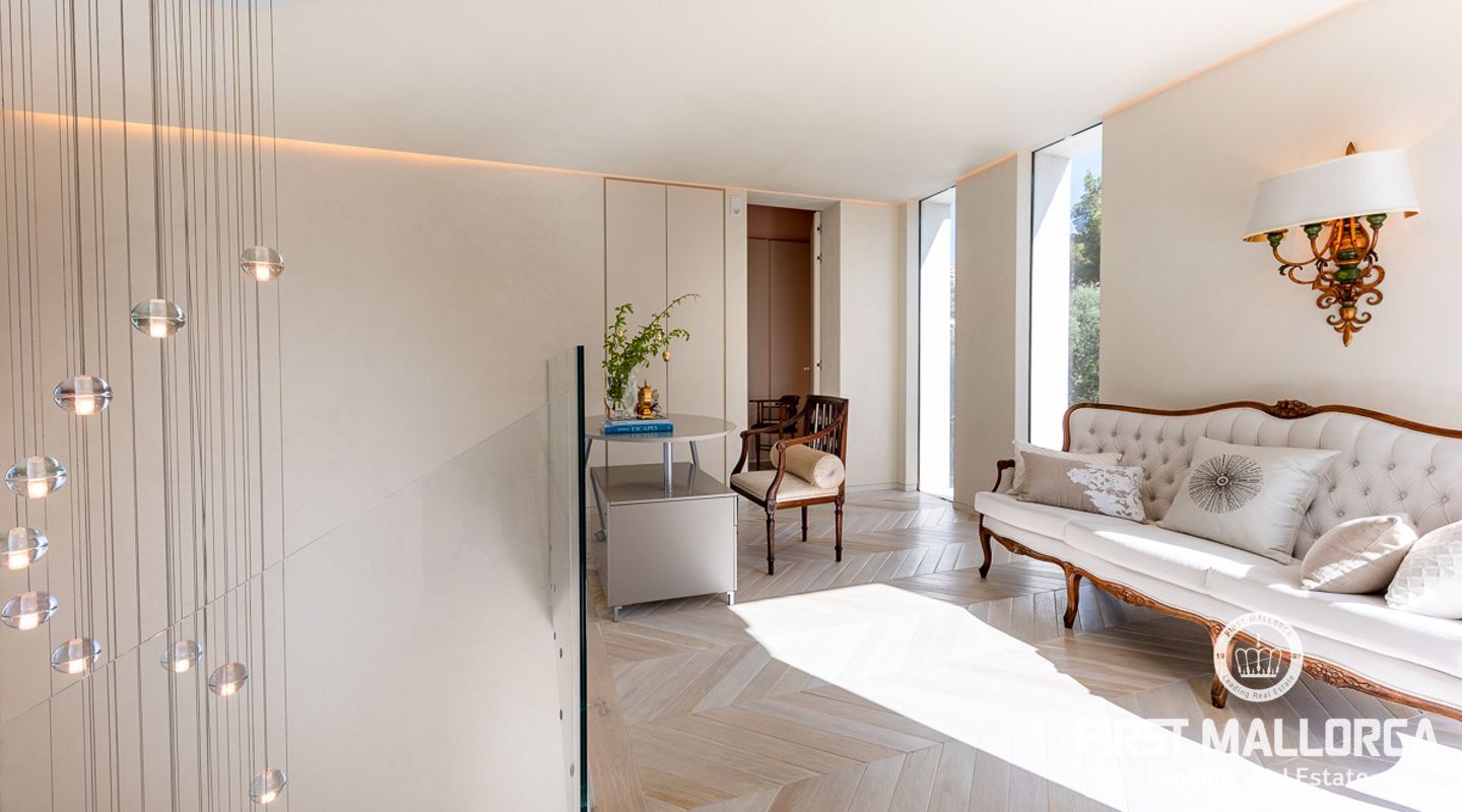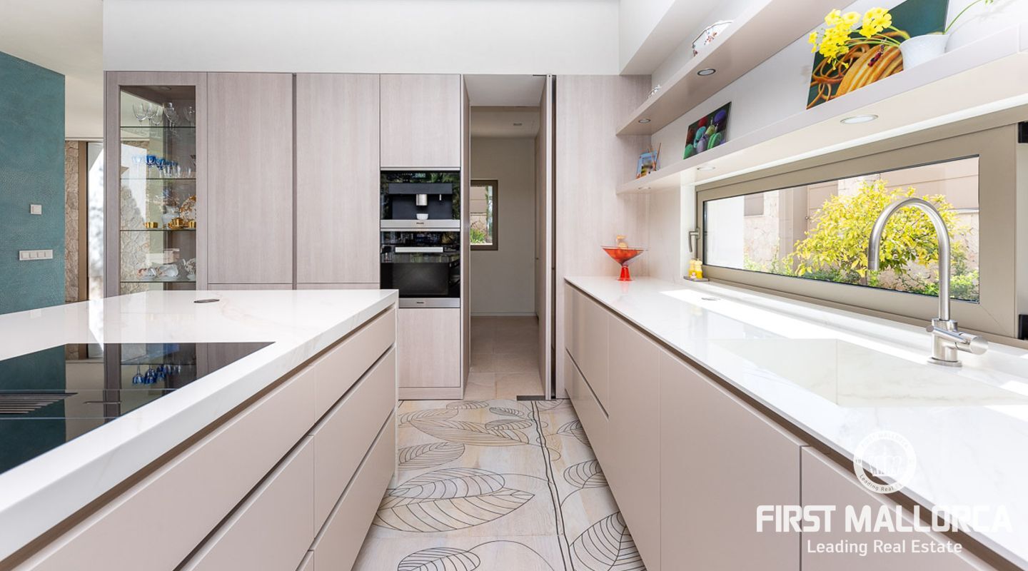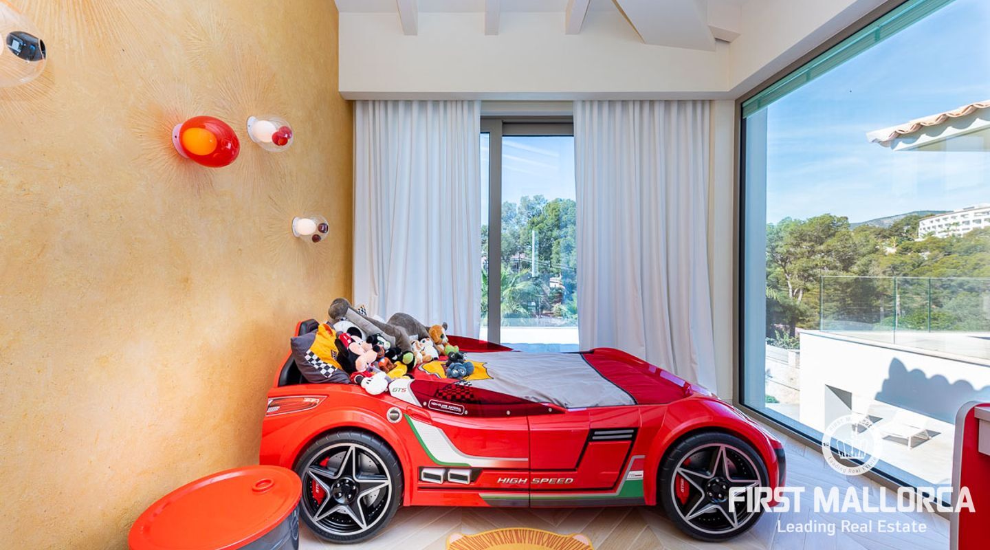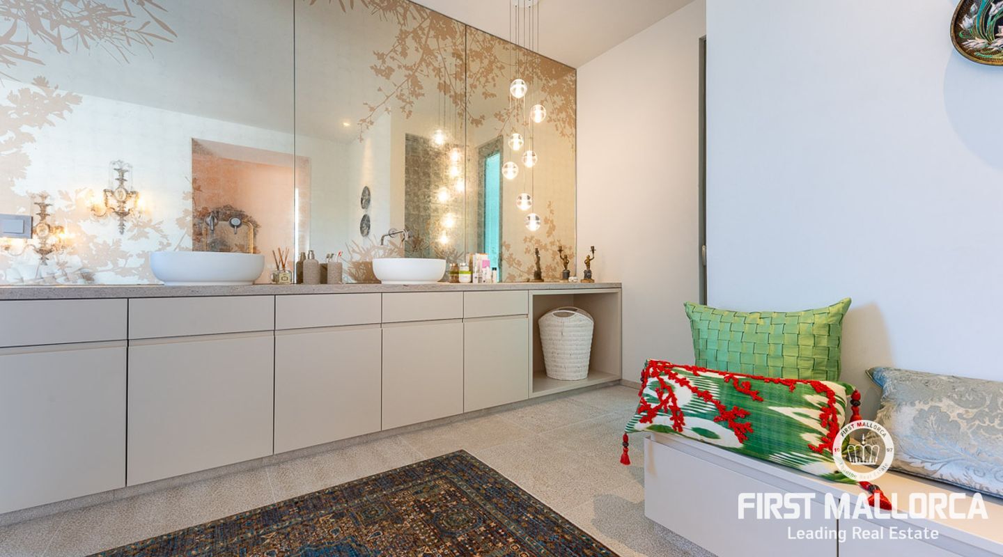 Diese in 2020 gebaute Villa befindet sich in Lauflage zu einem der schönsten Strände im Südwesten, sowie Hafen von Puerto Portals und dem kleinen Einkaufsort Portals Nous. Das angebotene Objekt wurde mit viel Naturstein im Aussenbereich gefertigt und fügt sich harmonisch in die mediterrane Umgebung ein. Nicht nur die beste Technik, sondern auch viele charmante und hochwertige Details wie spezielles Holzparkett von Vassaletti, eine Küche von Birgit Müller sowie speziell veredelte Wandflächen, sind bei der Realiserung dieses Projekts zum Einsatz gekommen. Auf einem südlich ausgerichteteten Grundstück bietet diese Villa auf drei Etagen ca. 520m2 bebaute Fläche. Im UG mit direktem Zugang zum Haus liegt die Tiefgarage mit Platz für 4 PKW, ebenfalls befindet sich hier ein grosser HWR. Über eine Treppe gelangt man in den Hauptbereich mit grosser Luxus Einbau und Essbereich, das Wohnzimmer ist separat angelegt, desweiteren gibt es hier ein Gäste WC. Über grosse Schiebtetüren erreicht man den Aussenbereich der teilweise überdacht ist. Hier gibt es auch den Zugang zum separaten Gästeschlafzimmer mit eigenem Bad. Der 12 x4 grosse Swimmingpool lädt zum Baden ein, Sonne gibt es den ganzen Tag, Sommer wie Winter. Im ersten OG liegen das Hauptschlafzimmer sowie zwei Gästeschlafzimmer, die sich ein Bad teilen. Ausstattungsmerkmale dieser mediterranen Villa sind: Naturstein Böden, Echtholz Parkett, Fussbodenheizung, Klimaanlage warm/kalt, Gaskamin, Beschattungssyteme, Domotic System, Alarmanlage, Hauswirtschaftsraum, Speisekammer. Wenn Sie eine perfekte Familienvilla mit unmittelbarem Strandzugang suchen, hier sind es nur wenige Minuten zu Fuss bis ans Wasser. Bitte zögern Sie nicht unser freundliches Firrst Mallorca Verkaufsteam wegen weiterer Details oder zwecks Terminierung einer Besichtigung zu kontaktieren.