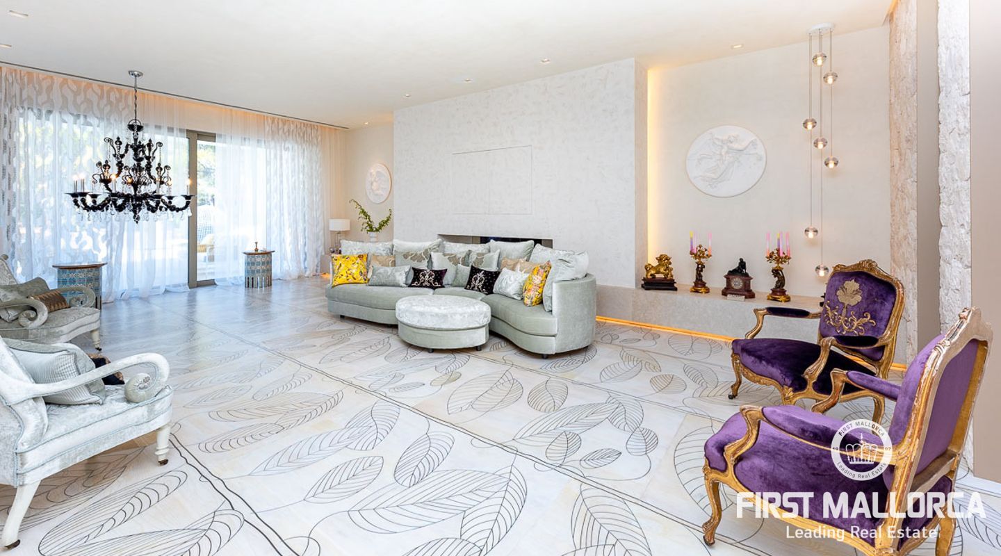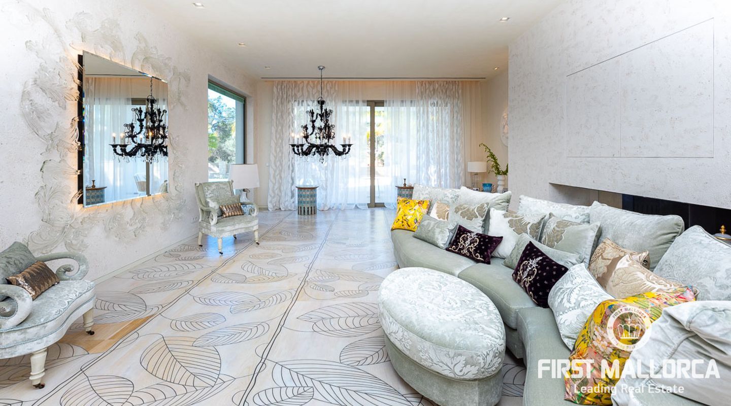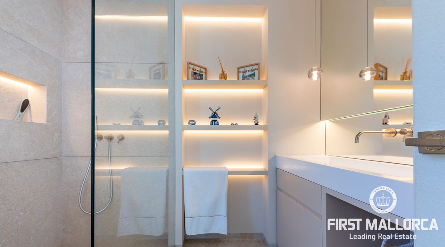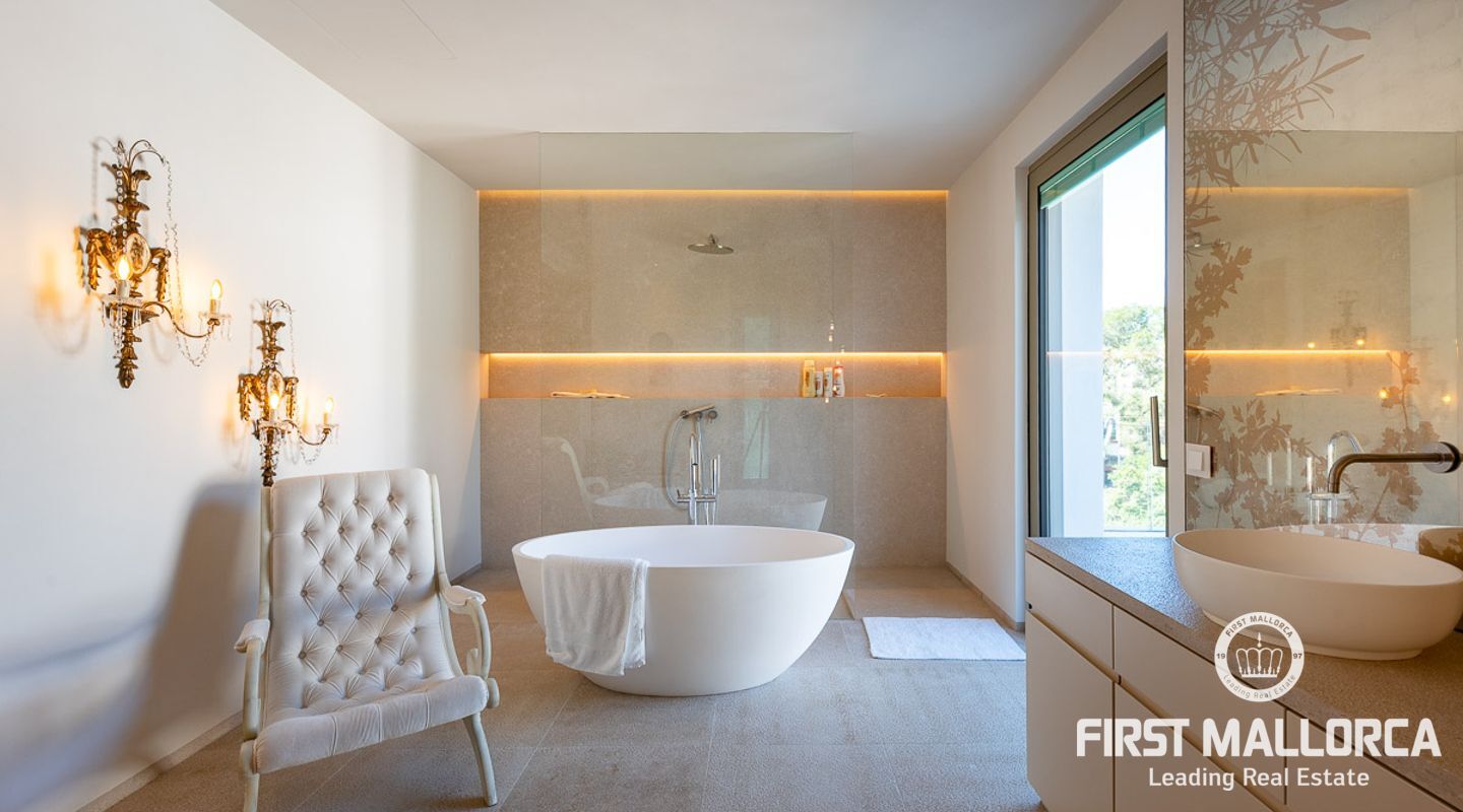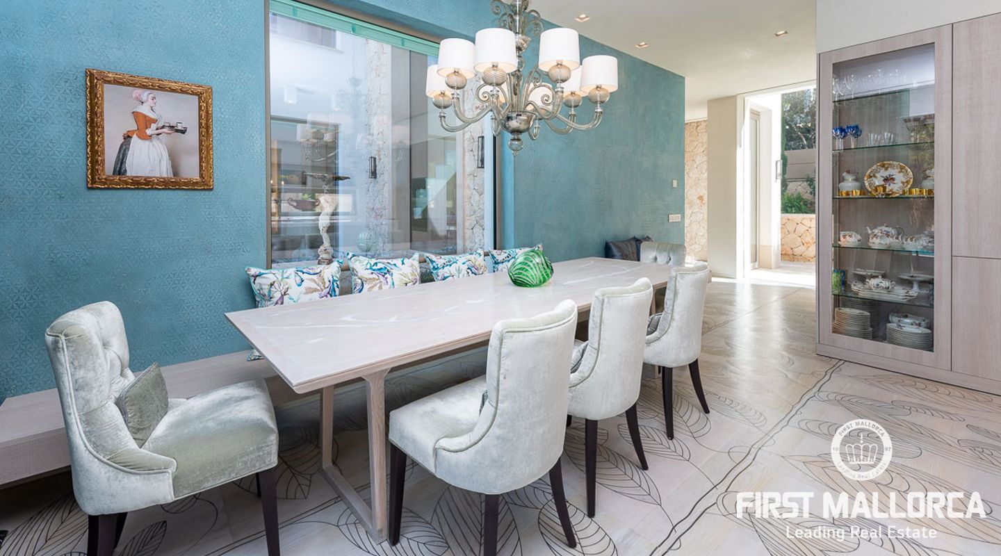 Diese in 2020 gebaute Villa befindet sich in Lauflage zu einem der schönsten Strände im Südwesten, sowie Hafen von Puerto Portals und dem kleinen Einkaufsort Portals Nous. Das angebotene Objekt wurde mit viel Naturstein im Aussenbereich gefertigt und fügt sich harmonisch in die mediterrane Umgebung ein. Nicht nur die beste Technik, sondern auch viele charmante und hochwertige Details wie spezielles Holzparkett von Vassaletti, eine Küche von Birgit Müller sowie speziell veredelte Wandflächen, sind bei der Realiserung dieses Projekts zum Einsatz gekommen. Auf einem südlich ausgerichteteten Grundstück bietet diese Villa auf drei Etagen ca. 520m2 bebaute Fläche. Im UG mit direktem Zugang zum Haus liegt die Tiefgarage mit Platz für 4 PKW, ebenfalls befindet sich hier ein grosser HWR. Über eine Treppe gelangt man in den Hauptbereich mit grosser Luxus Einbau und Essbereich, das Wohnzimmer ist separat angelegt, desweiteren gibt es hier ein Gäste WC. Über grosse Schiebtetüren erreicht man den Aussenbereich der teilweise überdacht ist. Hier gibt es auch den Zugang zum separaten Gästeschlafzimmer mit eigenem Bad. Der 12 x4 grosse Swimmingpool lädt zum Baden ein, Sonne gibt es den ganzen Tag, Sommer wie Winter. Im ersten OG liegen das Hauptschlafzimmer sowie zwei Gästeschlafzimmer, die sich ein Bad teilen. Ausstattungsmerkmale dieser mediterranen Villa sind: Naturstein Böden, Echtholz Parkett, Fussbodenheizung, Klimaanlage warm/kalt, Gaskamin, Beschattungssyteme, Domotic System, Alarmanlage, Hauswirtschaftsraum, Speisekammer. Wenn Sie eine perfekte Familienvilla mit unmittelbarem Strandzugang suchen, hier sind es nur wenige Minuten zu Fuss bis ans Wasser. Bitte zögern Sie nicht unser freundliches Firrst Mallorca Verkaufsteam wegen weiterer Details oder zwecks Terminierung einer Besichtigung zu kontaktieren.