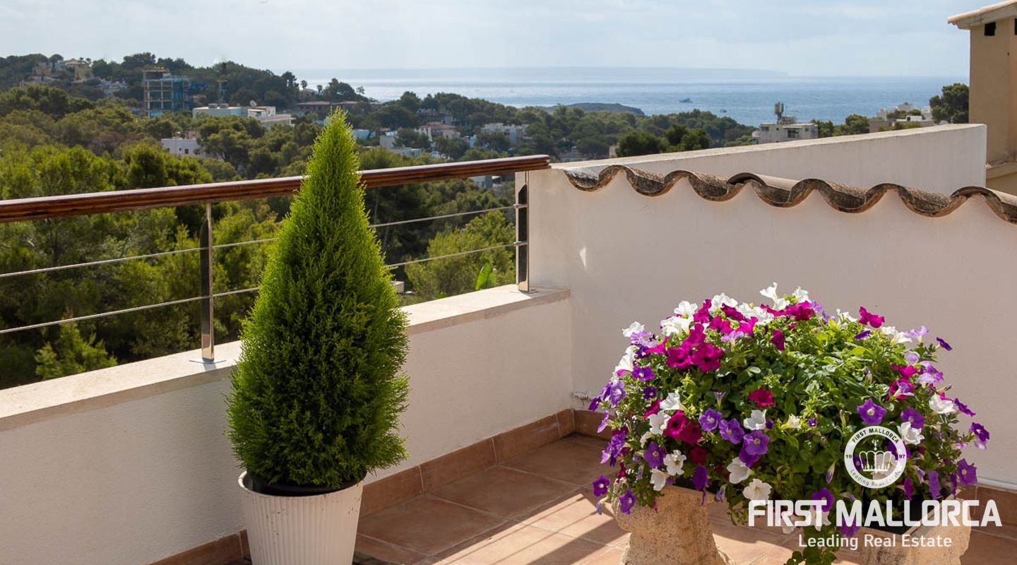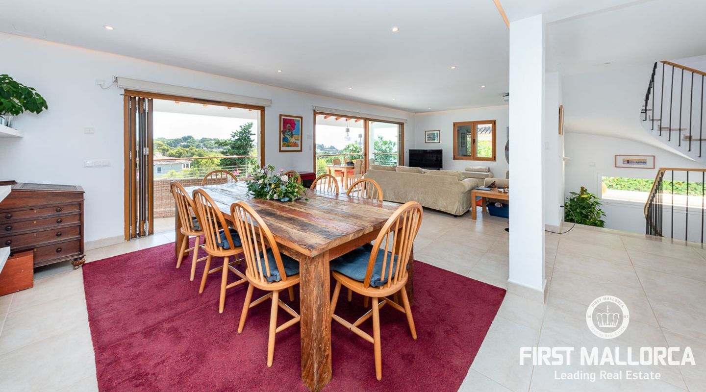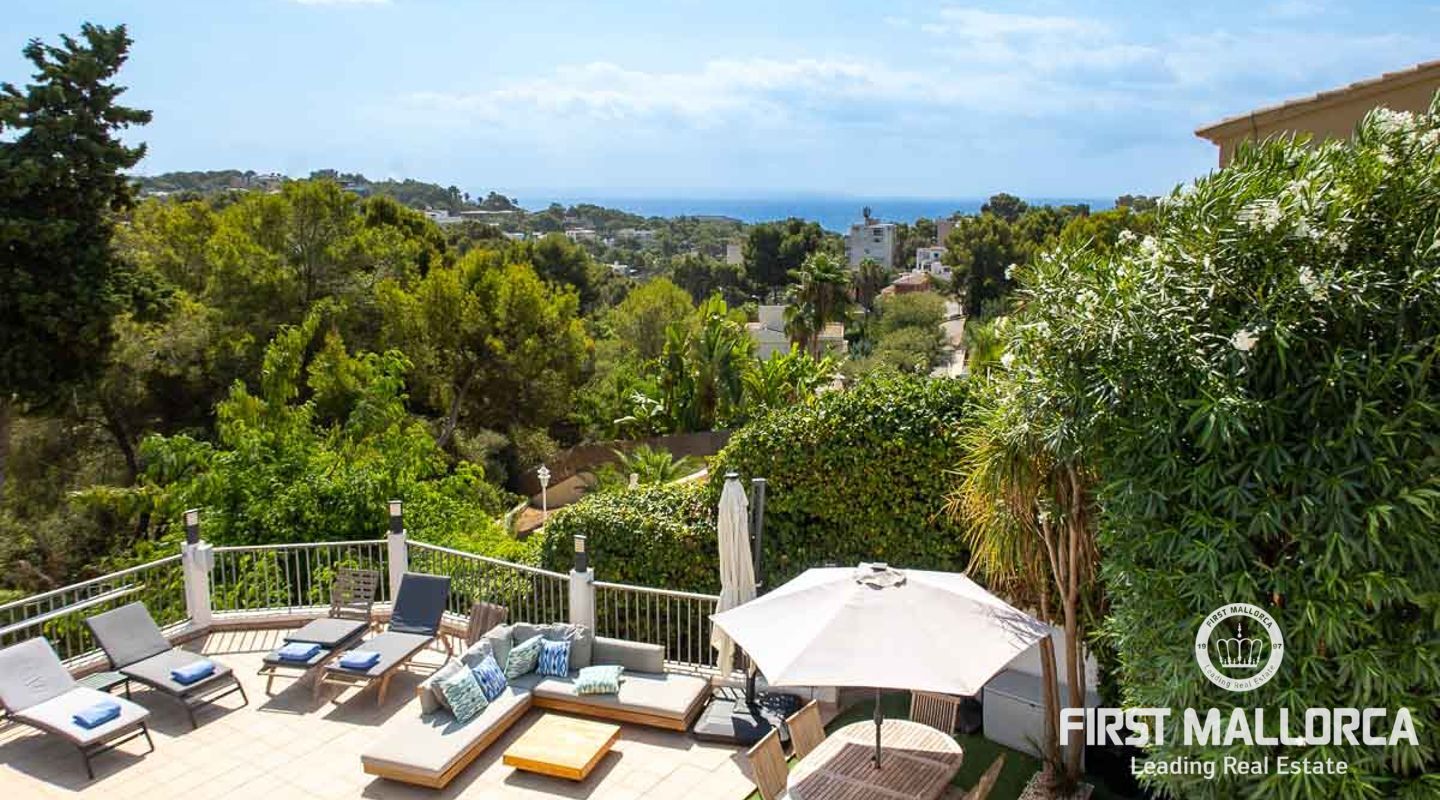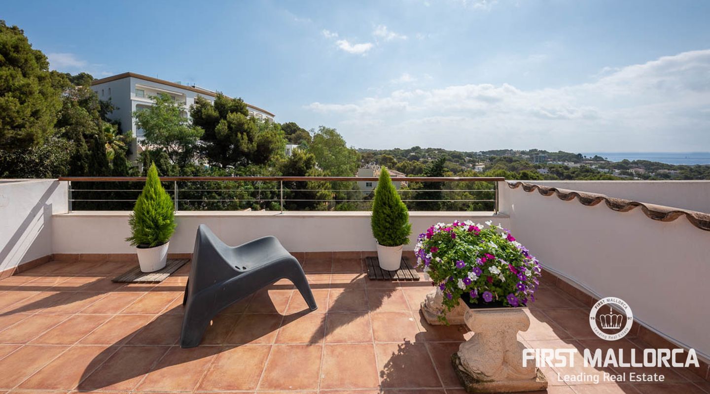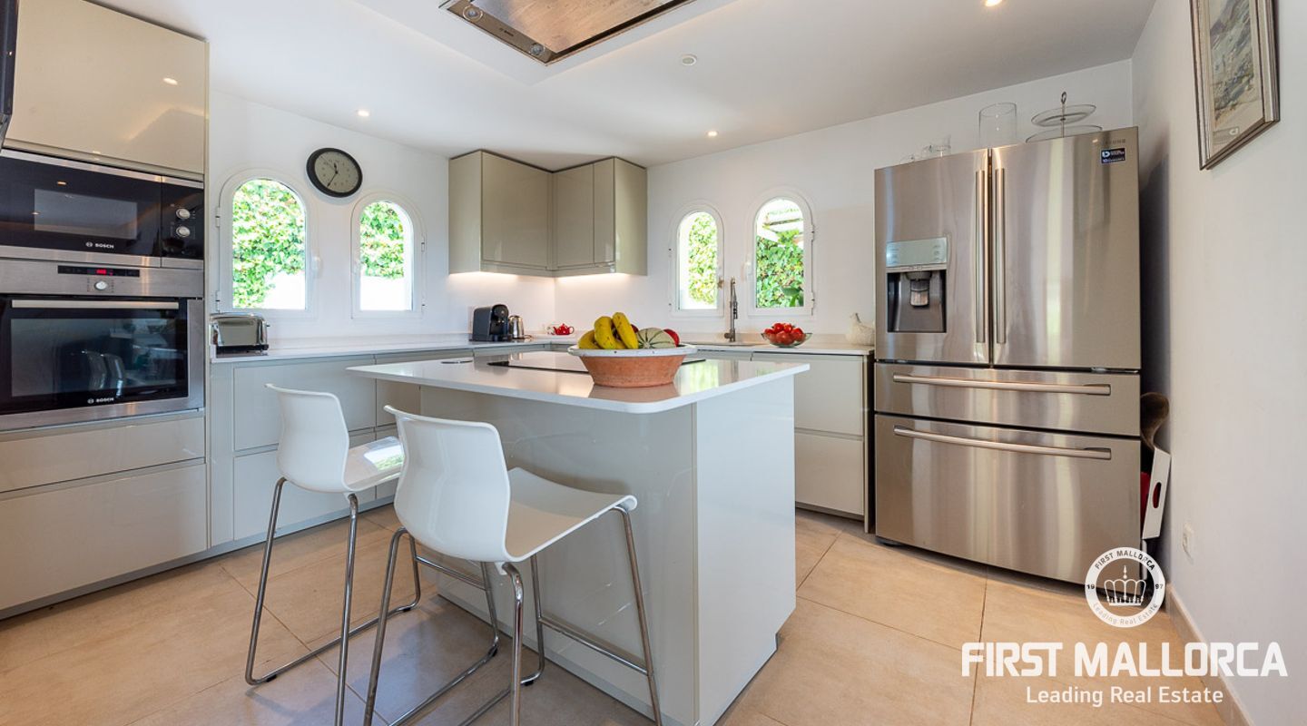 Willkommen in Ihrem Traumhaus in Portals Nous, wo Luxus auf Küstenleben trifft. Diese prächtige Villa bietet alles, was Sie sich wünschen, und noch mehr, mit ihren beeindruckenden drei Ebenen und fesselnden Ausblicken auf das glitzernde Mittelmeer. Auf der ersten Ebene finden Sie drei geräumige Schlafzimmer, die Ihnen und Ihren Lieben viel Platz zum Entspannen und Erholen bieten. Zwei moderne Bäder sorgen für Komfort und Privatsphäre für alle. Das Highlight dieser Ebene ist der nahtlose Zugang zum einladenden Poolbereich, in dem Sie sich an warmen Sommertagen abkühlen können. Und für diejenigen, die gerne Gäste bewirten, steht eine gut ausgestattete Sommerküche bereit, die das Beisammensein am Pool zu einem angenehmen Erlebnis macht. Steigen Sie in die zweite Etage hinauf, und Sie werden von dem großzügigen Wohnbereich mit offener Küche beeindruckt sein. Diese Ebene verkörpert Eleganz und Funktionalität, mit hochwertigen Oberflächen und reichlich natürlichem Licht, das durch große Fenster einfällt. Die großzügige Terrasse ist der perfekte Ort, um einen Morgenkaffee zu genießen, während die Sonne über dem Horizont aufgeht und man einen atemberaubenden Blick auf das Meer hat. Lassen Sie sich von der dritten Ebene überraschen, die ausschließlich dem luxuriösen Hauptschlafzimmer gewidmet ist. Dieser geräumige Rückzugsort bietet ein Höchstmaß an Privatsphäre und Ruhe, ergänzt durch eine private Terrasse mit Blick auf das glitzernde Wasser des Mittelmeers.
