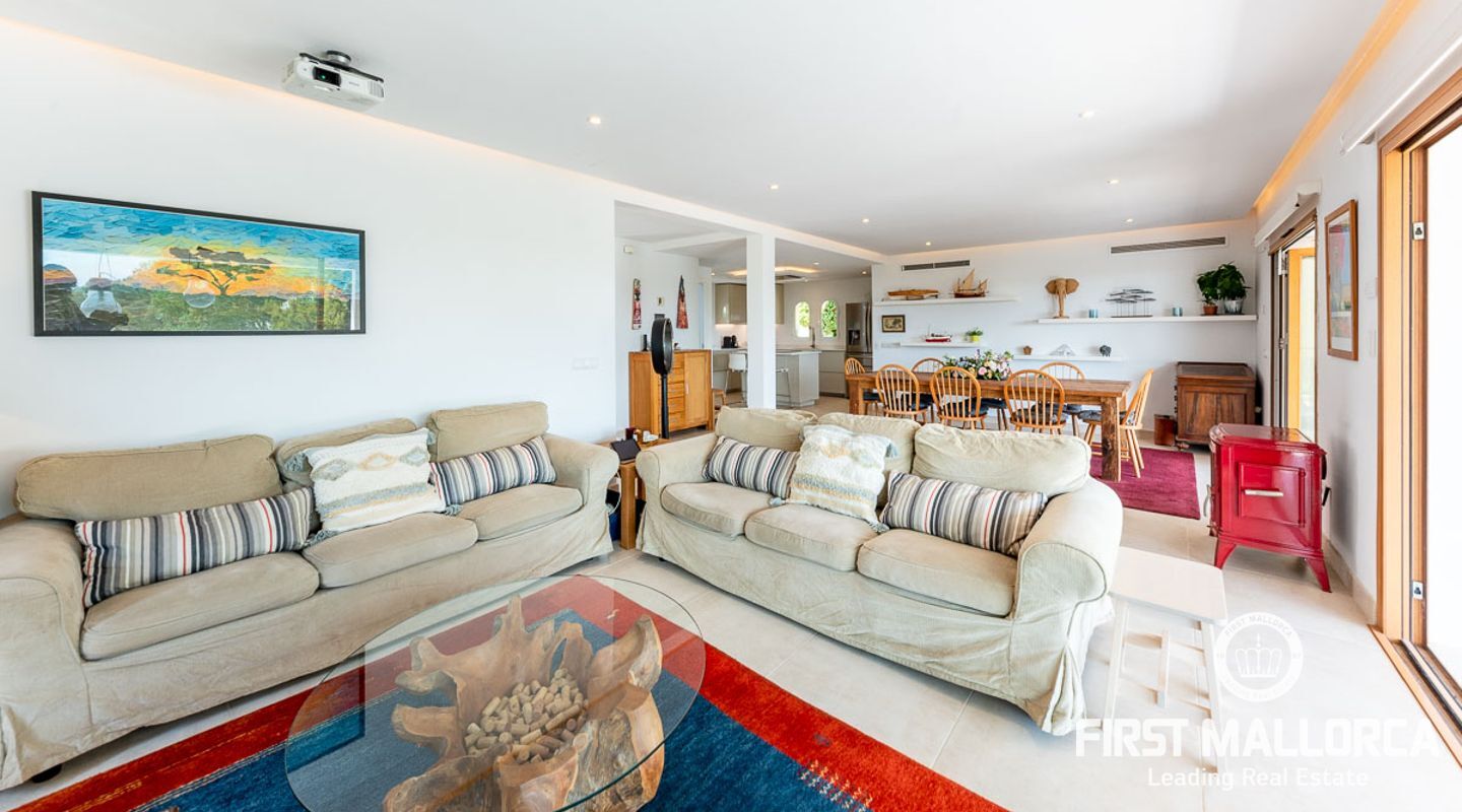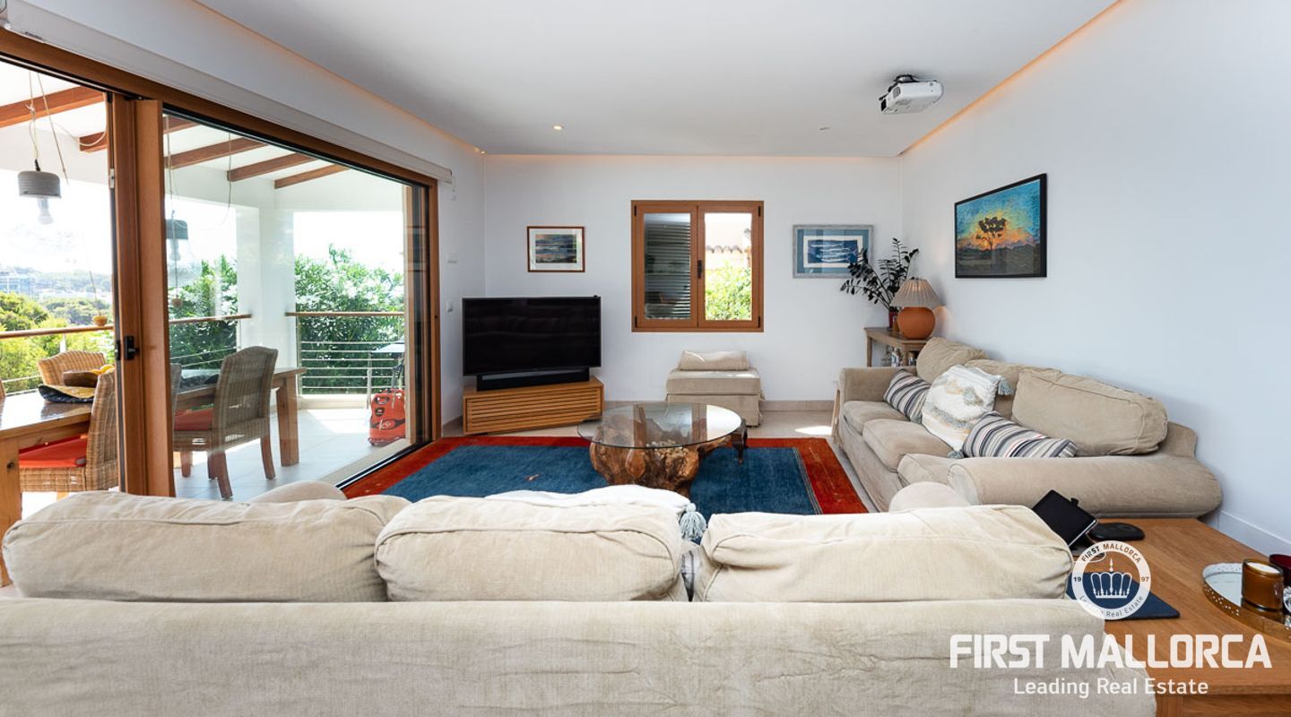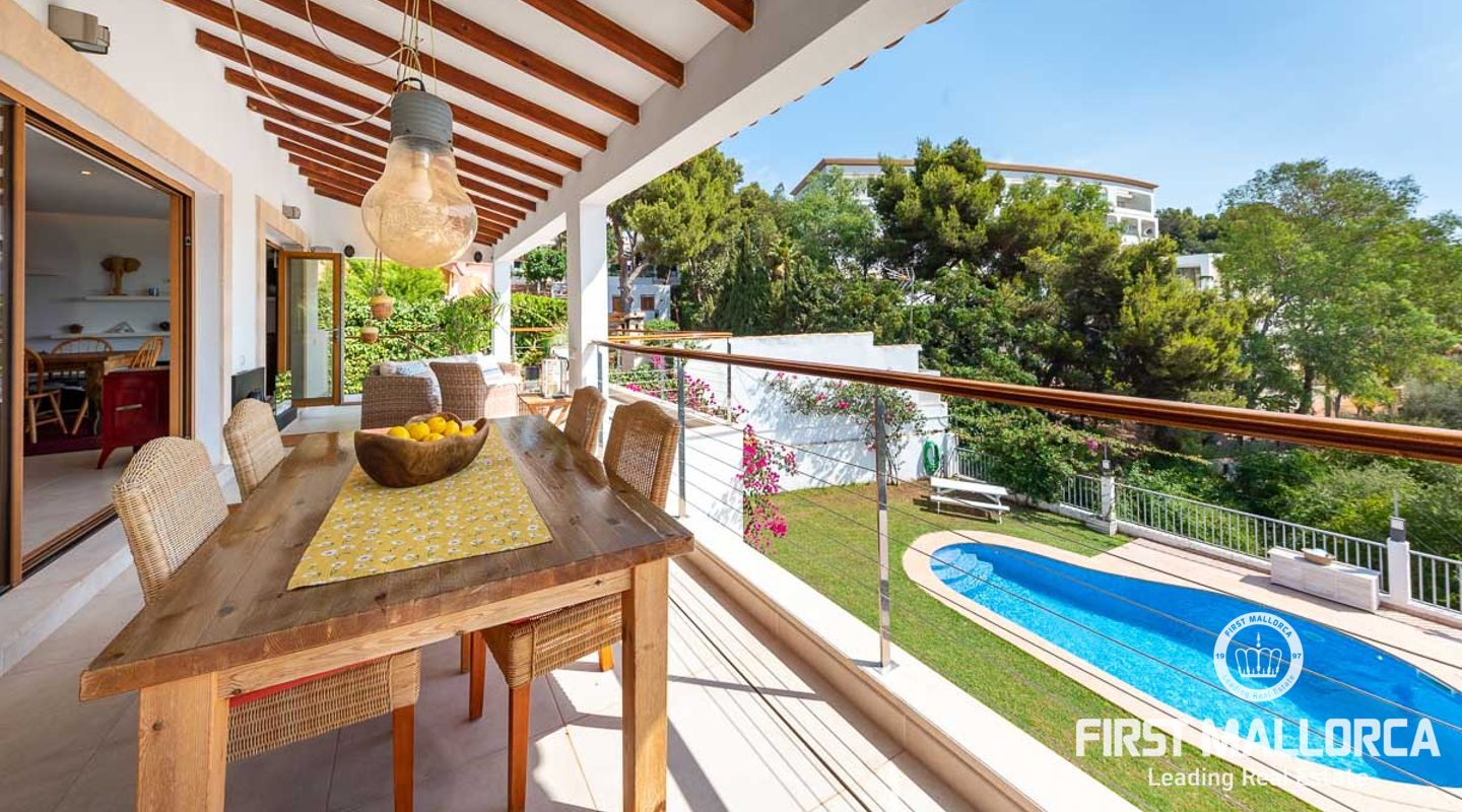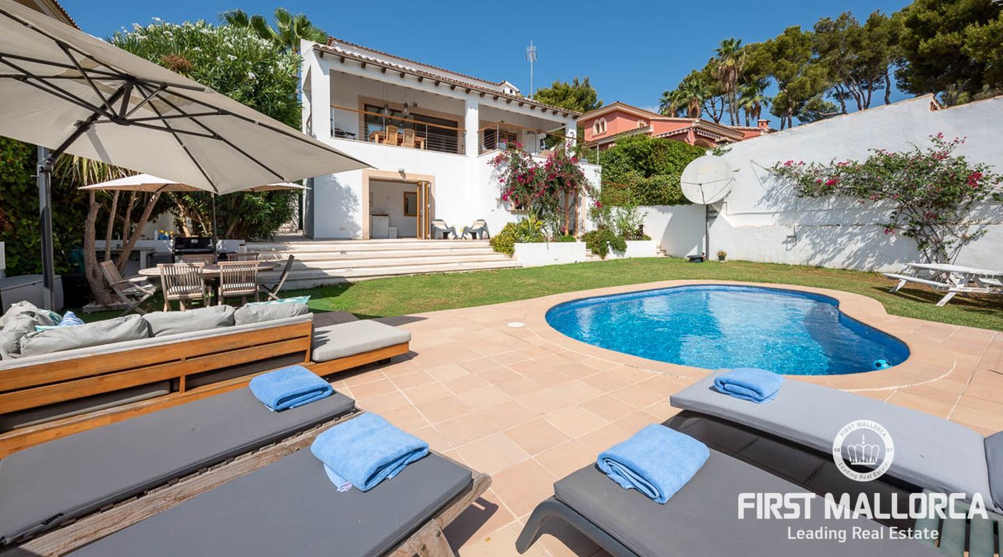 Willkommen in Ihrem Traumhaus in Portals Nous, wo Luxus auf Küstenleben trifft. Diese prächtige Villa bietet alles, was Sie sich wünschen, und noch mehr, mit ihren beeindruckenden drei Ebenen und fesselnden Ausblicken auf das glitzernde Mittelmeer. Auf der ersten Ebene finden Sie drei geräumige Schlafzimmer, die Ihnen und Ihren Lieben viel Platz zum Entspannen und Erholen bieten. Zwei moderne Bäder sorgen für Komfort und Privatsphäre für alle. Das Highlight dieser Ebene ist der nahtlose Zugang zum einladenden Poolbereich, in dem Sie sich an warmen Sommertagen abkühlen können. Und für diejenigen, die gerne Gäste bewirten, steht eine gut ausgestattete Sommerküche bereit, die das Beisammensein am Pool zu einem angenehmen Erlebnis macht. Steigen Sie in die zweite Etage hinauf, und Sie werden von dem großzügigen Wohnbereich mit offener Küche beeindruckt sein. Diese Ebene verkörpert Eleganz und Funktionalität, mit hochwertigen Oberflächen und reichlich natürlichem Licht, das durch große Fenster einfällt. Die großzügige Terrasse ist der perfekte Ort, um einen Morgenkaffee zu genießen, während die Sonne über dem Horizont aufgeht und man einen atemberaubenden Blick auf das Meer hat. Lassen Sie sich von der dritten Ebene überraschen, die ausschließlich dem luxuriösen Hauptschlafzimmer gewidmet ist. Dieser geräumige Rückzugsort bietet ein Höchstmaß an Privatsphäre und Ruhe, ergänzt durch eine private Terrasse mit Blick auf das glitzernde Wasser des Mittelmeers.