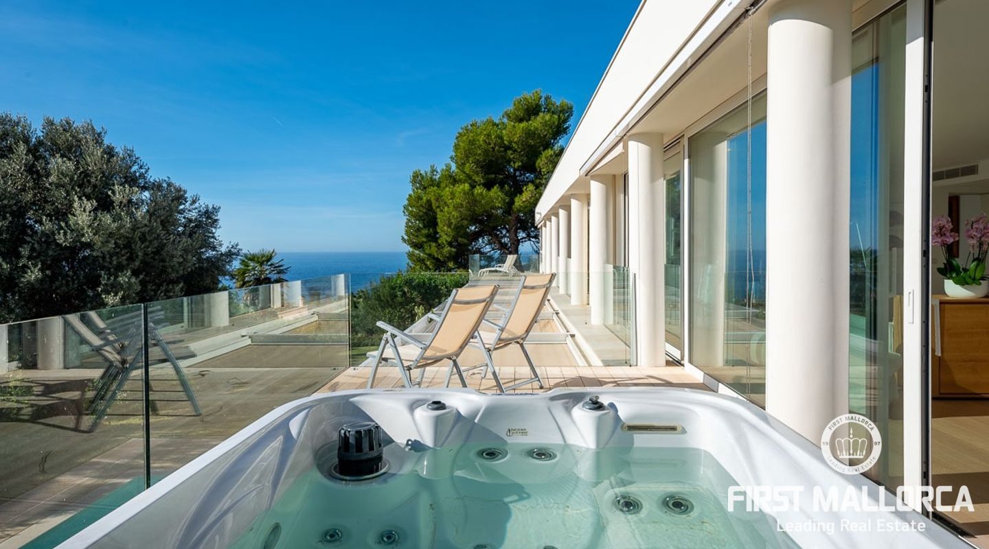 Der Außenbereich beeindruckt mit einem privaten Pool, der einen spektakulären Meerblick bietet, sowie einem Jacuzzi für erholsame Momente. Die Immobilie verfügt über eine Garage mit Platz für zwei Fahrzeuge.