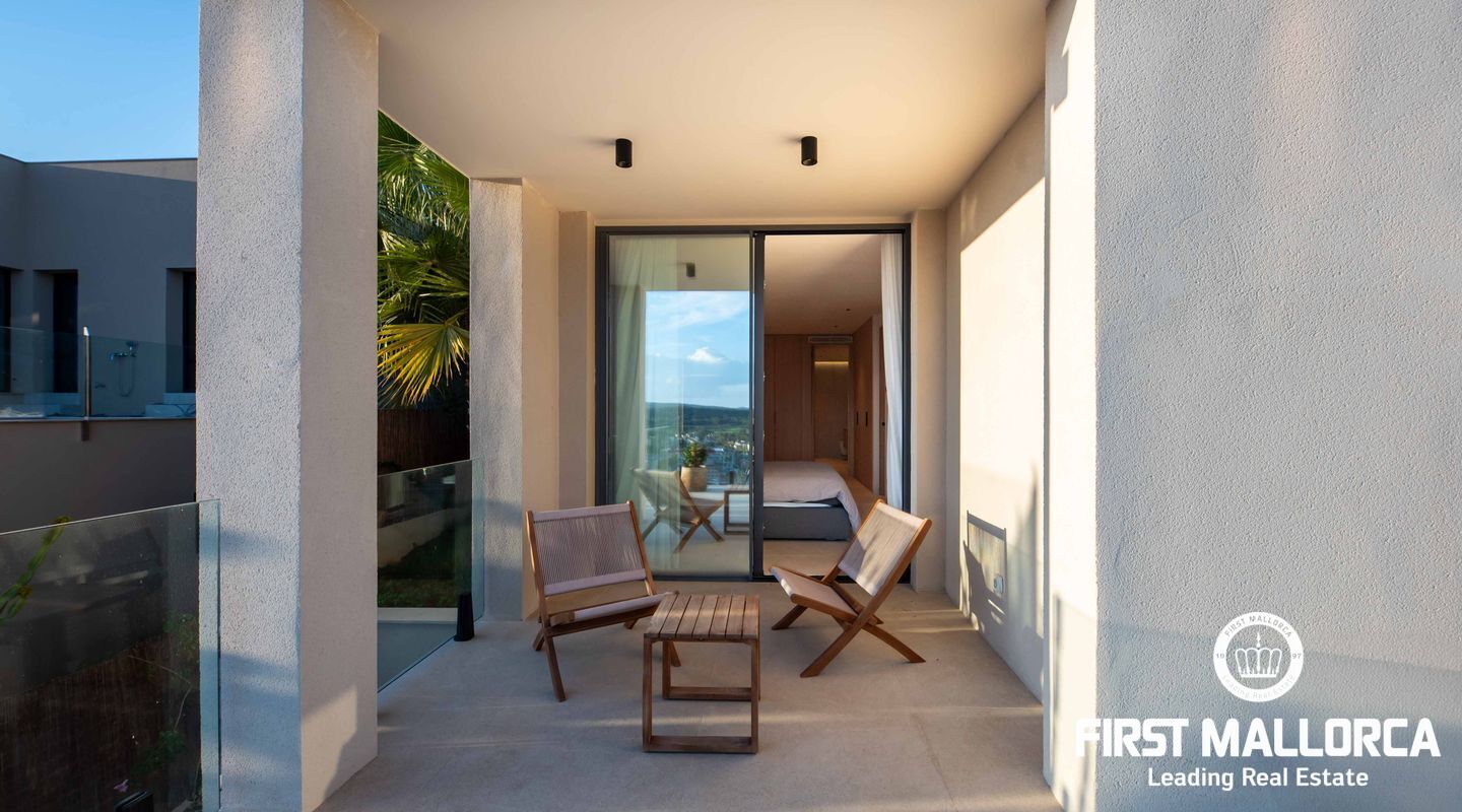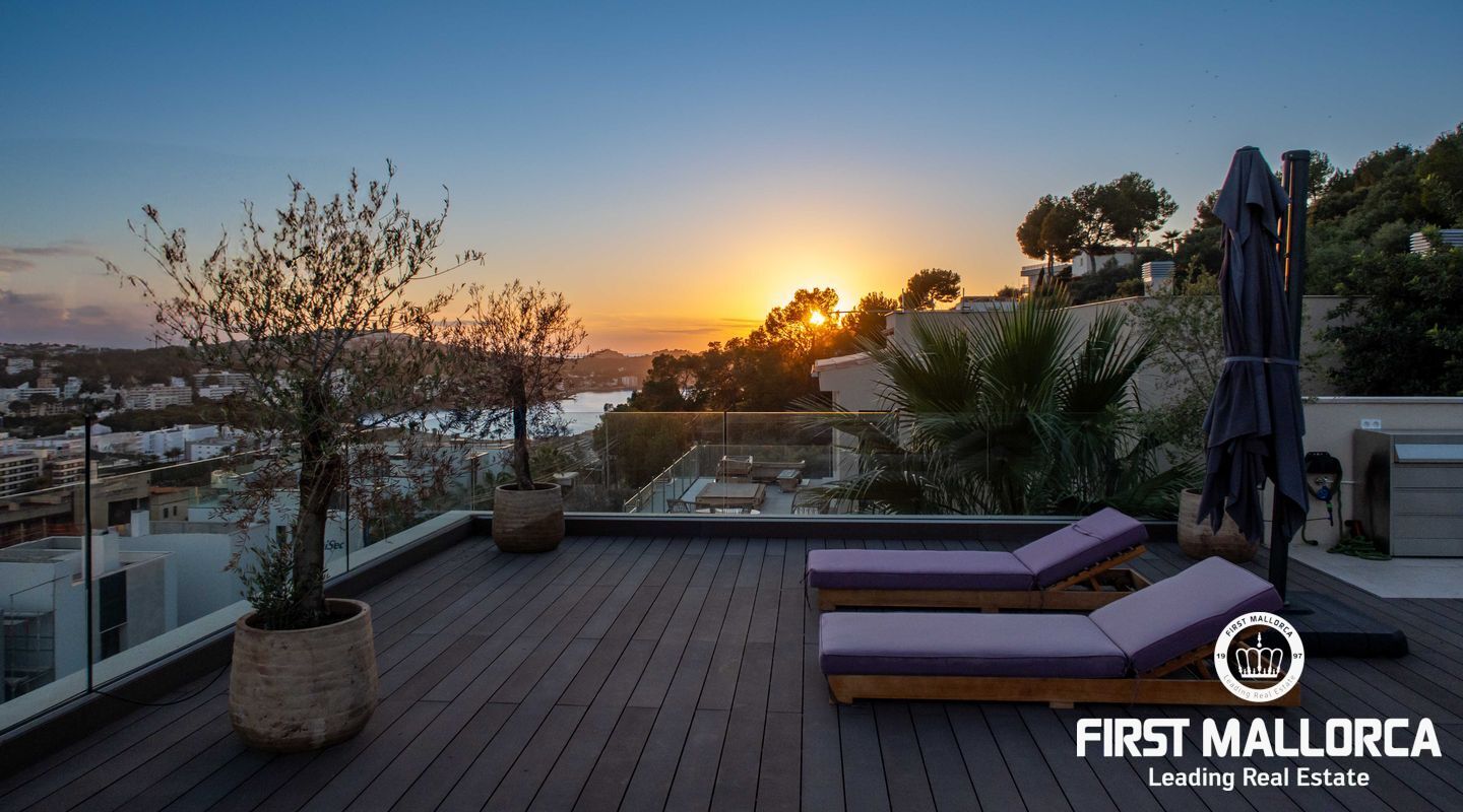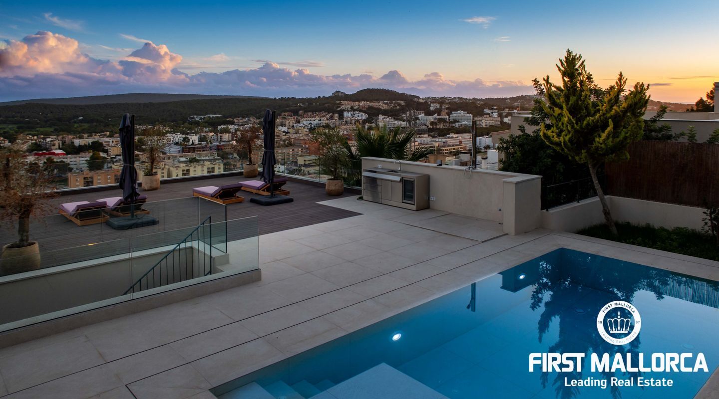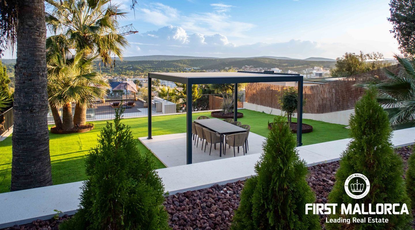 Über den Schlafräumen befinden sich drei großzügige grüne Terrassen. Die oberste Sonnenterrasse bietet einen ungestörten Blick auf Santa Ponsa und die Bucht, ergänzt durch einen Pool, eine Außenküche und einen Lounge-Bereich. Darunter lädt eine Ess-Terrasse mit Pergola und Grill zu Mahlzeiten im Freien ein. Solarzellen und üppige Bepflanzung runden das umweltfreundliche Design ab.