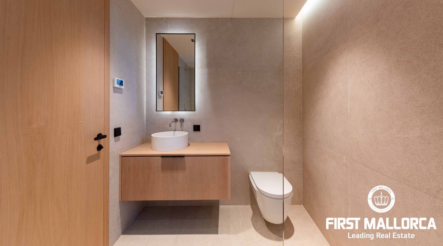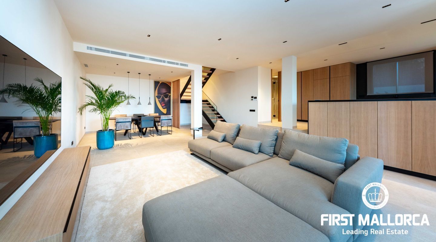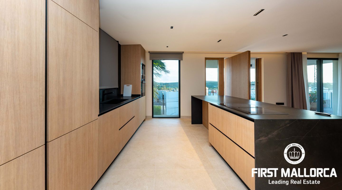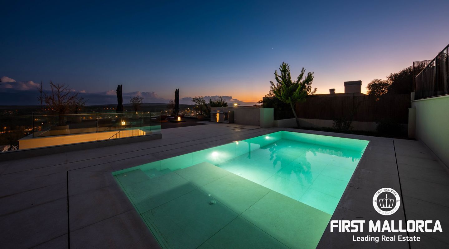 Über den Schlafräumen befinden sich drei großzügige grüne Terrassen. Die oberste Sonnenterrasse bietet einen ungestörten Blick auf Santa Ponsa und die Bucht, ergänzt durch einen Pool, eine Außenküche und einen Lounge-Bereich. Darunter lädt eine Ess-Terrasse mit Pergola und Grill zu Mahlzeiten im Freien ein. Solarzellen und üppige Bepflanzung runden das umweltfreundliche Design ab.