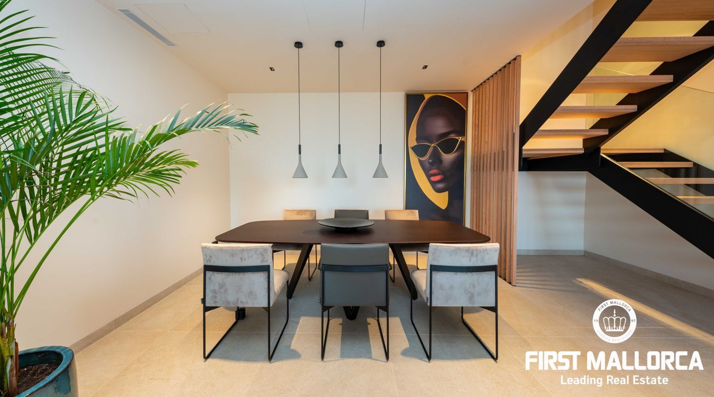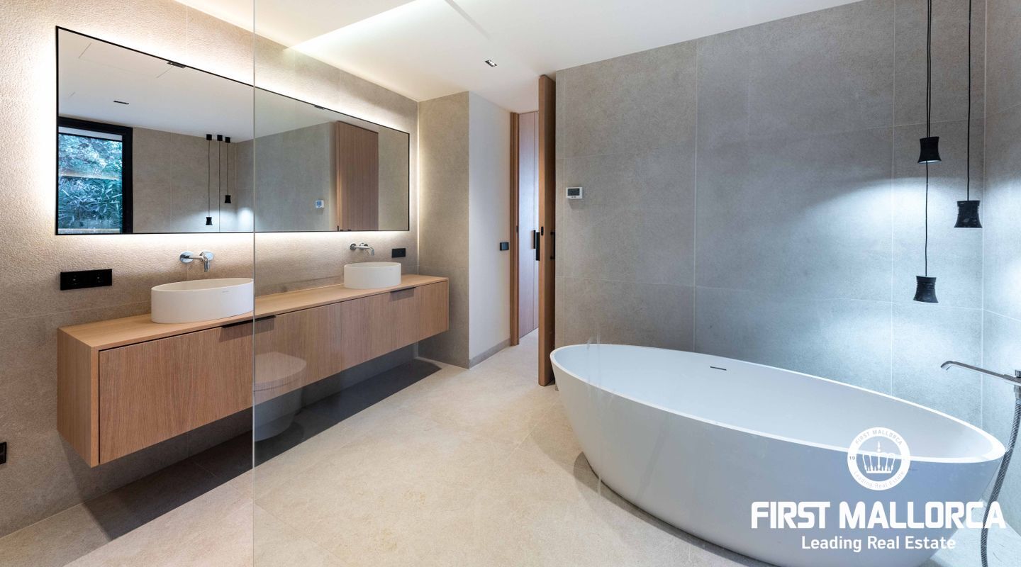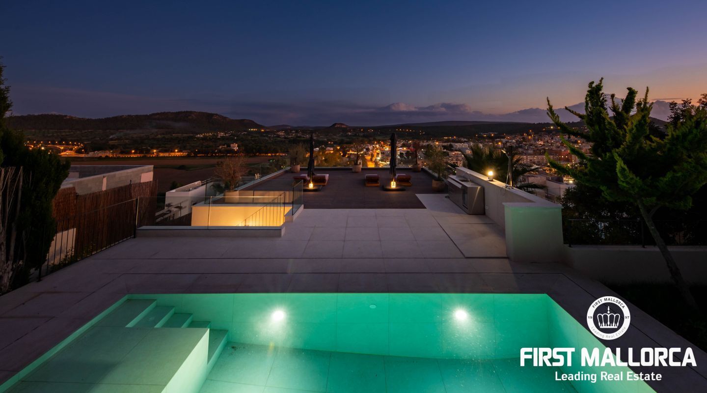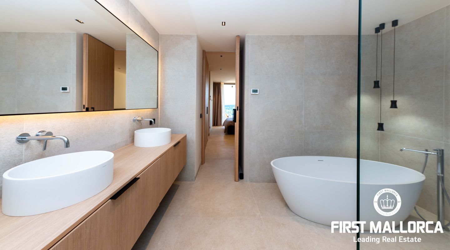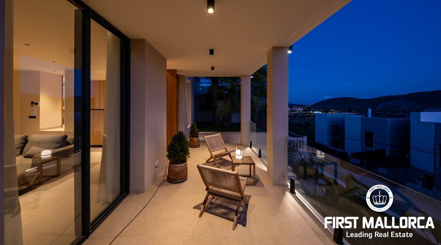 Die Villa erstreckt sich über zwei Etagen. Im Eingangsbereich befinden sich ein heller, offener Wohn- und Essbereich sowie eine voll ausgestattete Siemens-Küche mit stilvoller Kochinsel. Ein Badezimmer mit Dusche ergänzt diese Ebene. Im Obergeschoss erwarten Sie drei großzügige Schlafzimmer, darunter eine luxuriöse Master-Suite mit eigenem Bad, Doppelwaschbecken und einer privaten 24 m² großen Terrasse mit herrlichem Ausblick. Die beiden weiteren Schlafzimmer teilen sich ein modernes Badezimmer, wobei eines Zugang zur Terrasse hat und das andere über einen eigenen Balkon verfügt.