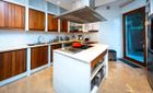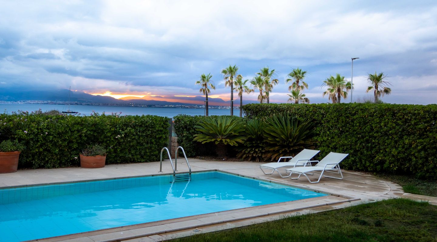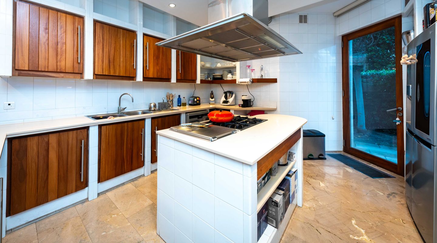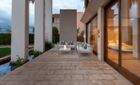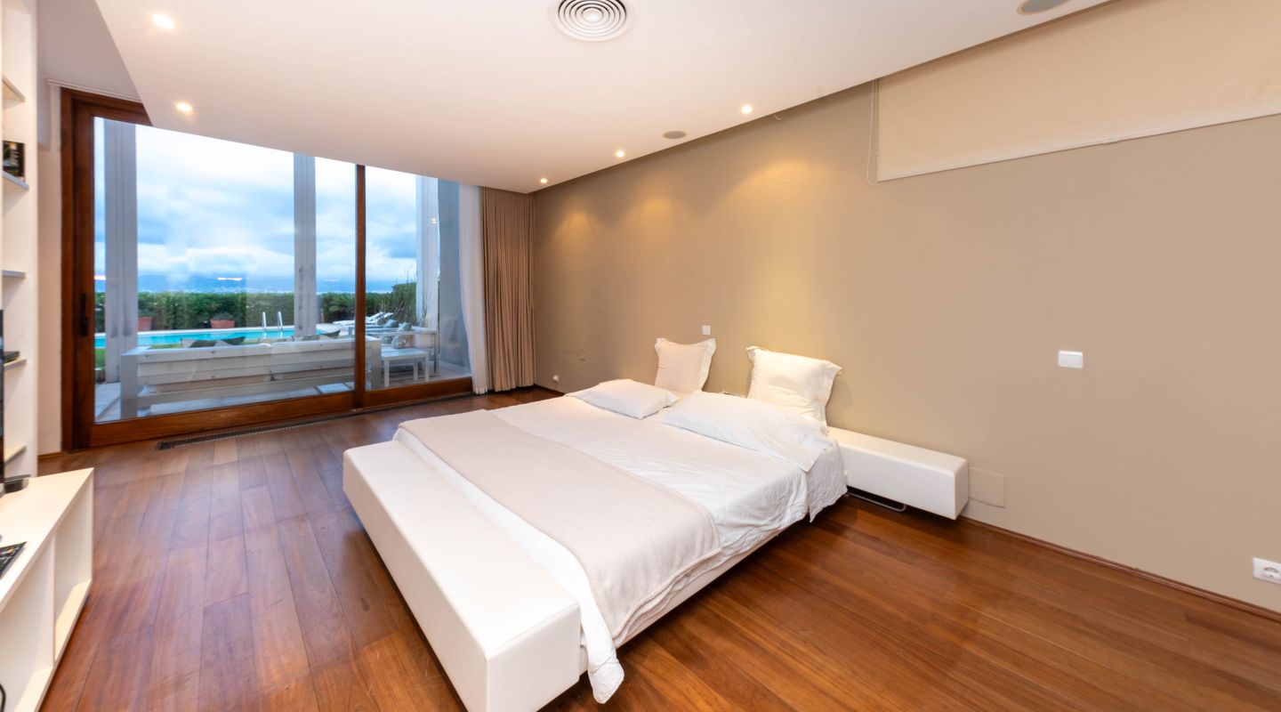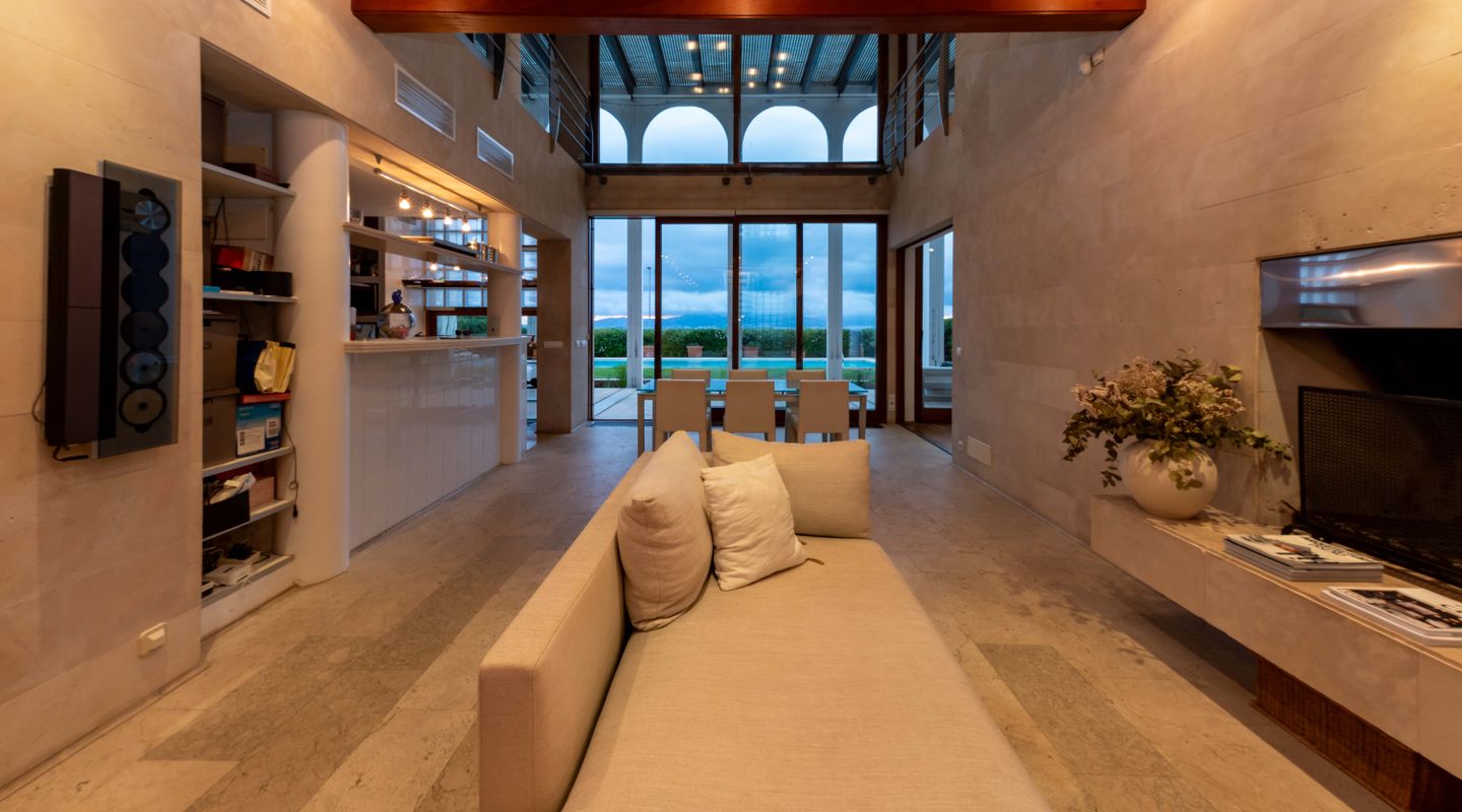 Sie verfügt über offene, durchlässige Räume, die ineinander übergehen, mit hohen Decken und großen Fenstern, die nach Südwesten ausgerichtet sind. Die beiden Master-Suiten und das obere Wohnzimmer verbinden sich visuell mit dem Mittelmeer, als ob wir auf einem Kreuzfahrtschiff der 1950er Jahre durch die Bucht fahren würden. Drei weitere große Schlafzimmer und drei Hauptbadezimmer vervollständigen das Ensemble, zusammen mit dem Wohnzimmer im Erdgeschoss mit Kamin und einer gemütlichen Küche mit Insel, die sich zum Esszimmer hin öffnet.