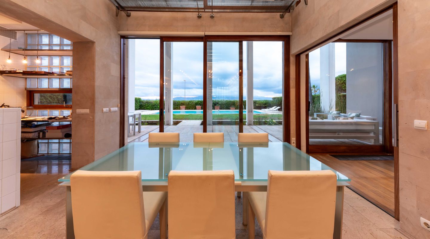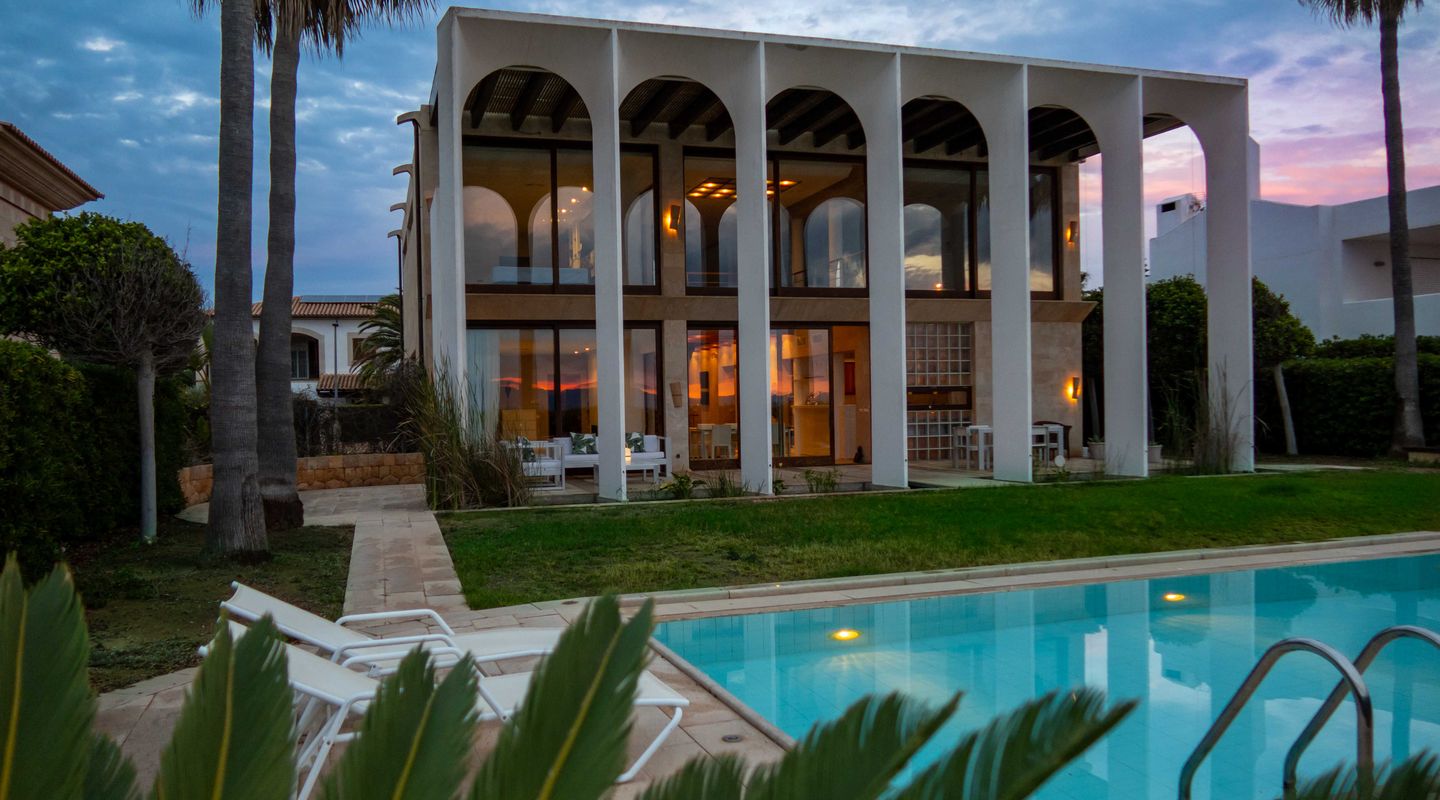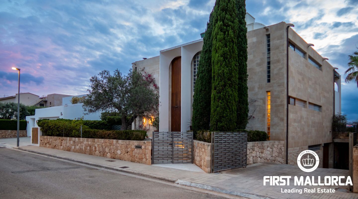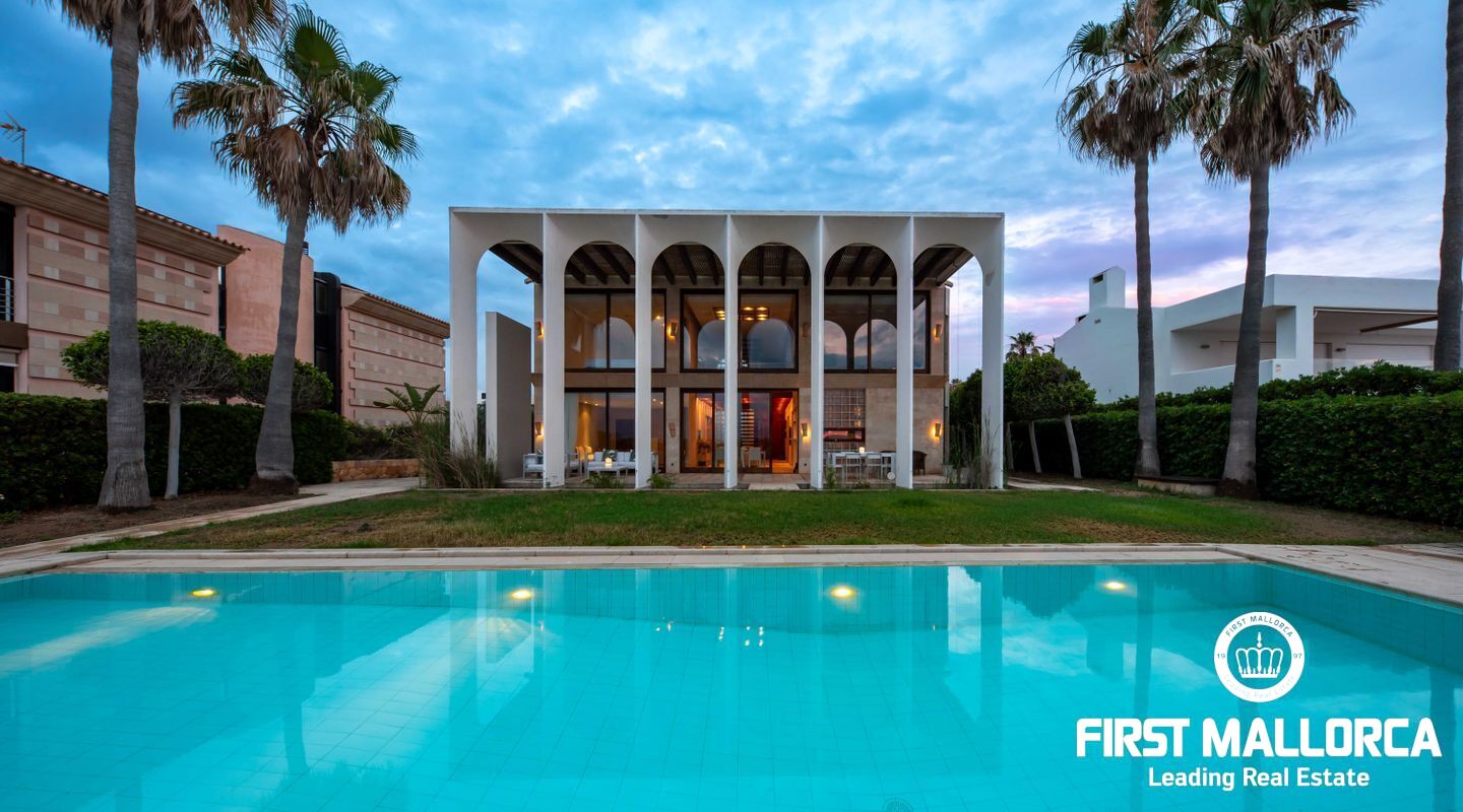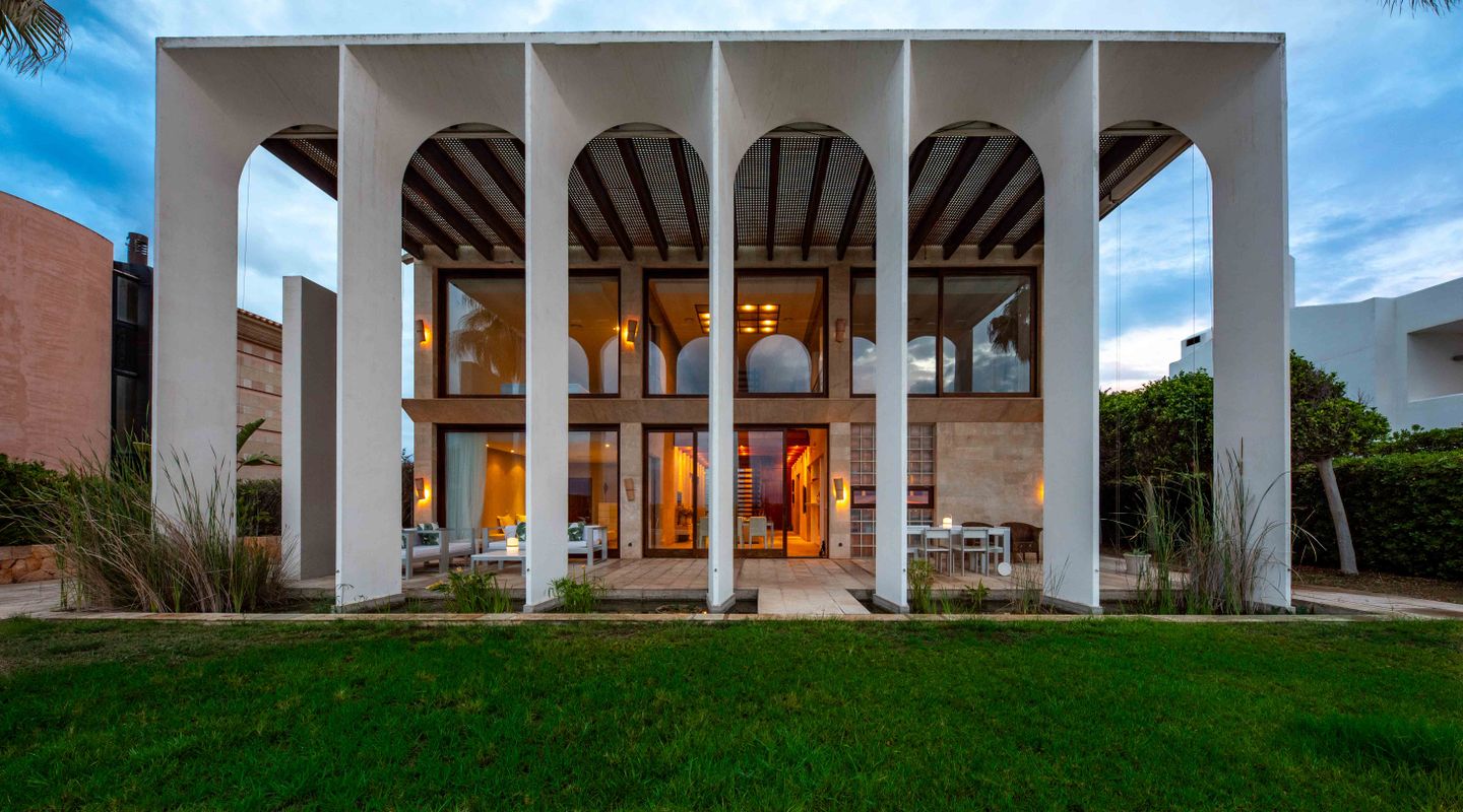 Das äußere und die architektonische Gestaltung sind von La Seu, der Kathedrale von Palma, inspiriert. Eine Reihe von Bögen an der maritimen Fassade verleiht dem Anwesen ein imposantes Aussehen, das sogar vom Meer aus leicht zu erkennen ist. Die Bögen ruhen über einem Teich, der zum Garten und dem 64 qm großen Swimmingpool führt. Zwischen den Bögen sind mit einem System von Rollen und Seilen große Sonnensegel wie die Segel eines Bootes gespannt, um die Hauptfassade in den sonnigsten Stunden, die in diesem Haus zahlreich sind, zu beschatten. Im Untergeschoss befinden sich mehrere Abstellräume, eine private Garage mit Platz für 5 Autos und technische Räume des Hauses.
