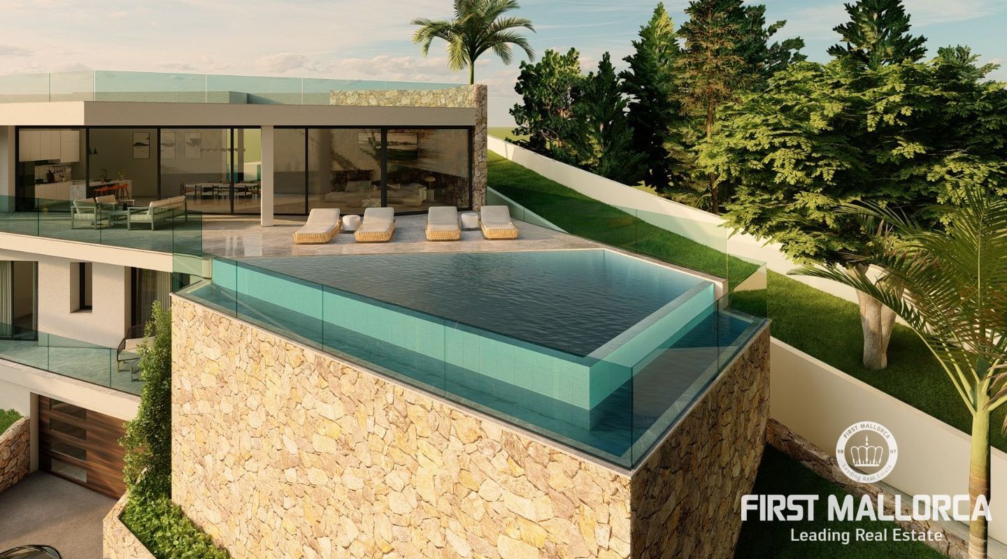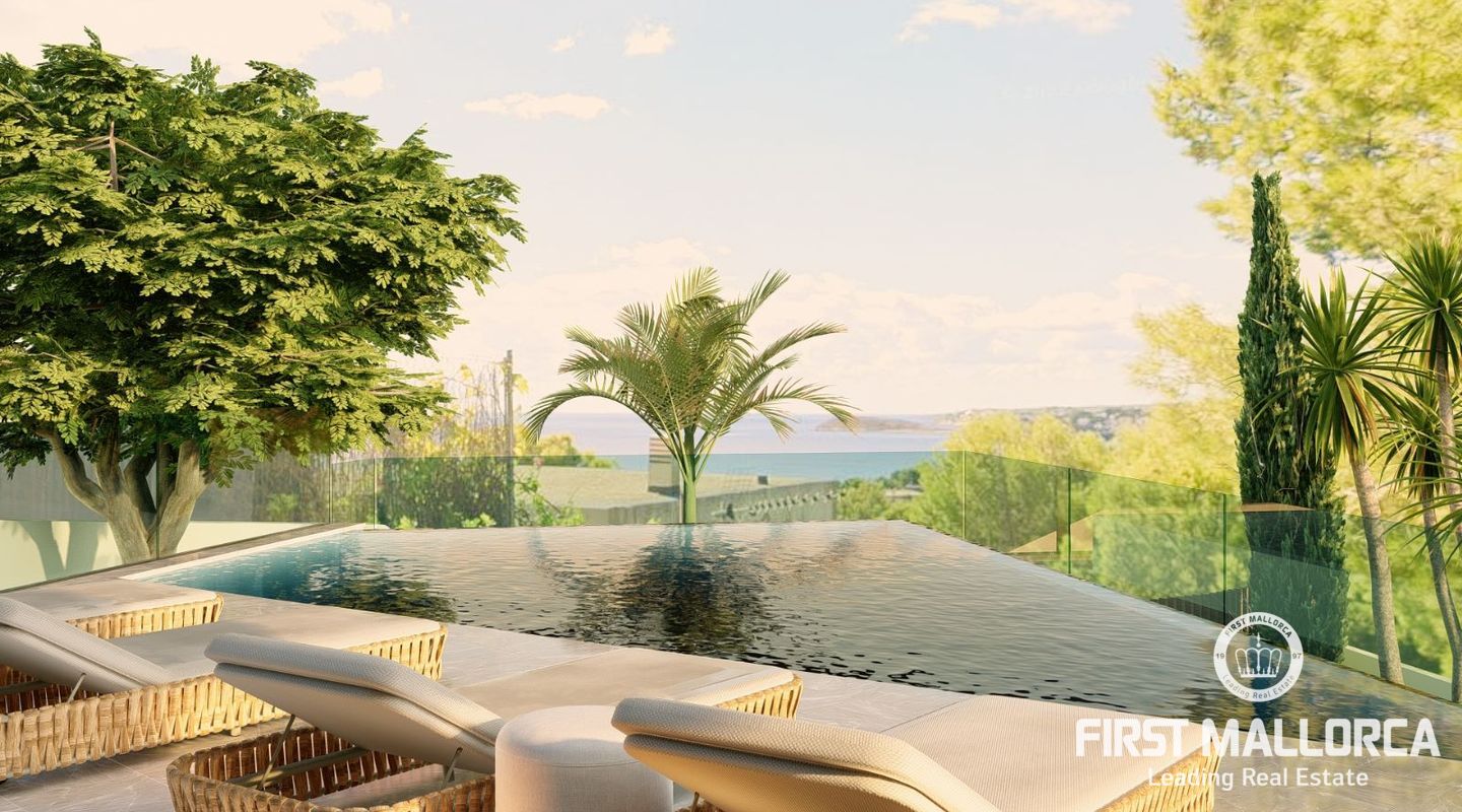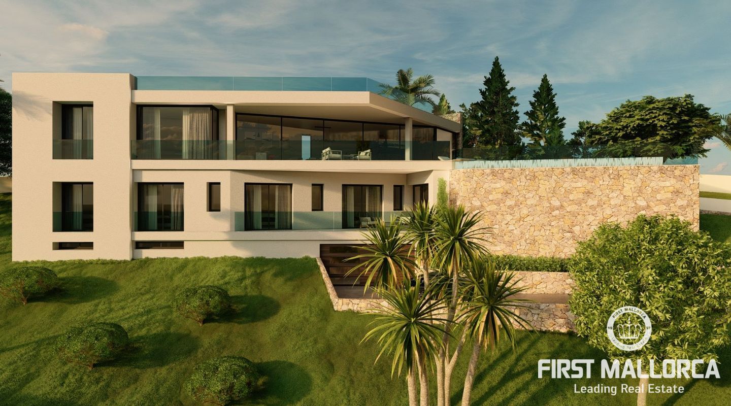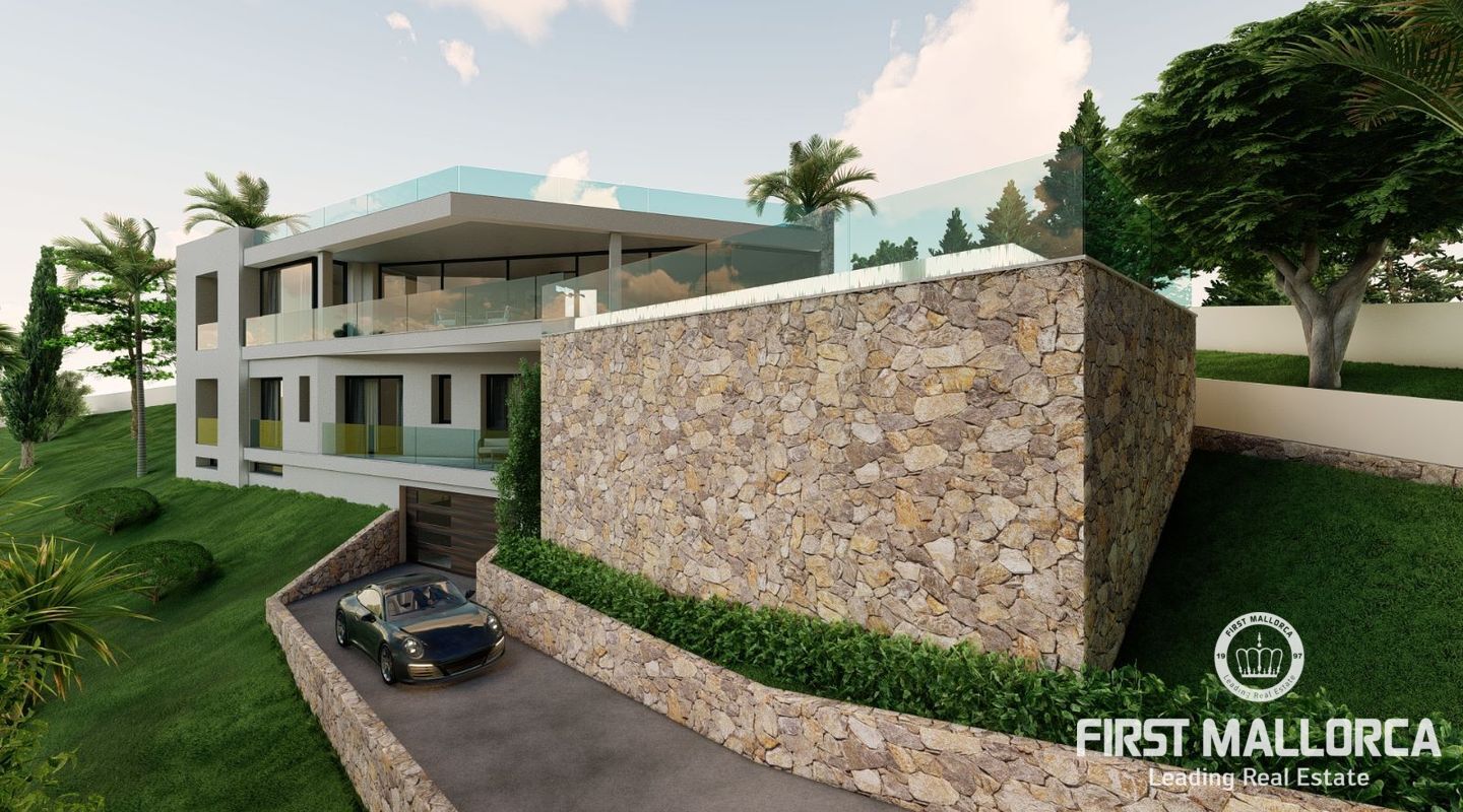 Diese Neubauvilla in Costa d'en Blanes wird zum Ende 2025 fertiggestellt sein und von der Wohnebene und vom Hauptschlafzimmer einen schönen Blick auf das Meer und den Hafen von Puerto Portals bieten. Durch ihre Lage am Ende einer ruhigen Wohnstraße und angrenzend an eine Grünzone ist das Grundstück ruhig und bietet eine hohe Privatsphäre. Der Neubau wird gekonnt modernes Design und mediterrane Stilelemente wie die partielle Verwendung von Naturstein vereinen. Im oberen Stockwerk werden der offene und dank bodentiefer Glasfenster helle Wohn-/Essbereich mit Kochinsel untergebracht. Auf dieser Ebene wird auch das großzügige Hauptschlafzimmer mit Ankleidebereich und Bad ensuite seinen Platz haben. Beide Bereiche dieser Ebene werden direkt an die Terrasse mit Pool anschließen, wodurch die Übergänge zwischen Innen und Außen fließend sein und dazu einladen werden, den mediterranen Lebensstil im Freien zu genießen. Im unteren Stockwerk werden die anderen 4 Schlafzimmer sein, alle mit Bad ensuite. 2 der Zimmer werden Zugang zu einer weiteren Terrasse bieten. Im Kellergeschoss ist eine Tiefgarage für 4 Pkw vorgesehen.