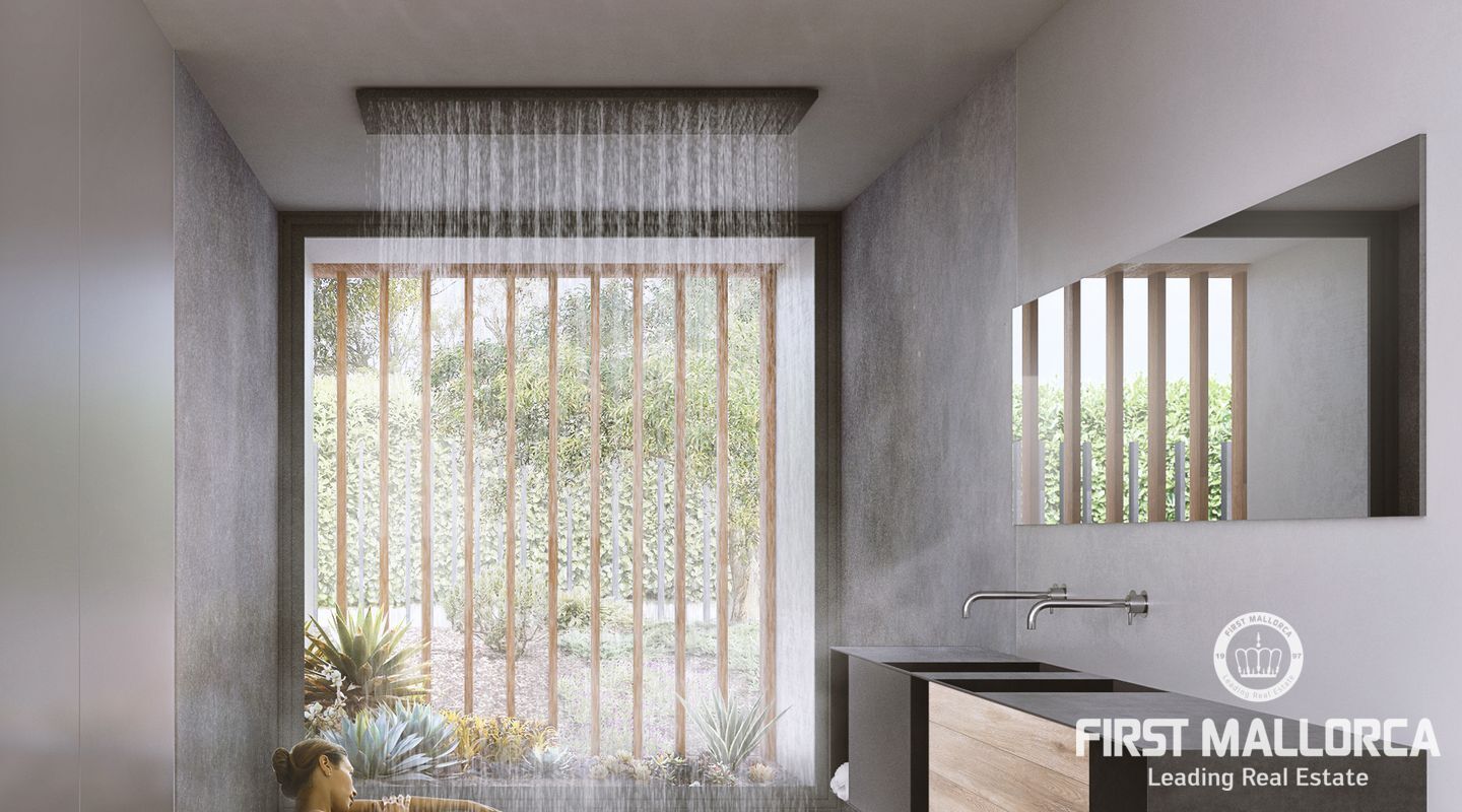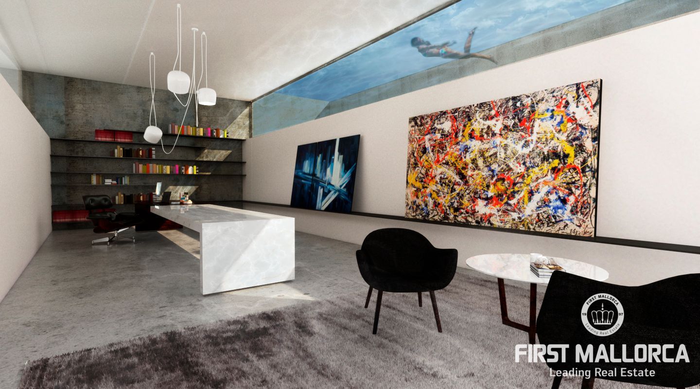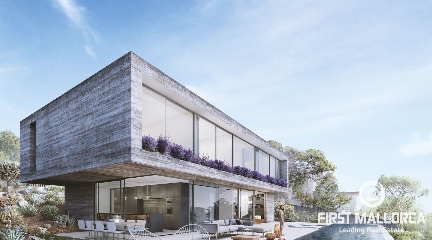 Der imposante Neubau befindet sich gerade im Bau und die Fertigstellung ist für 2023 geplant. Von allen Ebenen genießt man einen fantastischen Blick zum Meer. Im Erdgeschoss überzeugt der offene Wohn- und Essbereich durch eine Galerie von rund 6 Metern Höhe. Dieser Bereich schließt direkt an den flachen Garten mit Infinity-Pool an. Hier kann man die Sonne Mallorcas in vollen Zügen genießen. Eine Außenküche rundet diesen Bereich ab.