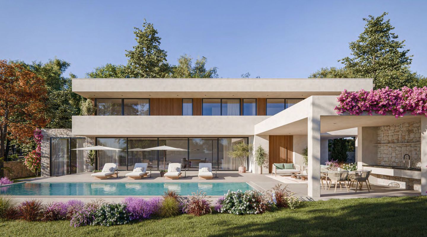 Auf einem 1.000 m² großen, sonnigen Gartengrundstück erhebt sich diese Villa mit klarer, eleganter Architektur und liebevollen mediterranen Akzenten. Geplant für die Fertigstellung im Sommer 2026, bietet sie rund 315 m² Wohnfläche auf zwei Ebenen – großzügig, hell und mit fließenden Übergängen zwischen Innen und Außen.