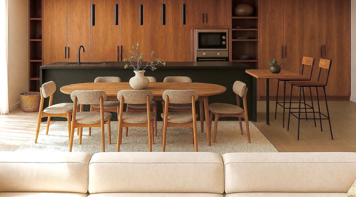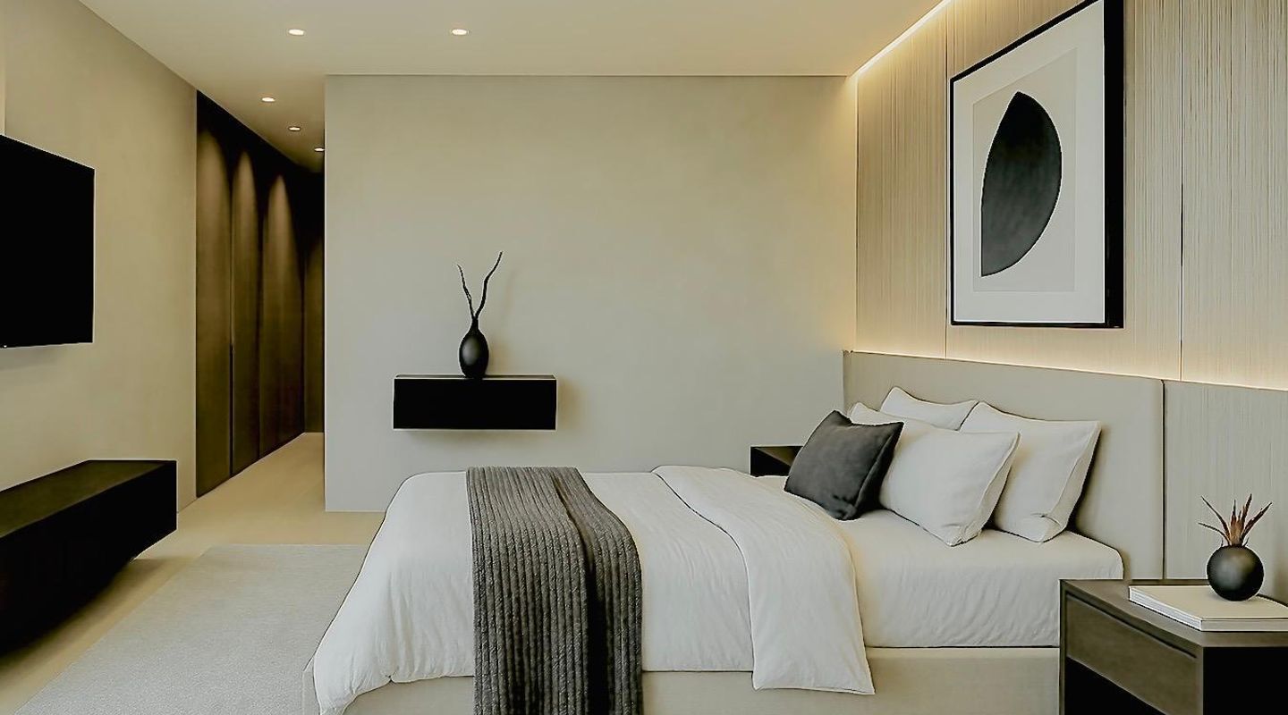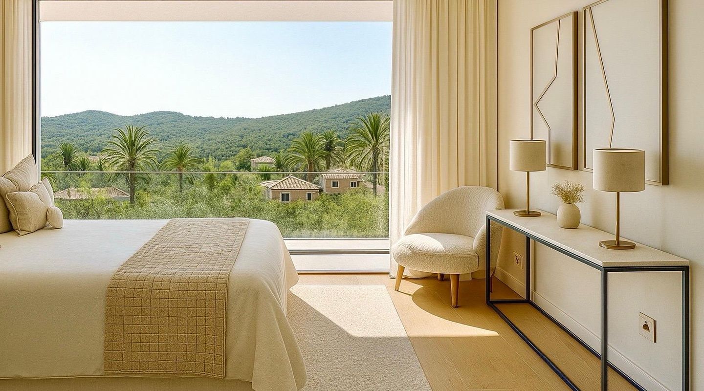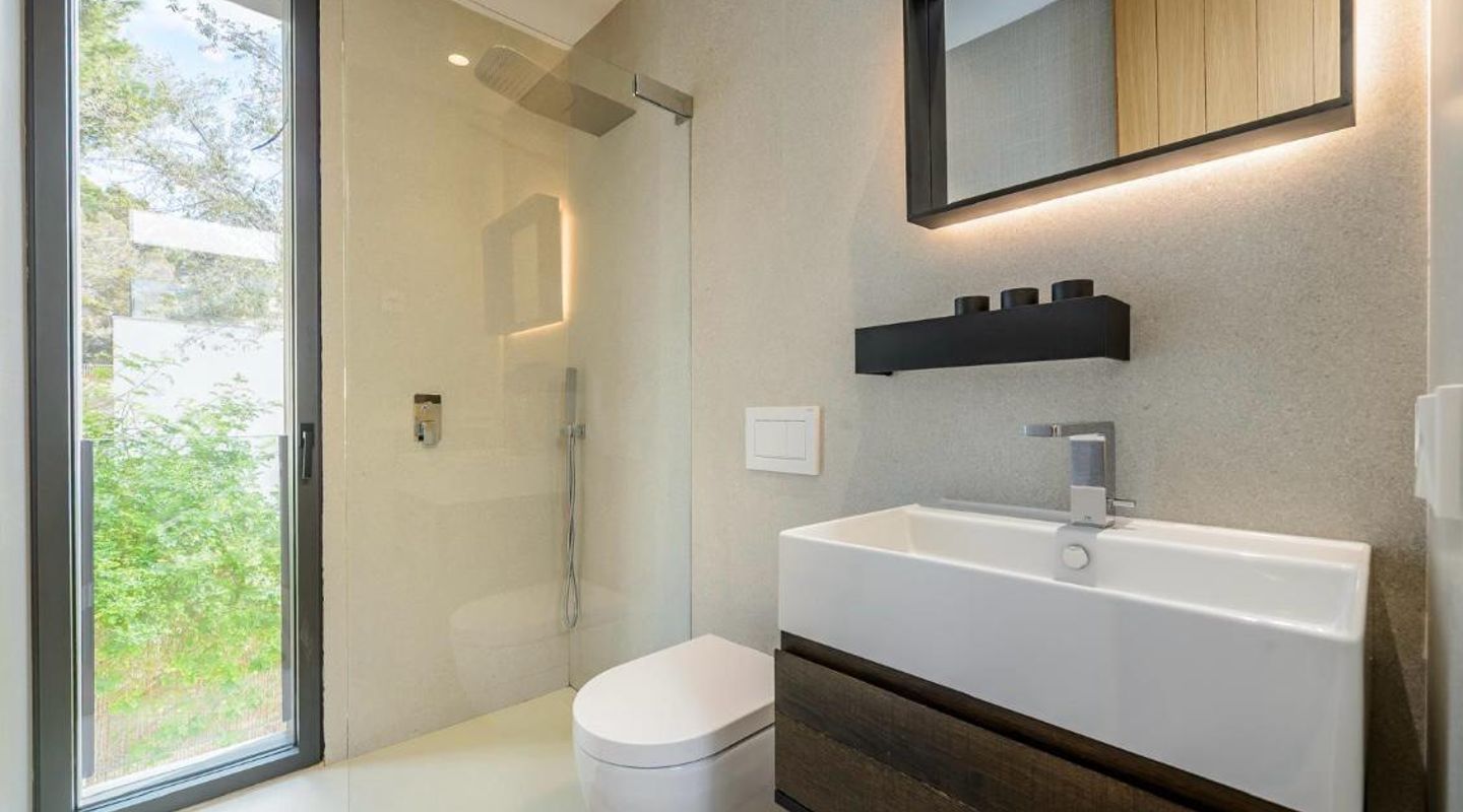 Im Inneren befinden sich fünf großzügige Schlafzimmer, jeweils mit eigenem Bad und privater Terrasse. Das Erdgeschoss umfasst einen offenen Wohn- und Essbereich mit moderner Einbauküche. Zusätzlich gibt es auf dieser Ebene ein flexibles Zimmer, das als Büro, Gästezimmer, Heimkino oder Hobbyraum genutzt werden kann – mit eigenem Bad und Gäste-WC.