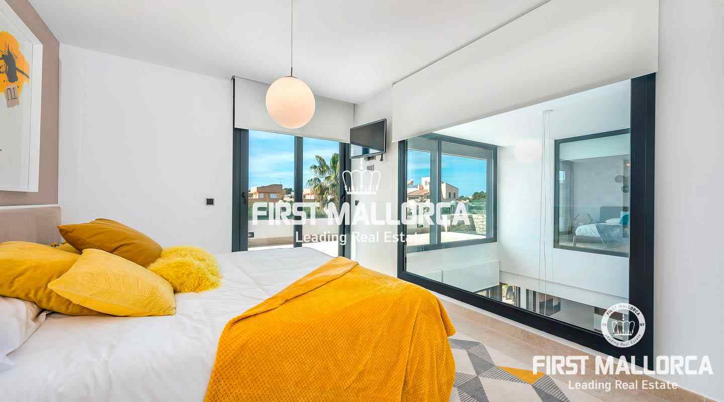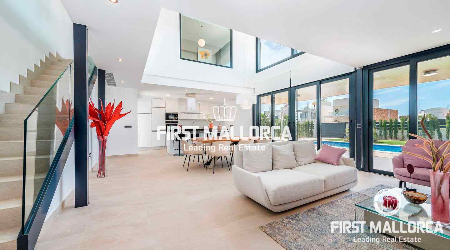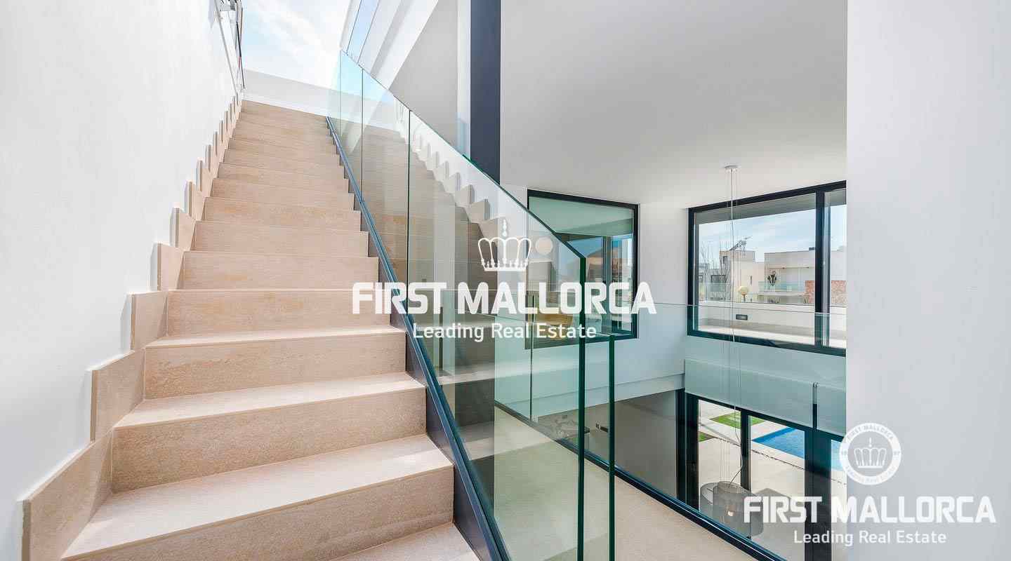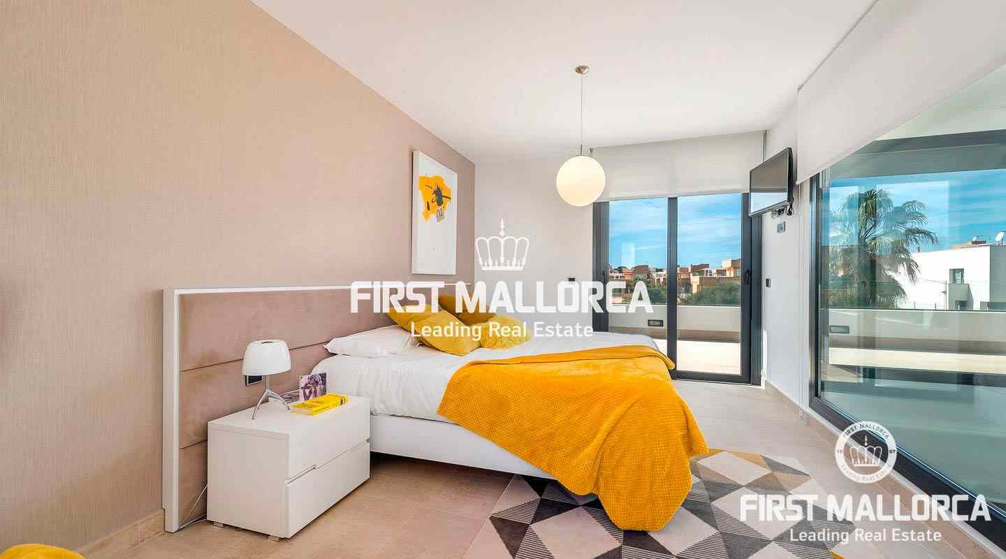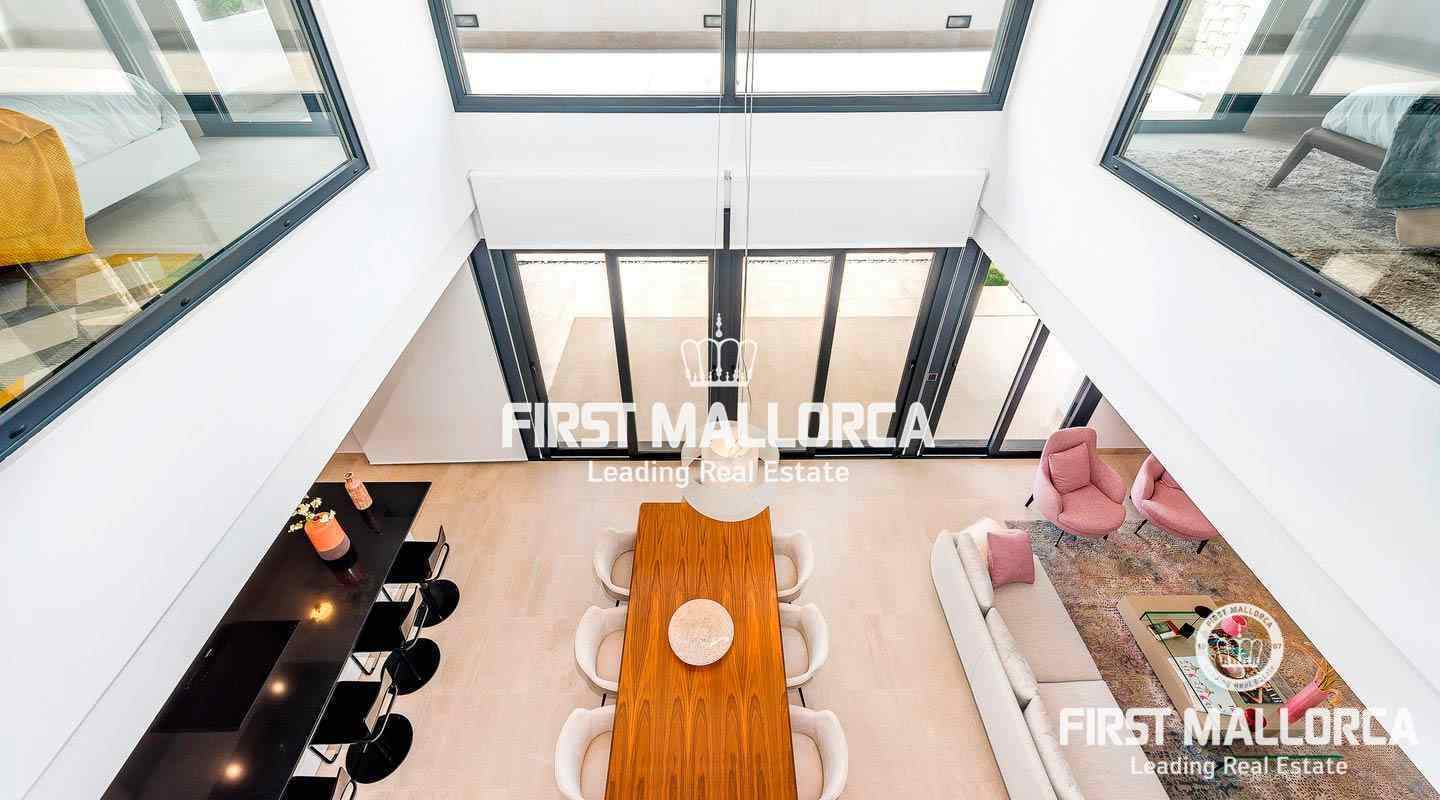 Im Erdgeschoss steht ein offener Wohn-/ Essbereich mit Küche zur Verfügung. Das Highlight hier ist die Galerie mit doppelter Raumhöhe im Essbereich. Bodentiefe Fenster ermöglichen direkten Zugang zum Garten, welcher dank Pool der perfekte Ort zum Entspannen und Abkühlen ist. Auf dieser Etage befinden sich darüber hinaus ein Schlafzimmer, ein Bad sowie ein Hauswirtschaftsraum. Im Obergeschoss gibt es weitere 2 Schlafzimmer mit Ankleide, Bad en Suite und Zugang zur einer Terrasse, auf welcher Sie die Sonne Mallorcas genießen können. Einen weiteren Sonnenplatz bietet die Dachterrasse mit Blick auf den Hafen. Zudem verfügt jede Immobilie über eine Garage.