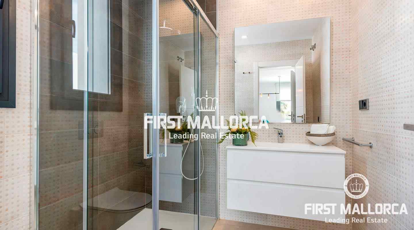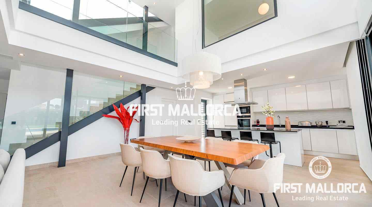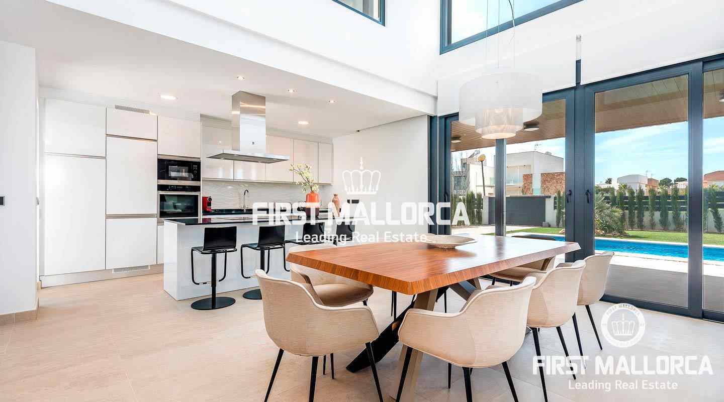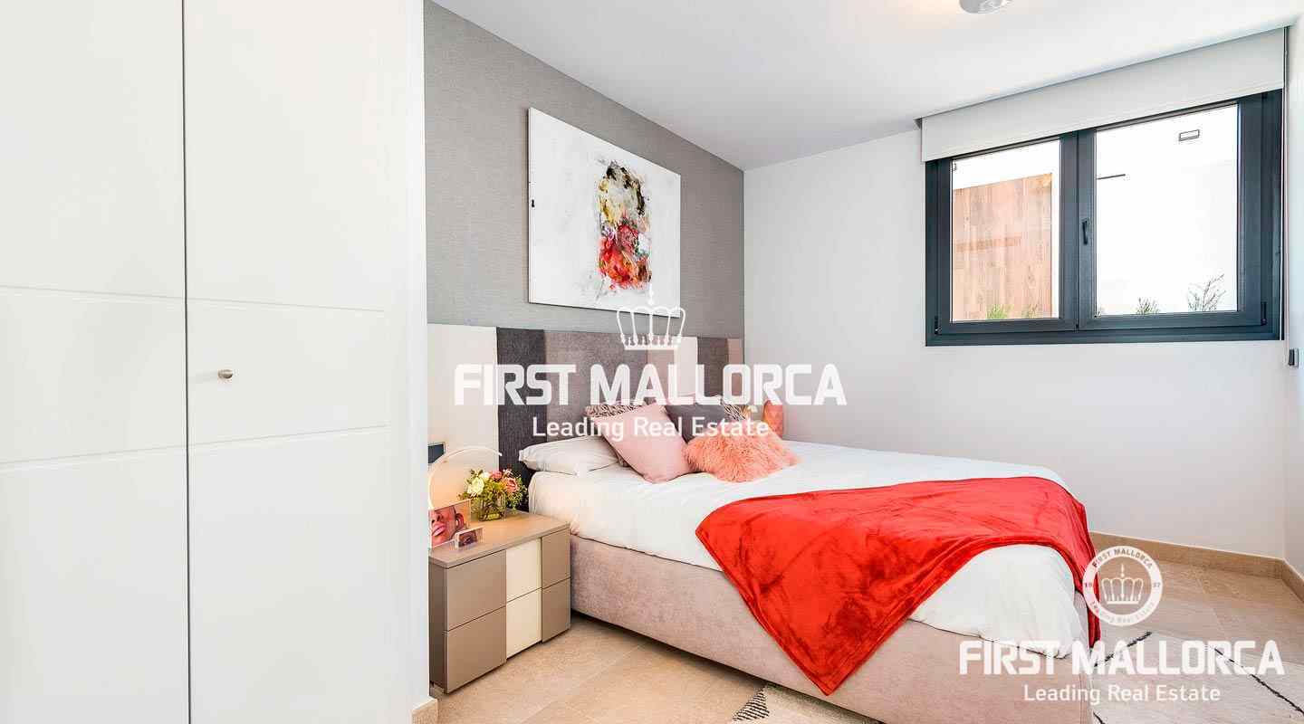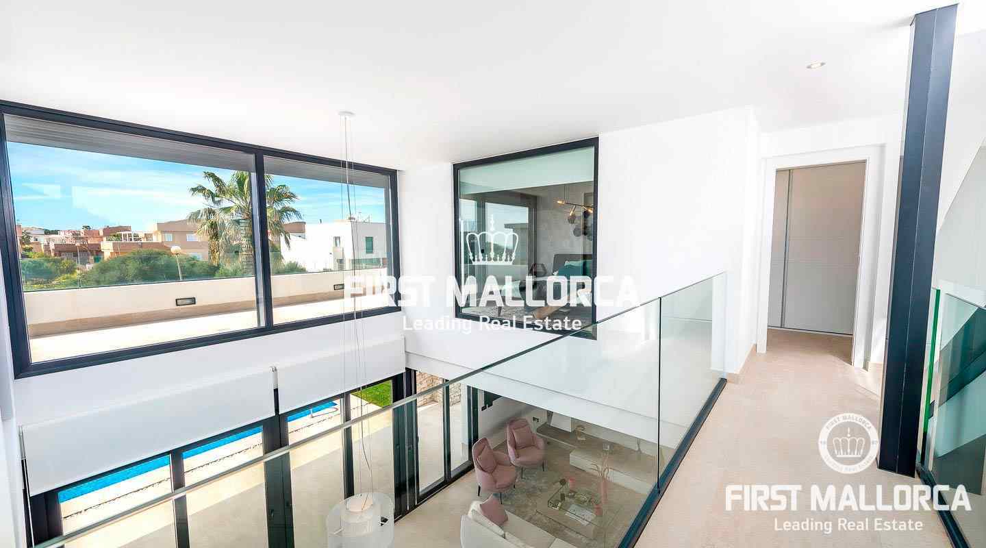 Im Erdgeschoss steht ein offener Wohn-/ Essbereich mit Küche zur Verfügung. Das Highlight hier ist die Galerie mit doppelter Raumhöhe im Essbereich. Bodentiefe Fenster ermöglichen direkten Zugang zum Garten, welcher dank Pool der perfekte Ort zum Entspannen und Abkühlen ist. Auf dieser Etage befinden sich darüber hinaus ein Schlafzimmer, ein Bad sowie ein Hauswirtschaftsraum. Im Obergeschoss gibt es weitere 2 Schlafzimmer mit Ankleide, Bad en Suite und Zugang zur einer Terrasse, auf welcher Sie die Sonne Mallorcas genießen können. Einen weiteren Sonnenplatz bietet die Dachterrasse mit Blick auf den Hafen. Zudem verfügt jede Immobilie über eine Garage.