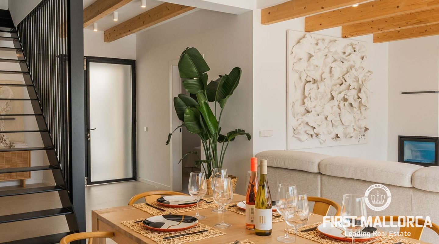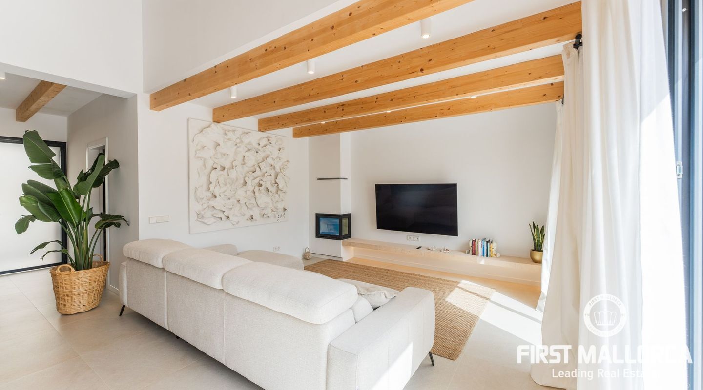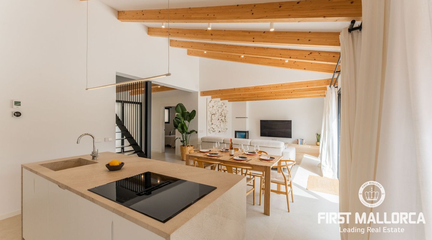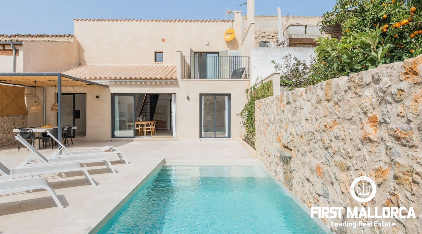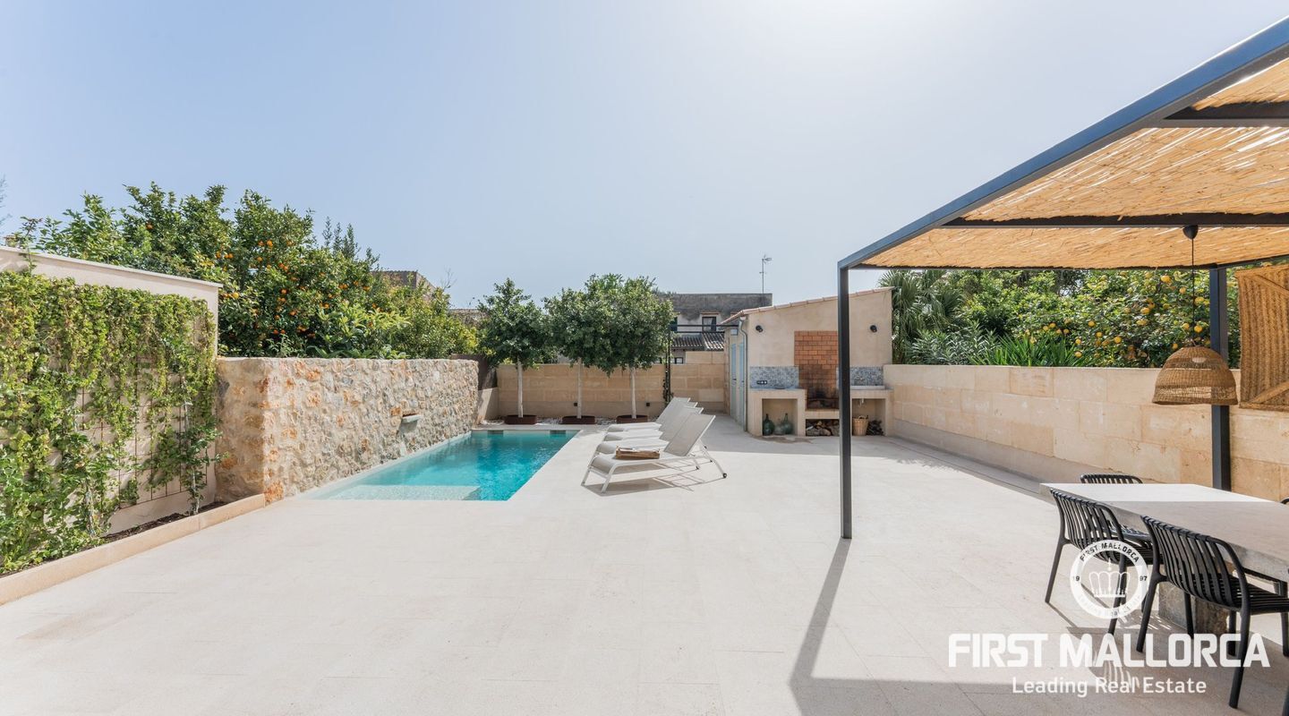 Das Anwesen ist über zwei Ebenen verteilt. Im Erdgeschoss haben wir ein gemütliches Wohn-Esszimmer mit Kamin und eine voll ausgestattete offene Küche, die zu einem geräumigen Innenhof mit Swimmingpool führt, wo wir eine Außendusche und einen Chill-out-Bereich finden können.