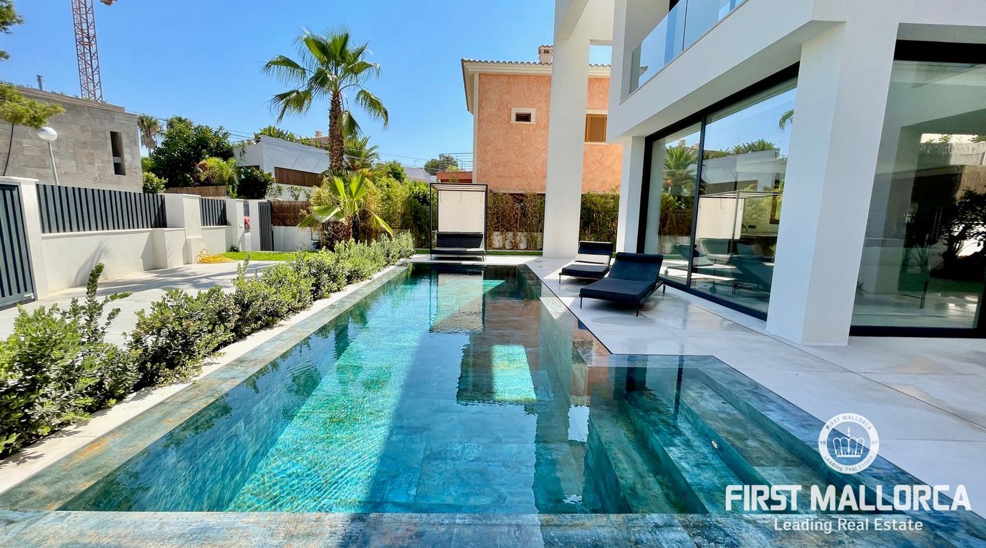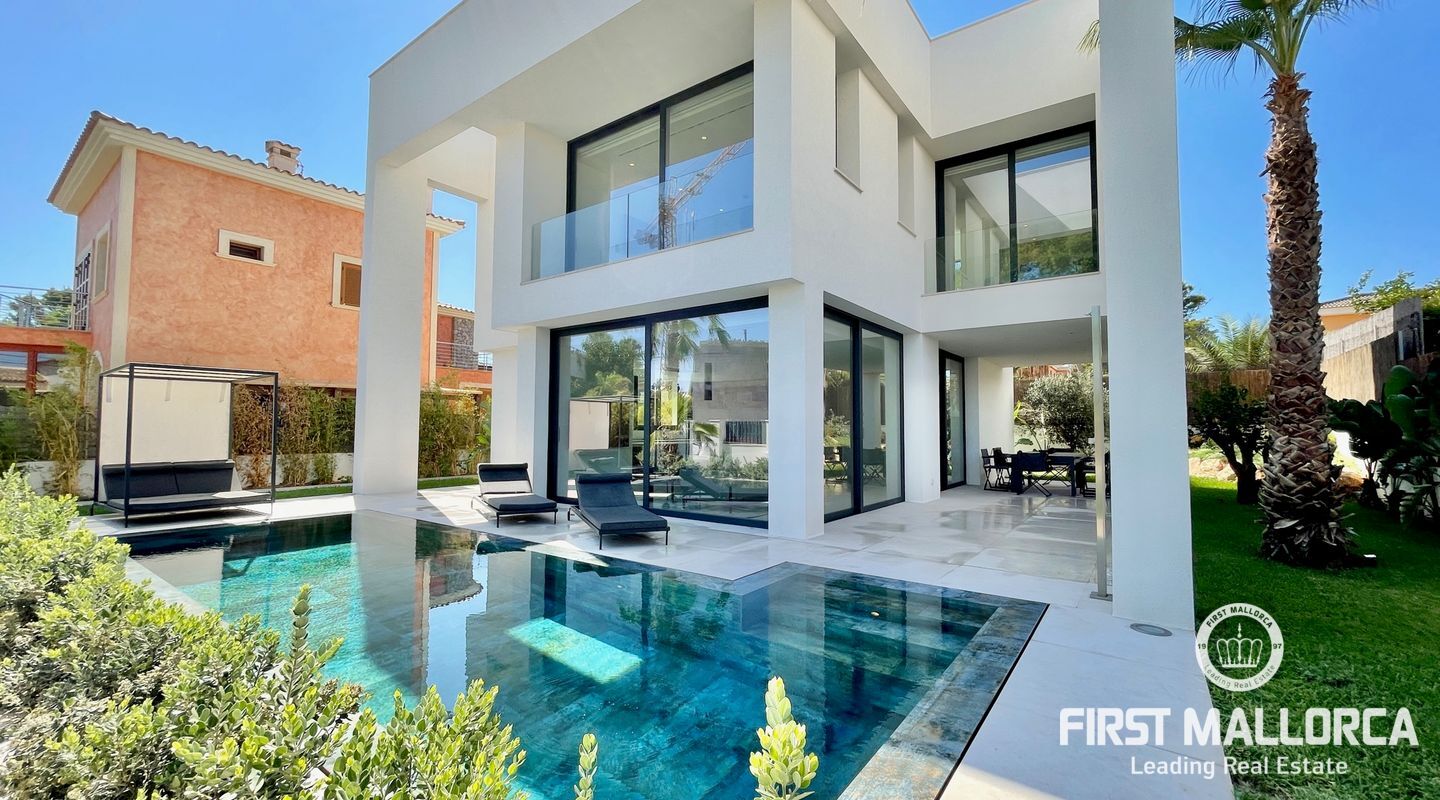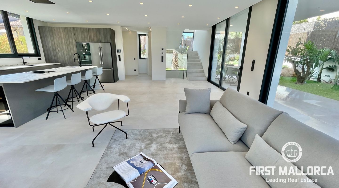 Diese helle Villa punktet nicht nur mit der Top-Lage, sondern bietet 338 qm bebaute Fläche, 3 Schlafzimmer jeweils mit Bad ensuite, sowie ein weiteres Gäste-WC. Sie verfügt über eine voll ausgestattete und hochwertige Küche, sowie einen offenen und hell gestalteten Wohn-Essbereich mit Zugang zum Außenbereich mit Sonnenterrasse und Pool.