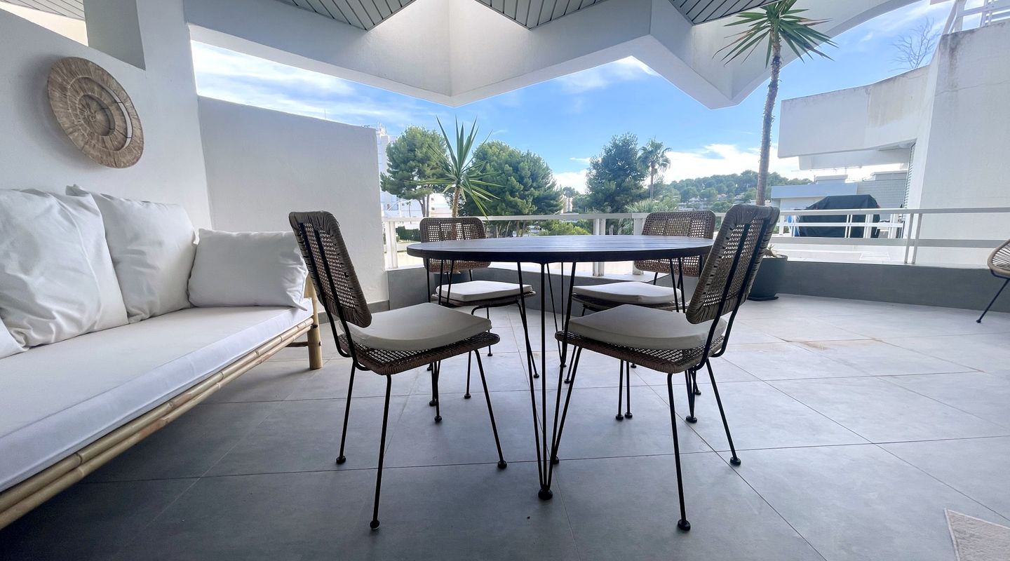 The 18 m² south-facing terrace provides a stunning view of the well-kept community complex with pool and partially of the picturesque Cala Vinyes bay – a perfect place to enjoy sunrises and sunsets, have breakfast outdoors, or unwind in the evening with a glass of wine.