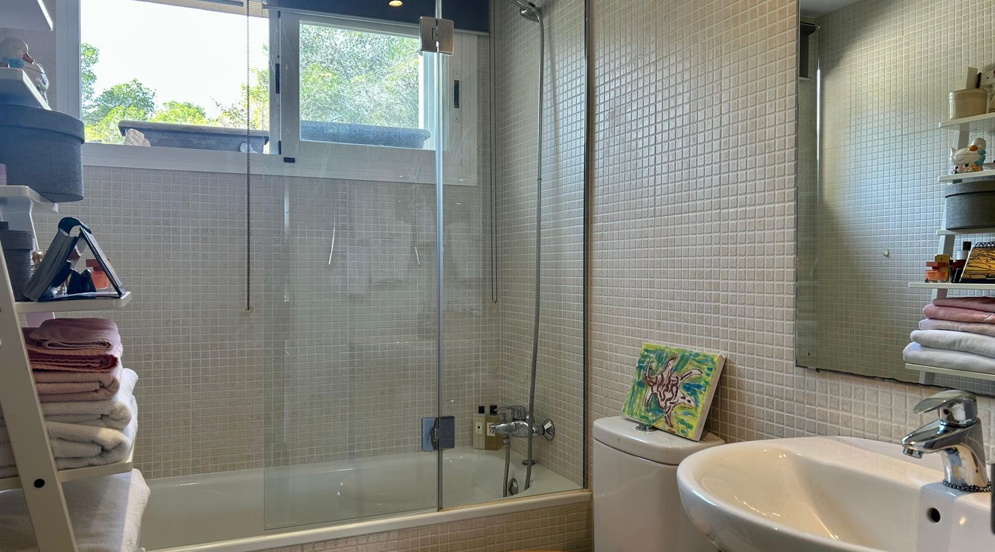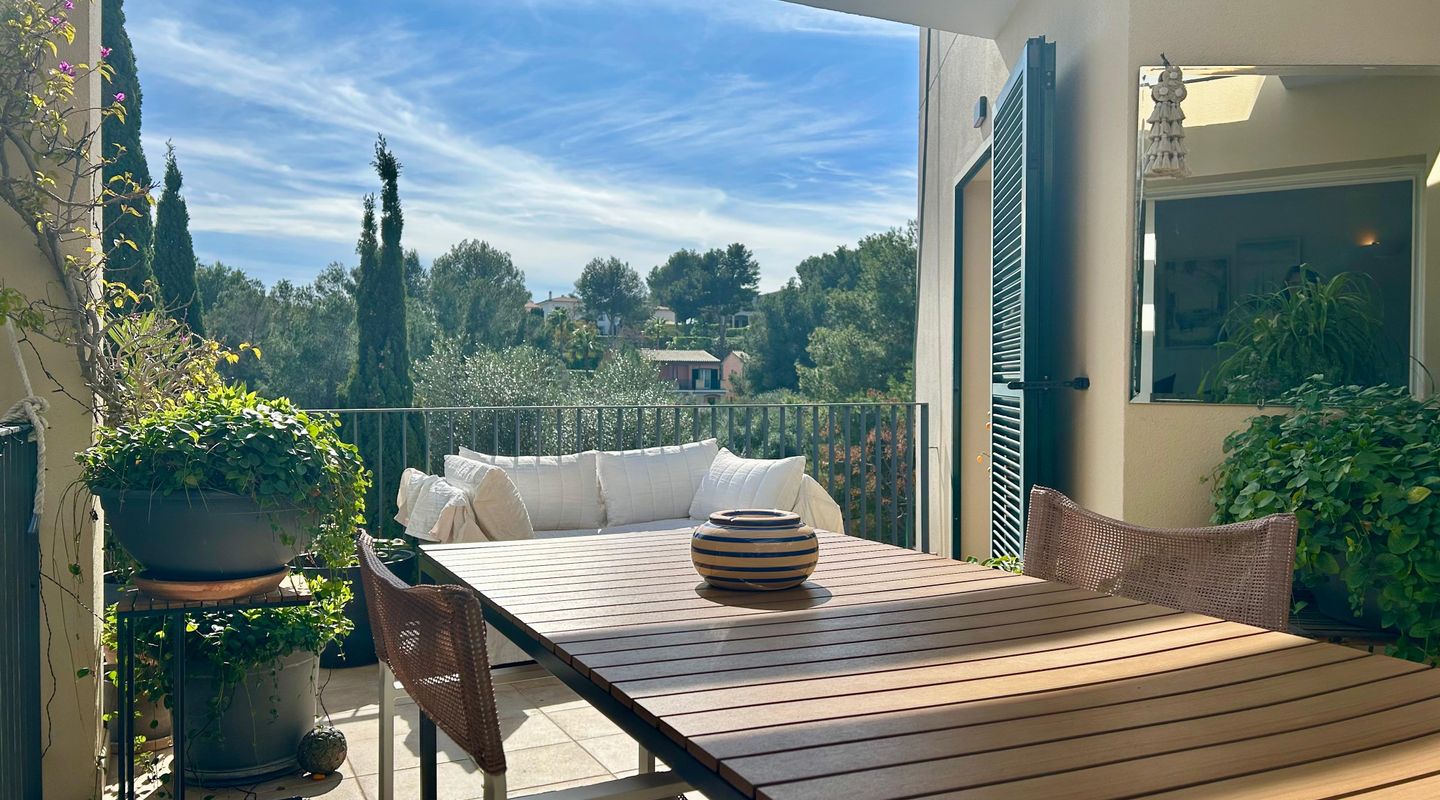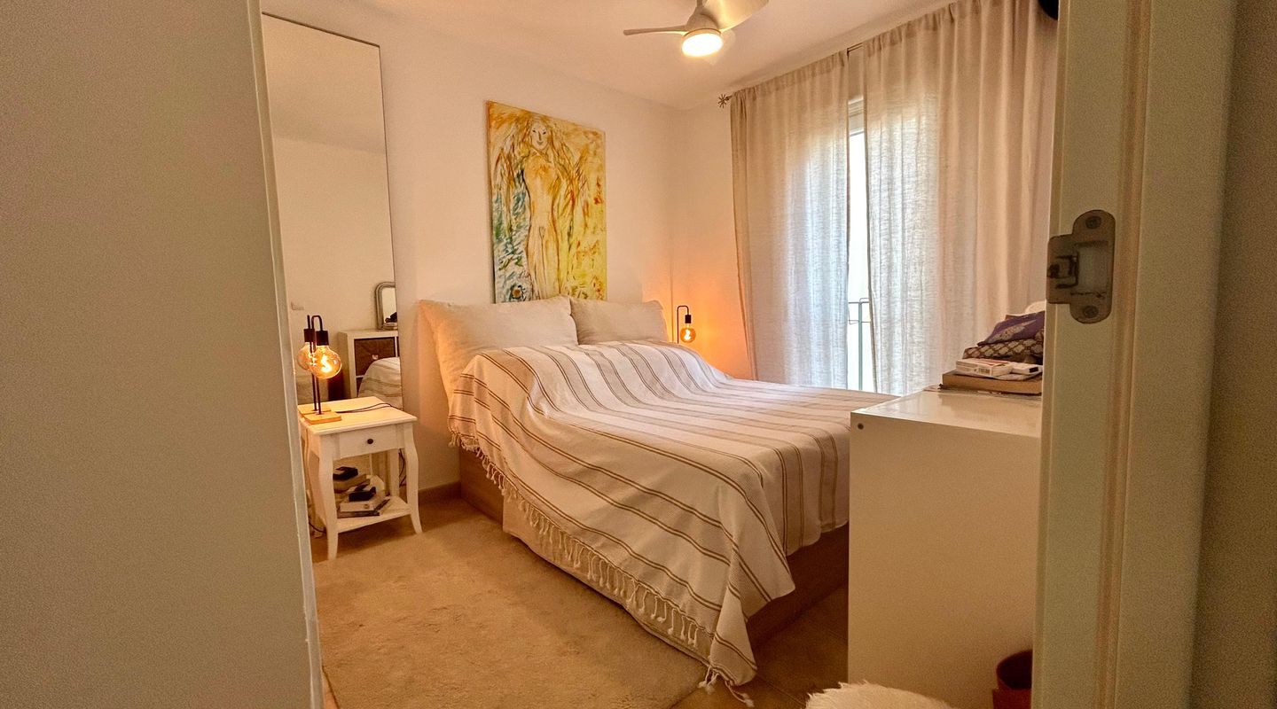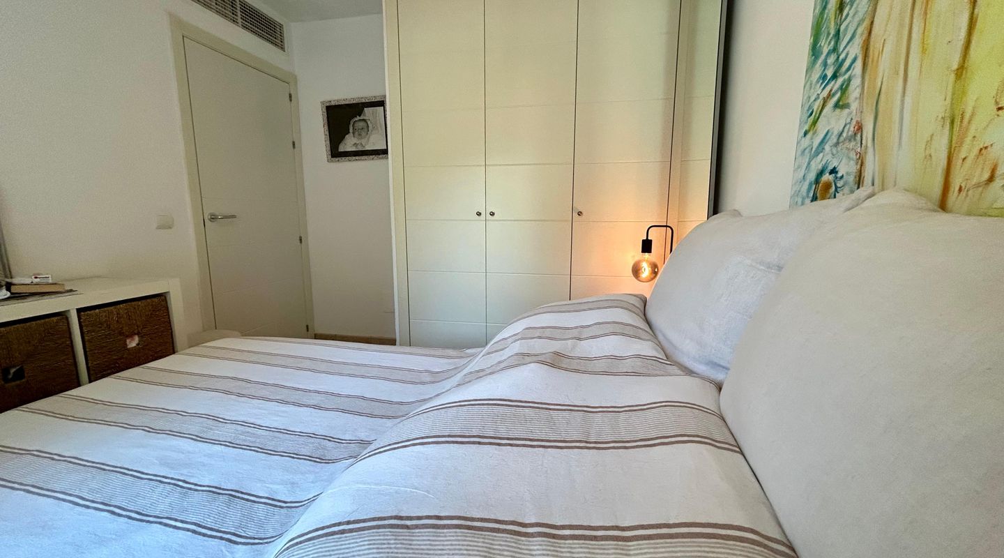 This bright apartment, decorated in a warm and personal style that will make you feel at home from the very first moment, offers a practical and functional layout. It features two comfortable bedrooms equipped with ceiling fans, one of them with direct access to the terrace, and two full bathrooms, one with a bathtub and the other with a shower. The kitchen is fully equipped with modern appliances for your convenience. The cozy living-dining room connects directly to the crown jewel of the home: a fantastic private terrace with unobstructed views of the pine forest, ideal for relaxing on its sofas or enjoying open-air dinners under the pergola. Additionally, you can cool off in the communal pool surrounded by green areas.