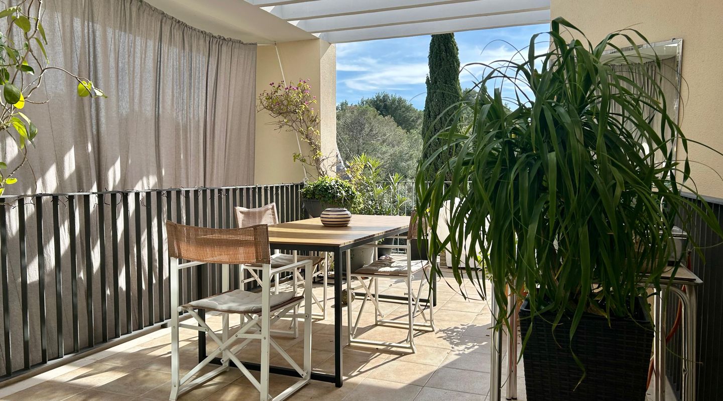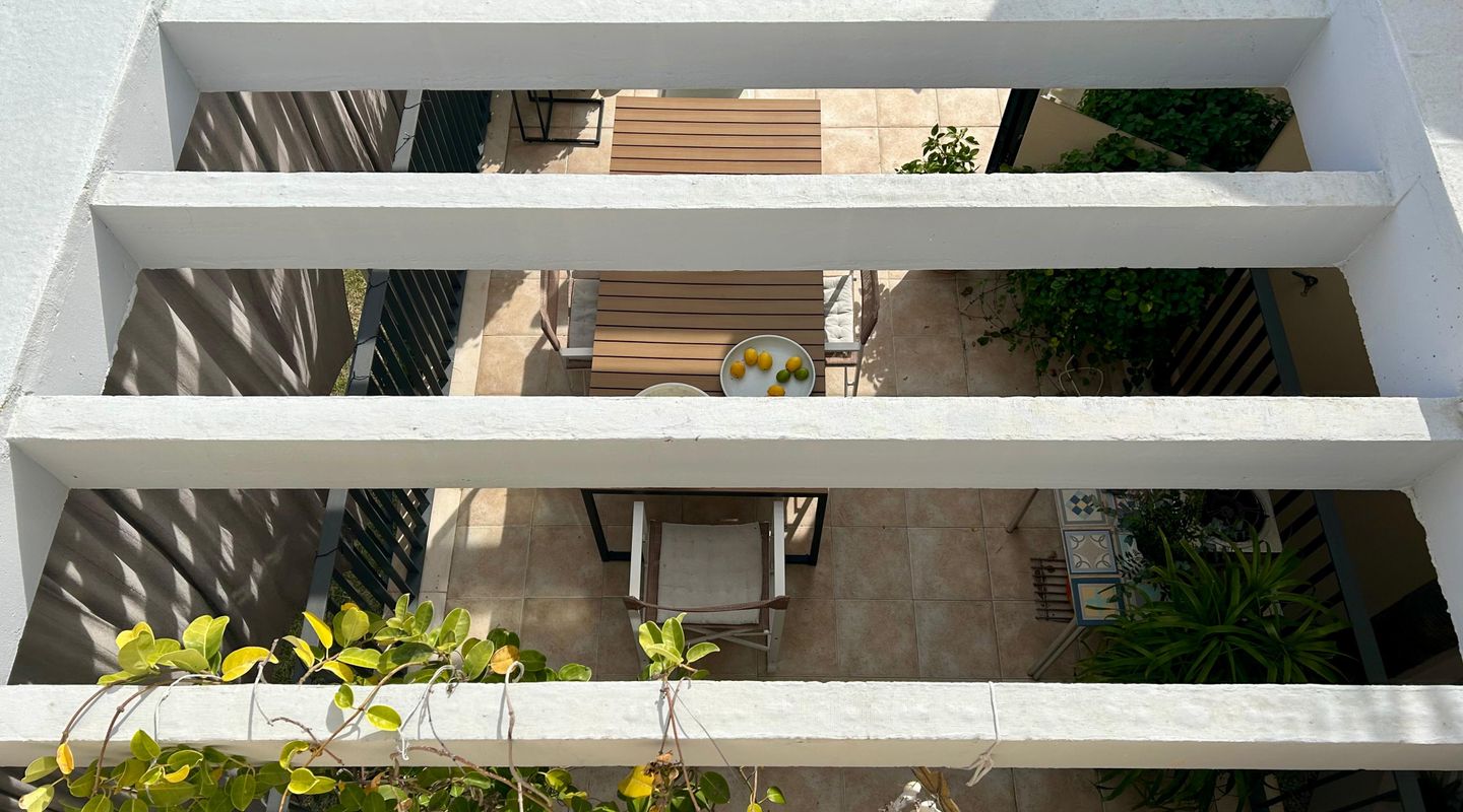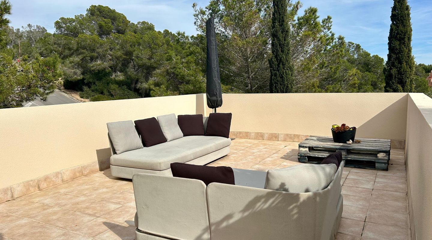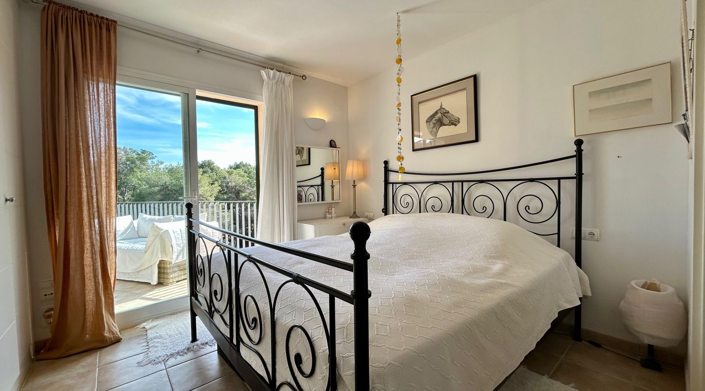 This bright apartment, decorated in a warm and personal style that will make you feel at home from the very first moment, offers a practical and functional layout. It features two comfortable bedrooms equipped with ceiling fans, one of them with direct access to the terrace, and two full bathrooms, one with a bathtub and the other with a shower. The kitchen is fully equipped with modern appliances for your convenience. The cozy living-dining room connects directly to the crown jewel of the home: a fantastic private terrace with unobstructed views of the pine forest, ideal for relaxing on its sofas or enjoying open-air dinners under the pergola. Additionally, you can cool off in the communal pool surrounded by green areas.
