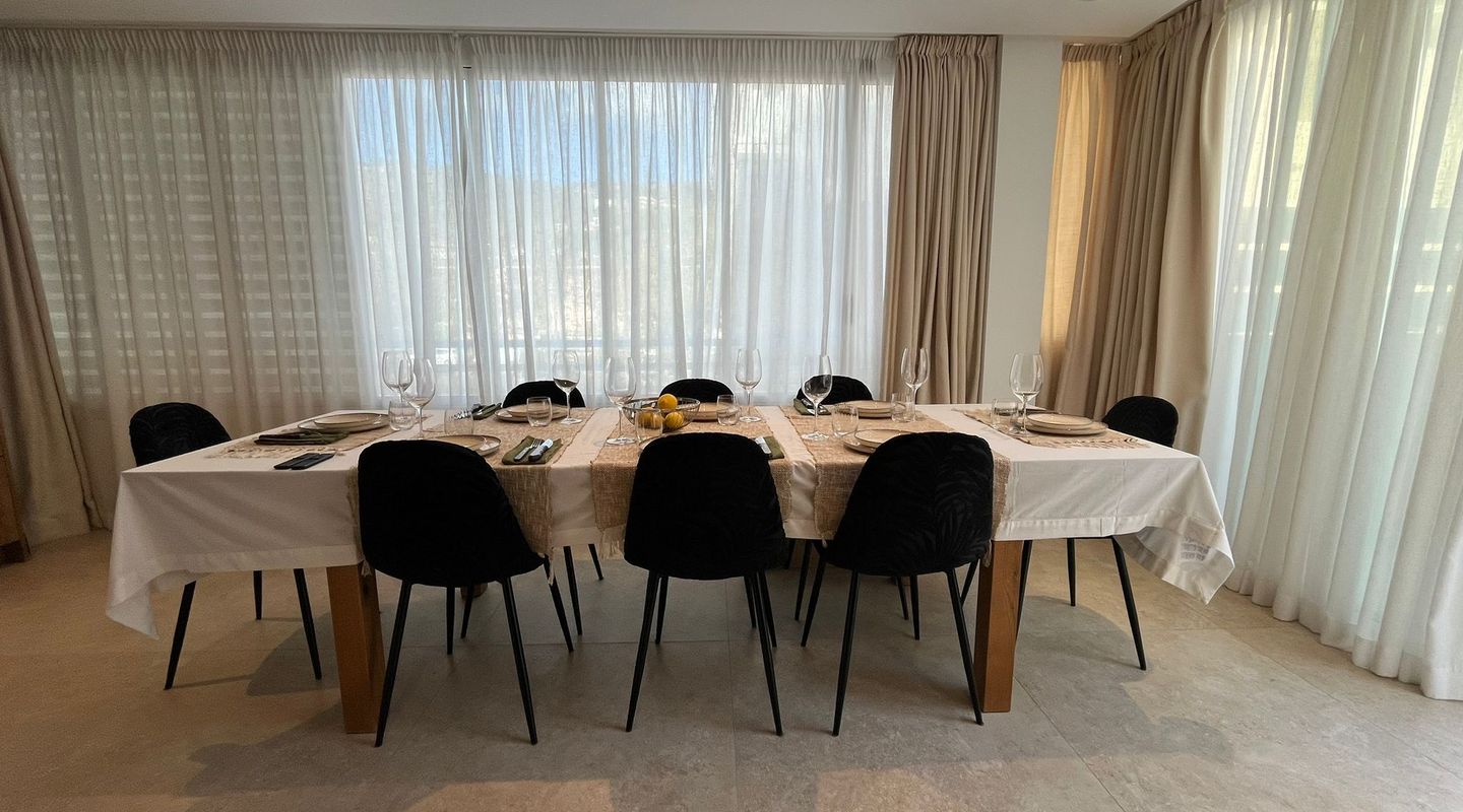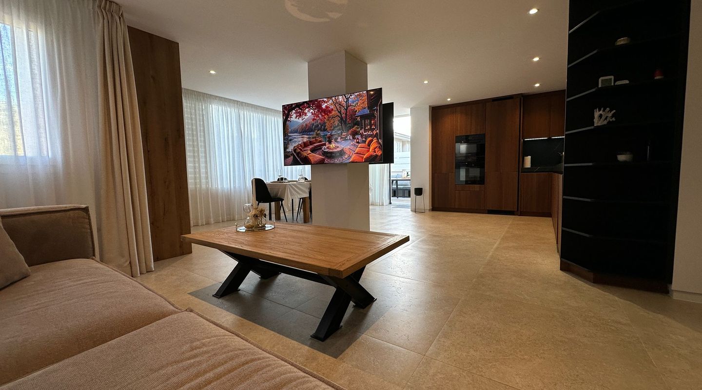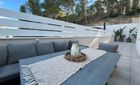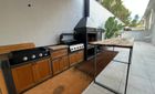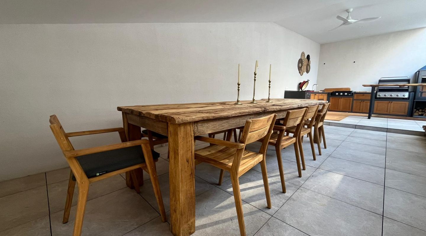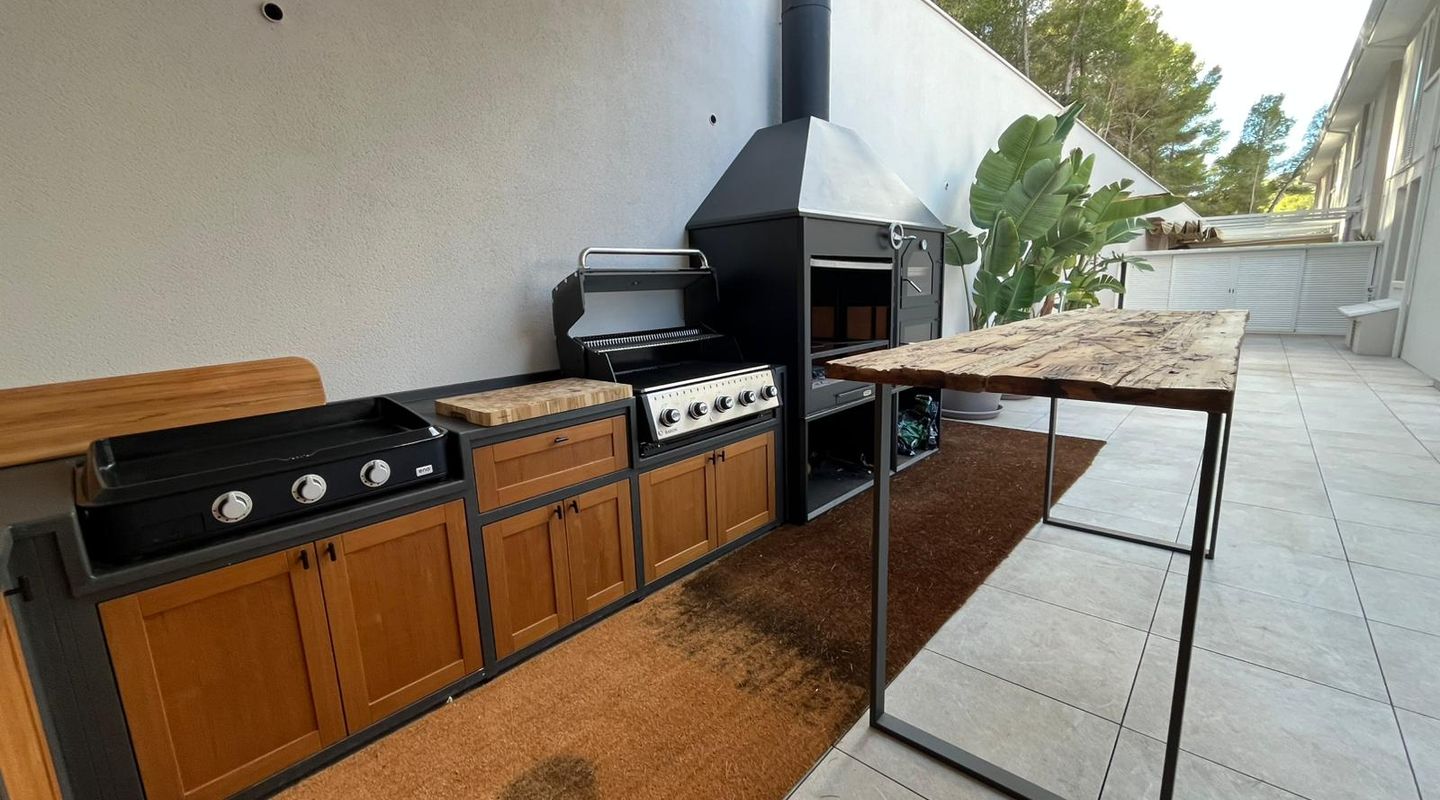 The living area has been designed for maximum comfort, featuring high-quality furnishings, two TVs in the living room and two additional TVs in the bedrooms. Outside, the spacious terrace with electric blinds offers a perfect year-round outdoor living space with a dining area and an outstanding BBQ setup including two charcoal barbecues, one gas barbecue, and an additional grill.