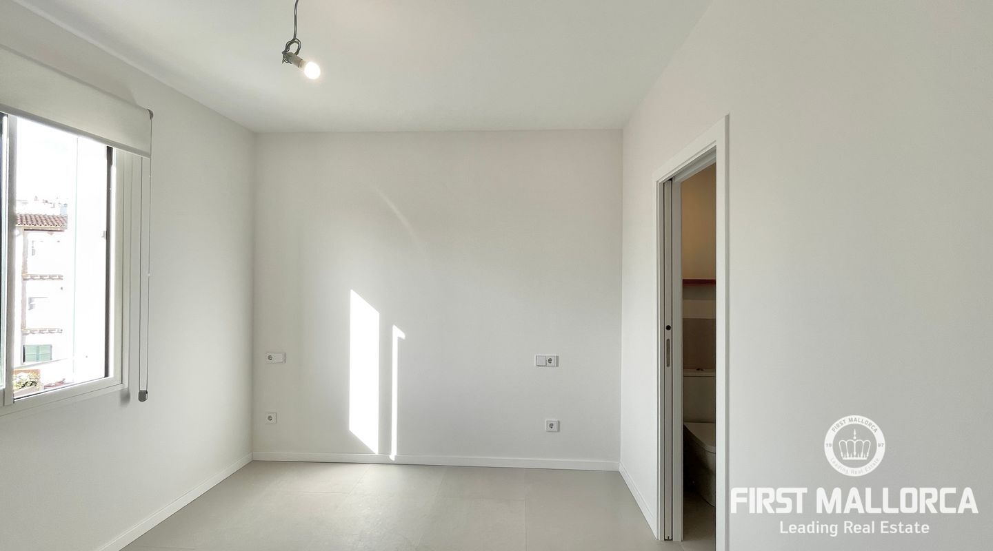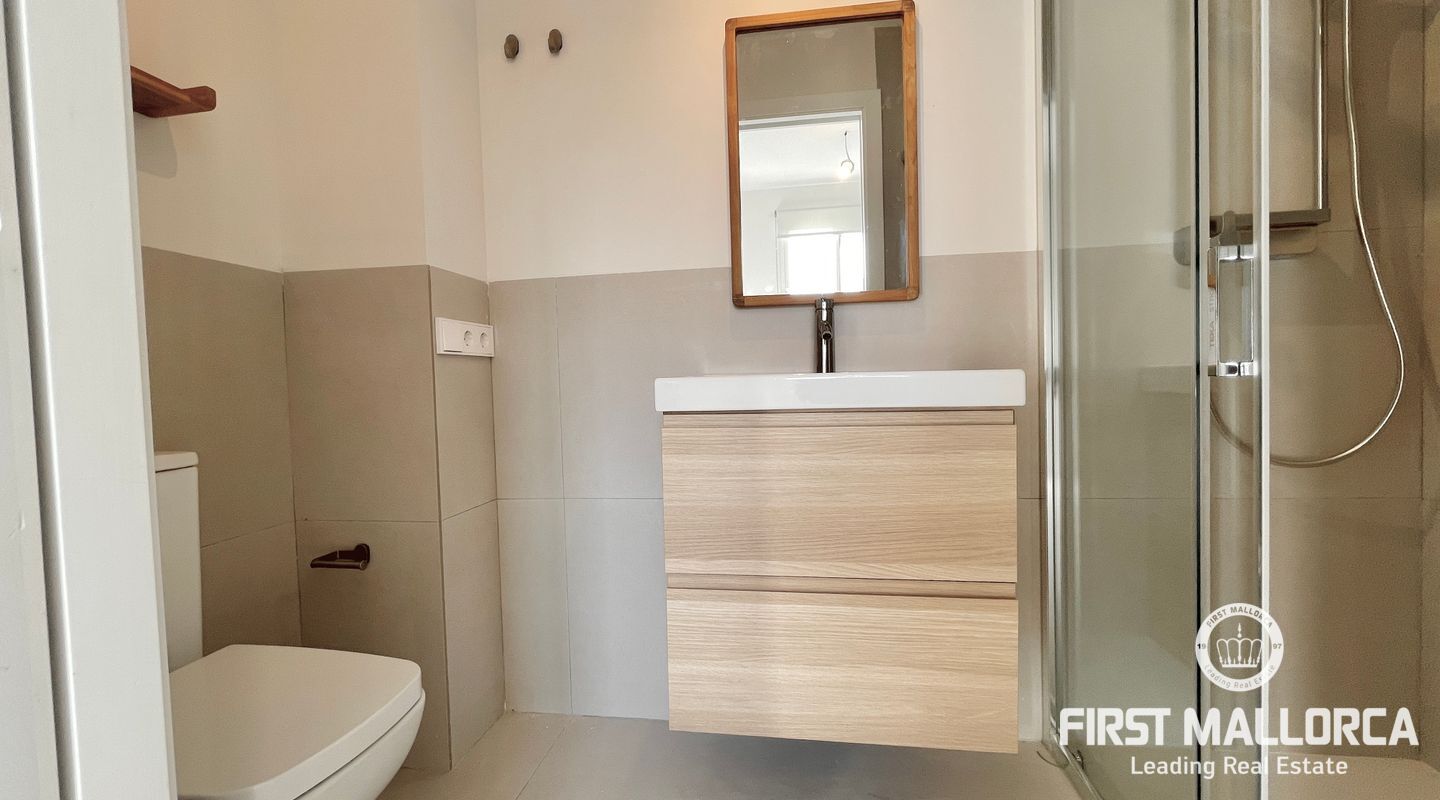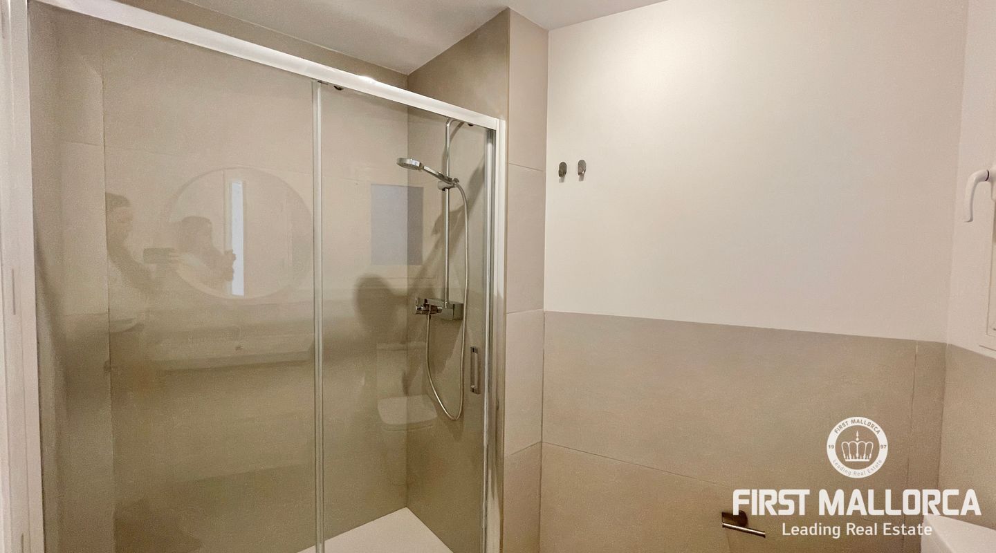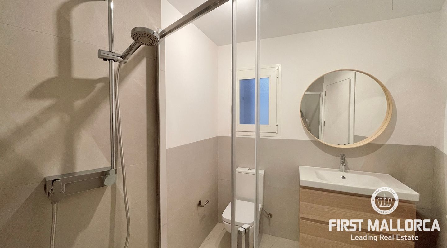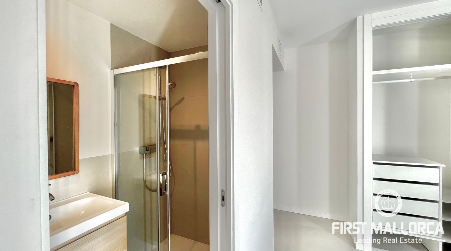 In this unit, there are two double bedrooms with built-in wardrobes and two full bathrooms, one of them en-suite. Both bedrooms face the street and have a southern orientation.