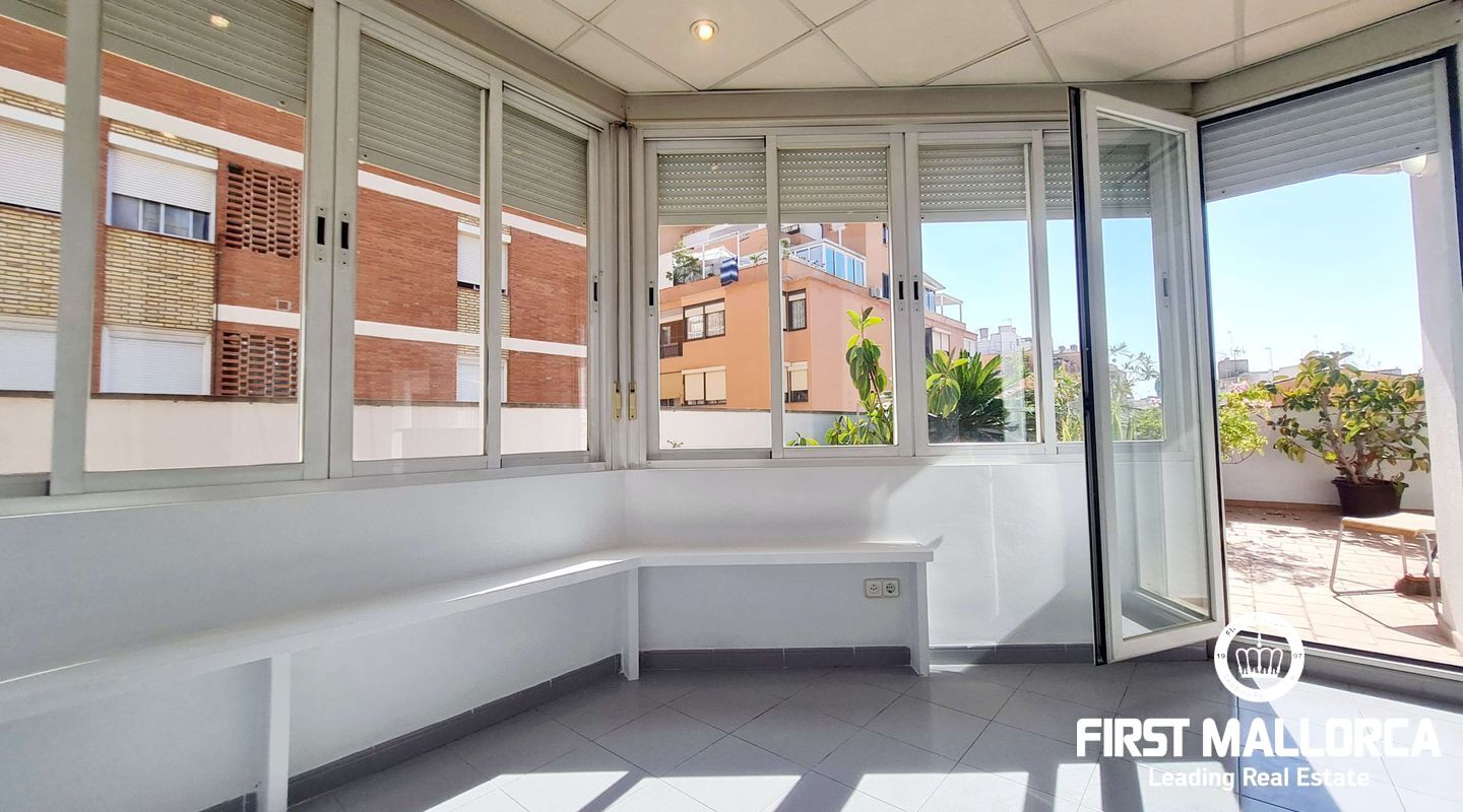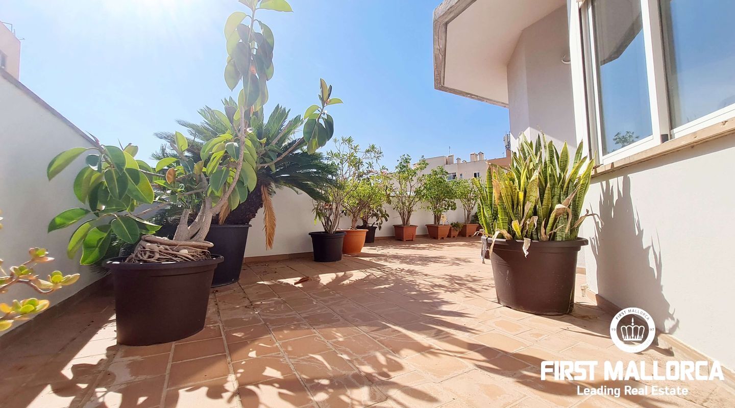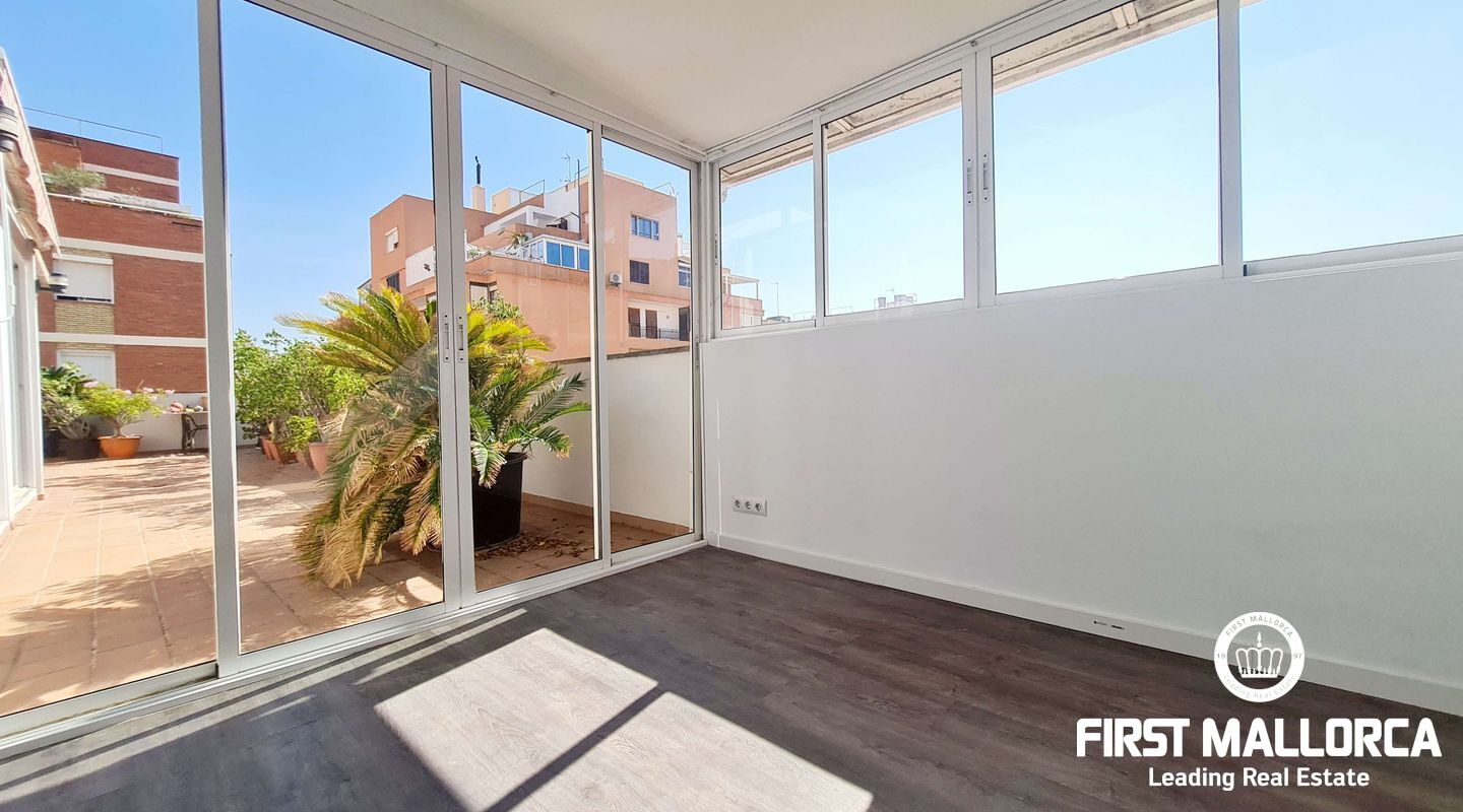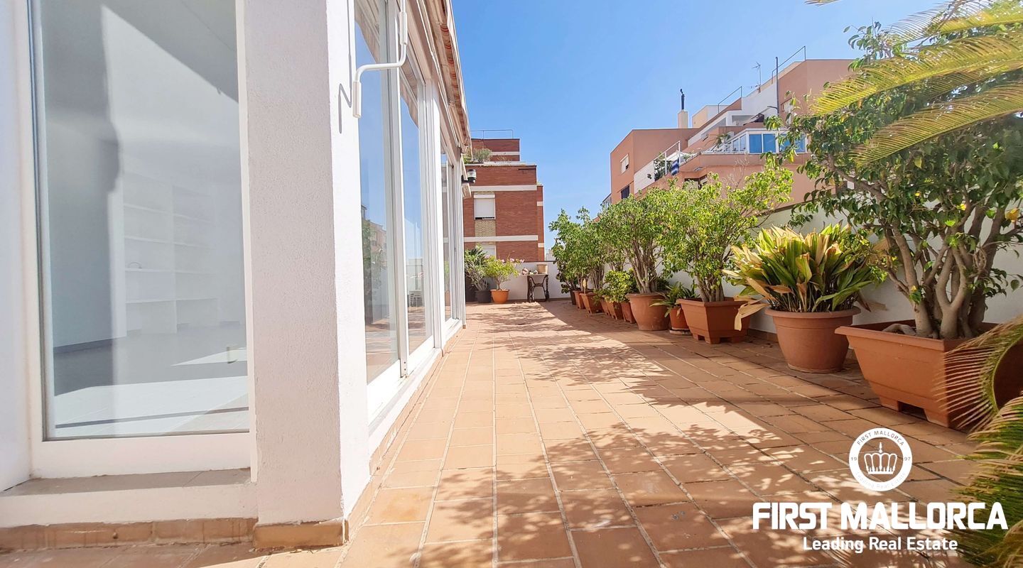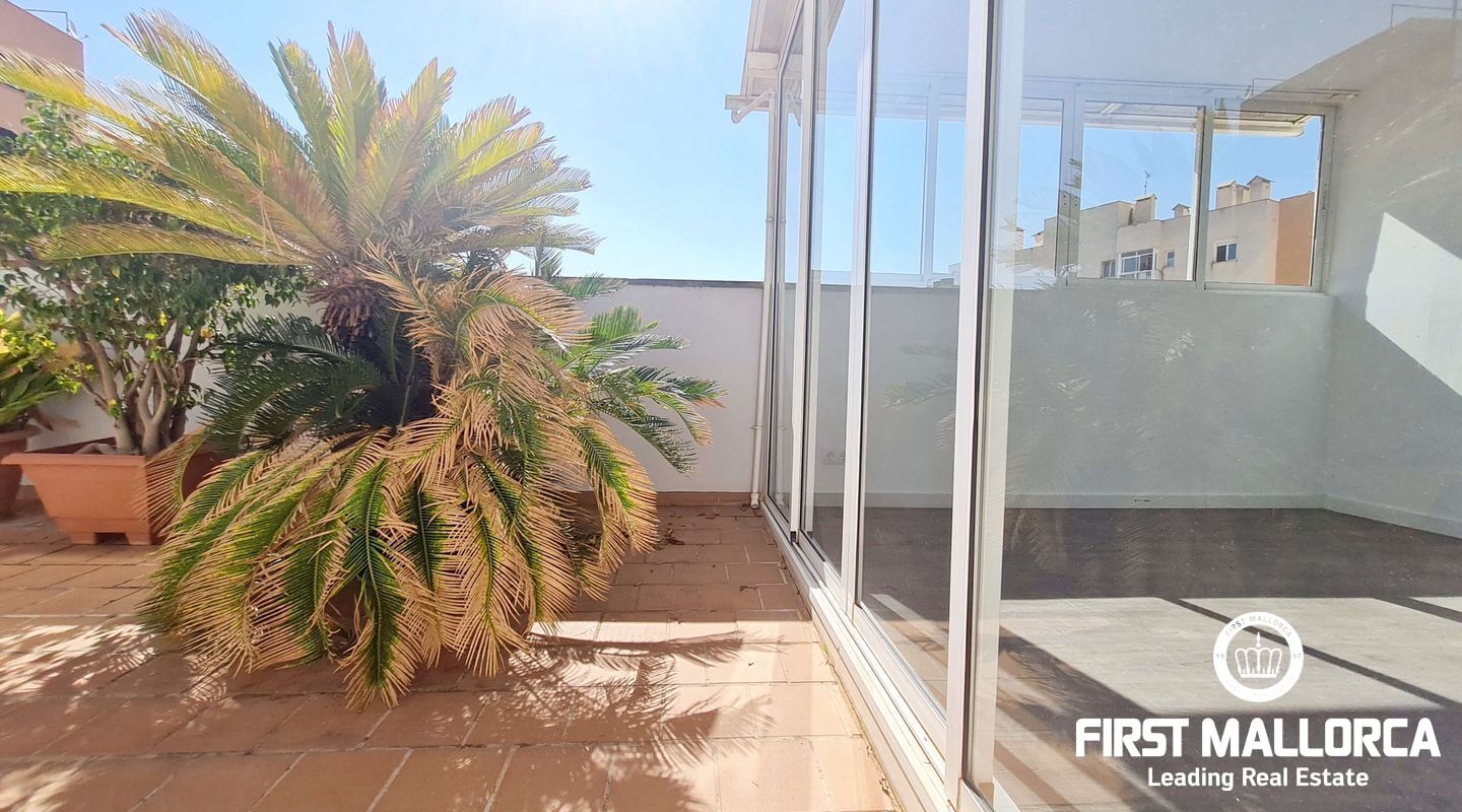 This spacious penthouse offers an exceptional living experience in the heart of Palma, just a short walk from the charming old town and near the vibrant Molinos area. The property boasts a large, bright living room seamlessly connected to an open-plan kitchen, perfect for modern living. With 2 bedrooms, 1 bathroom, and an additional studio space ideal for an office or extra room, this penthouse offers versatility and comfort. Flooded with natural light, the penthouse is surrounded by a large terrace, providing a stunning outdoor space for relaxation and entertainment. Extra features include a storage room. Parking included. This long-term rental is offered unfurnished, and please note that pets are not allowed. For more information or to arrange a viewing, please contact First Mallorca rental agents.