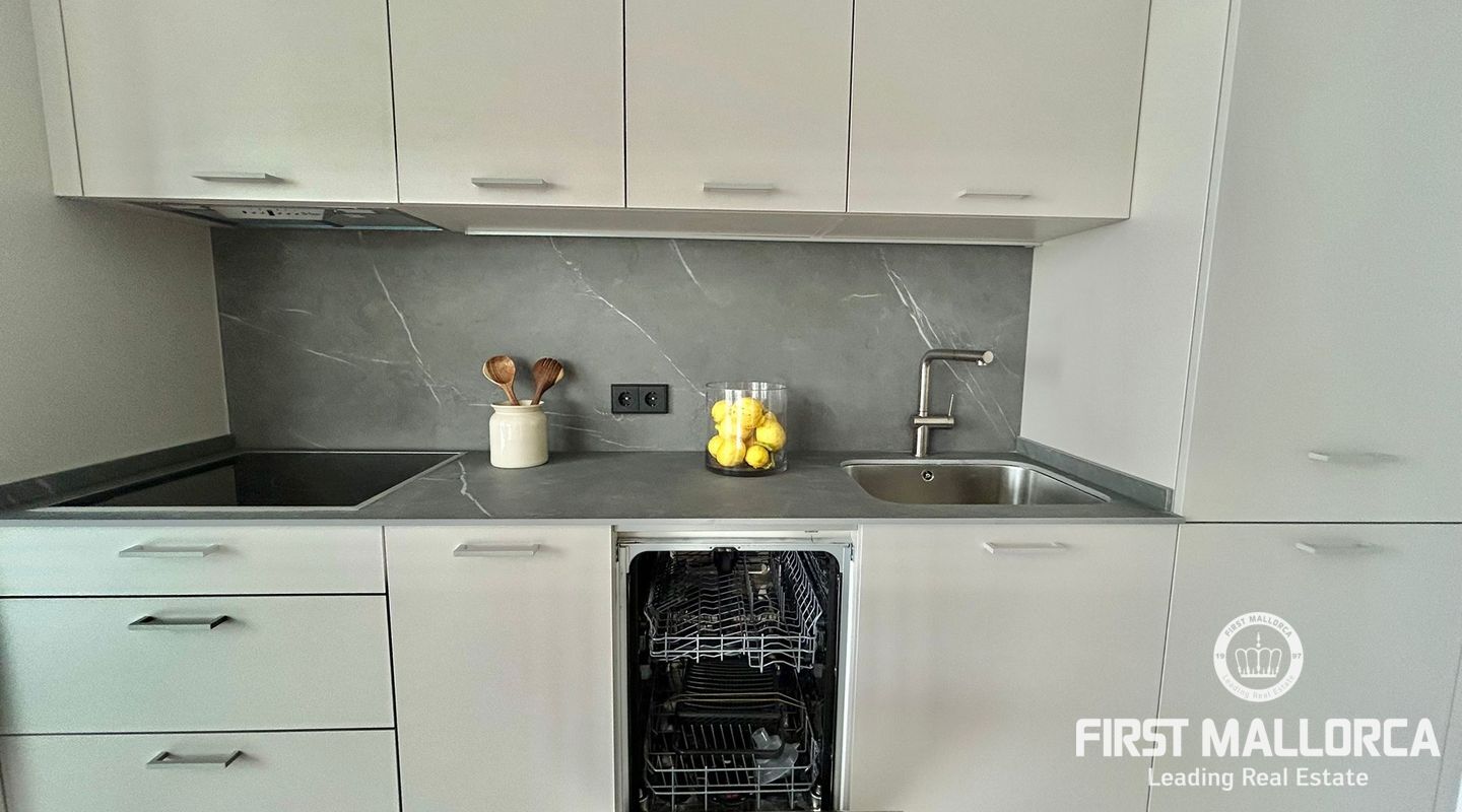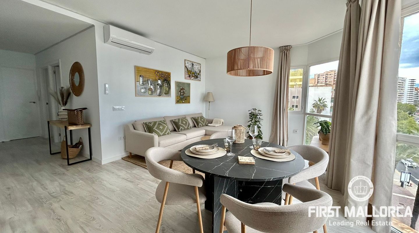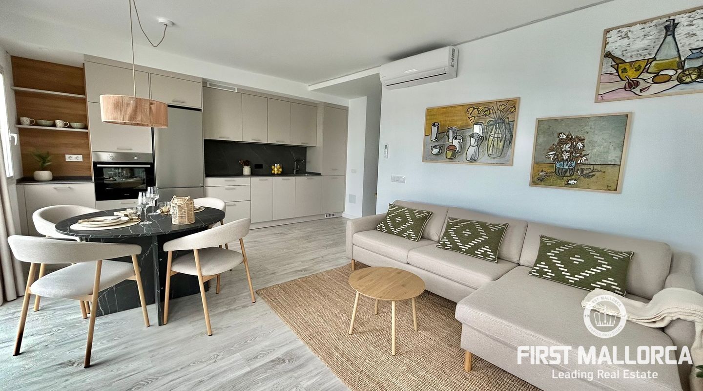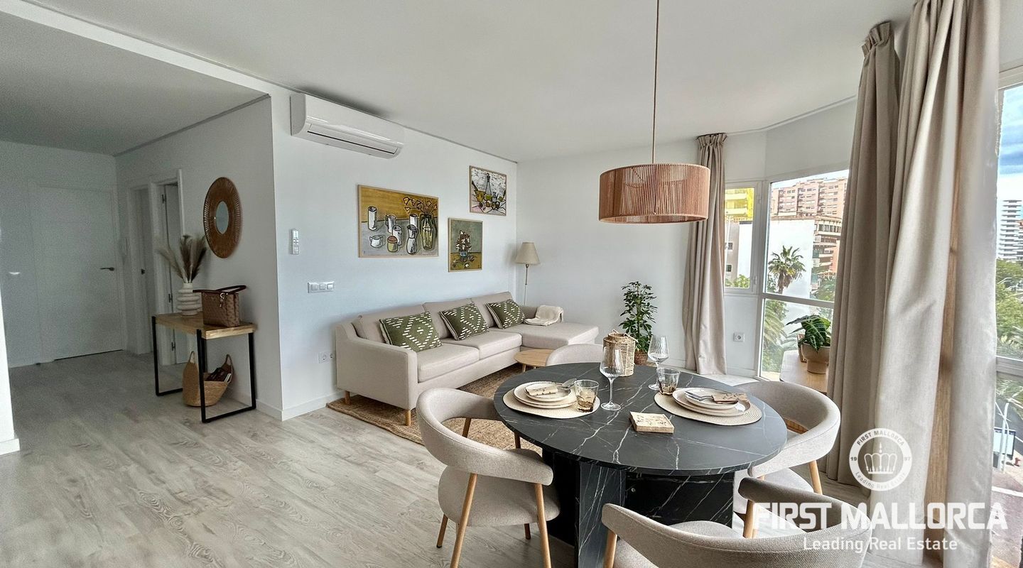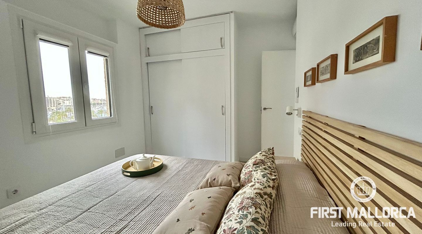 73 m2 apartment, completely exterior, with a spacious living room-veranda, with stunning panoramic views of the entire bay and lots of natural light, on the seafront promenade. Property in very good condition, completely renovated in 2026. Brand new furnishings and fittings. Two bedrooms with fitted wardrobes, 1 bathroom and open-plan living room and kitchen. Air conditioning and heating in all rooms. Communal swimming pool, parking, bicycle storage room, laundry area. Concierge in the building, high-end community. Short or long-term contract. Please consult the terms and conditions with First Mallorca's rental agents.