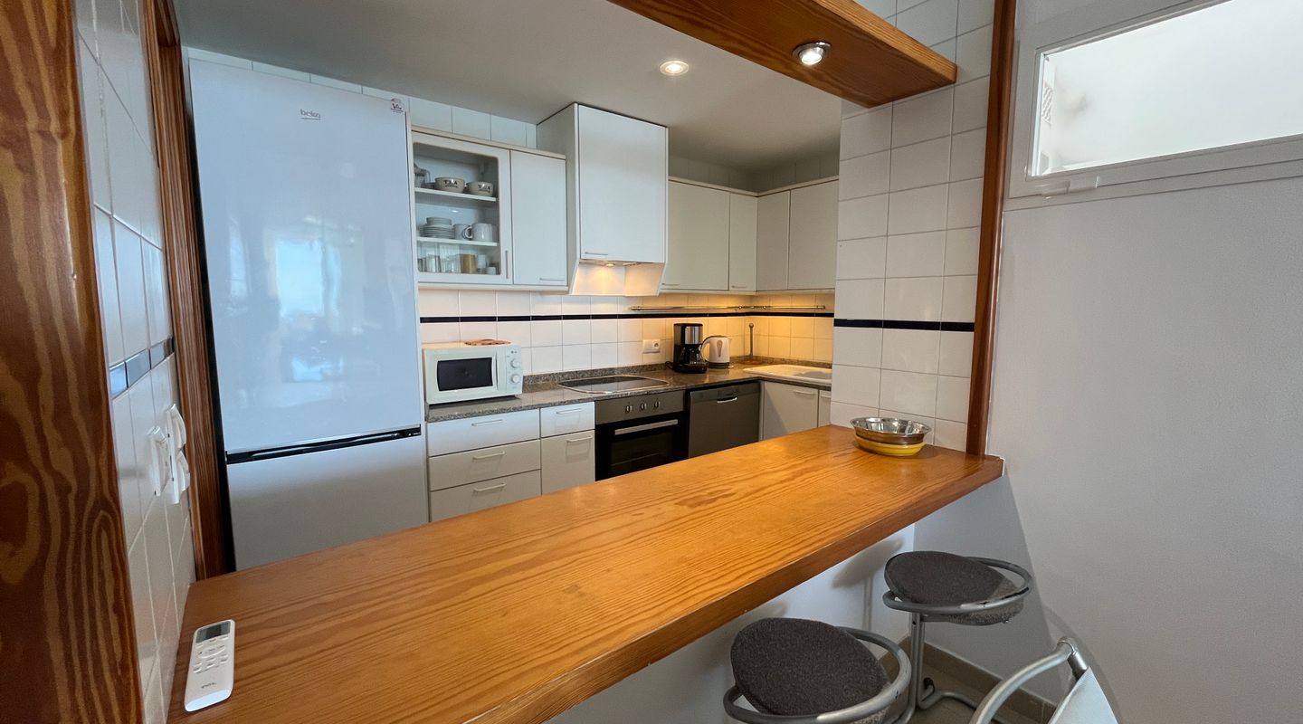 On the upper floor you will find two bright bedrooms sharing a full bathroom. This level also features the open kitchen and living area, creating a spacious and welcoming environment with stunning panoramic views of the open sea, ideal for relaxing or entertaining.