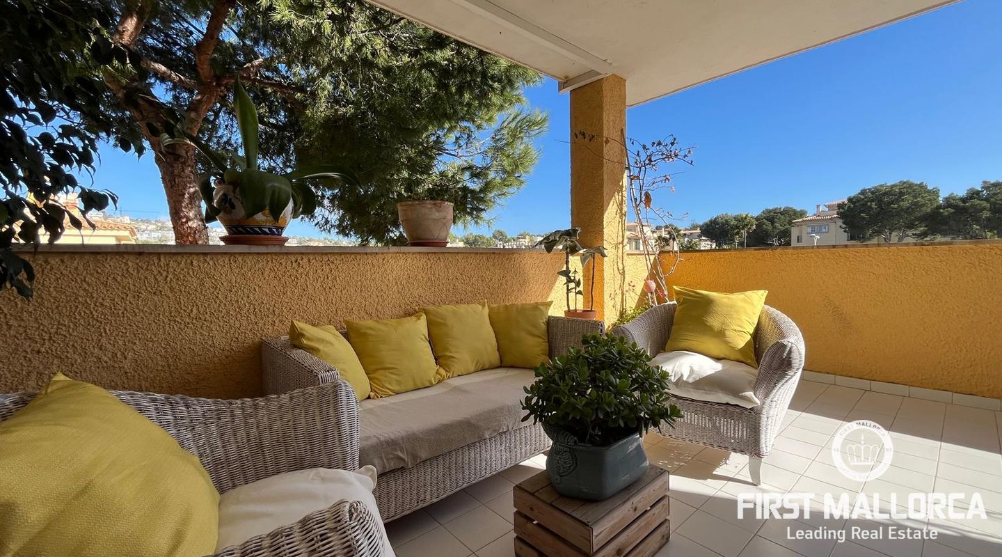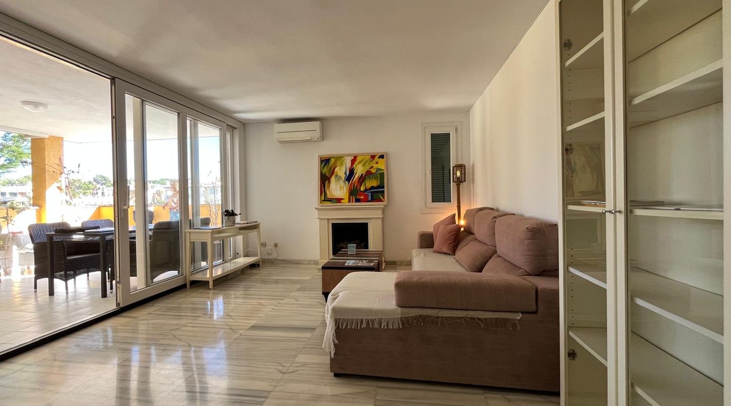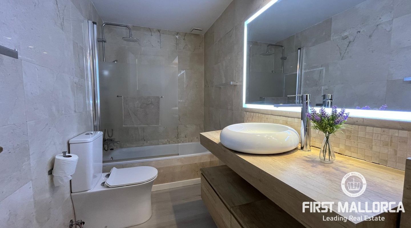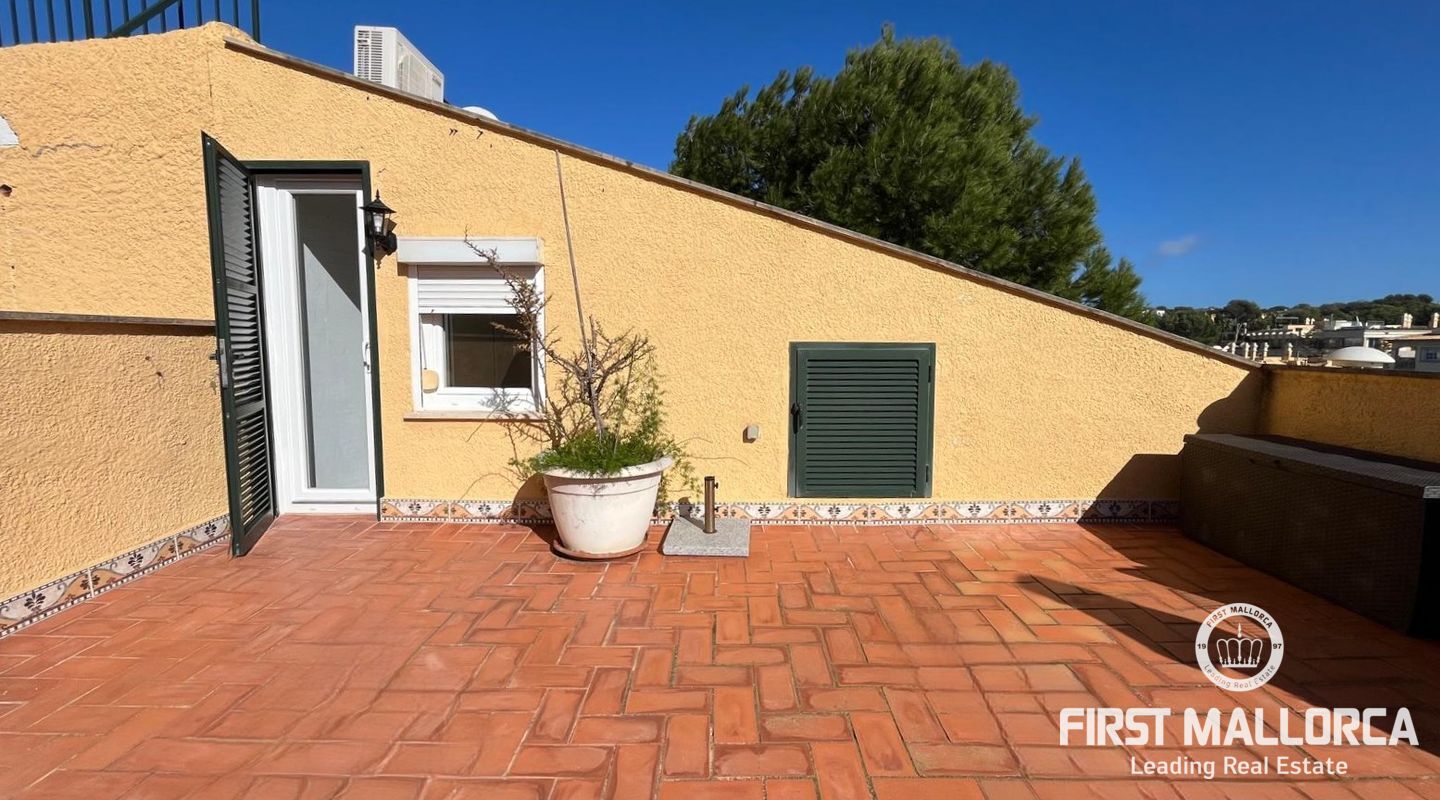 Bright apartment in the residential complex Ambassador Park with direct access to the sea and 2 coves in Nova Santa Ponsa, a luxury residential area on the southwest coast of Mallorca. The living space of approximately 90 m² is divided as follows: on the main level there is an entrance hall, a spacious living room with fireplace adjacent to a dining room and an open plan kitchen / dining room, 1 bedroom, 1 newly renovated bathroom and a laundry room. The living room has access to a covered terrace, from it the stairs lead to the private roof terrace solarium, ideal for sunbathing. Here you will find an additional bedroom with a bathroom, it is like a private apartment. The penthouse is equipped with 2 new air conditioning / heat, Climalit windows, marble floors and fitted wardrobes. The residential complex is located directly on the coast, offers concierge service, community parking, a garden with areas for children's games, and 2 swimming pools; the building has an elevator. A few minutes drive from the residence there are several shops, supermarkets and numerous restaurants with exquisite local and international cuisine. Several sandy beaches and yacht clubs, popular golf courses and the luxury marina Port Adriano can be reached in 5 minutes by car. 2 months guarantee, electricity is not included. Available from November 1st. Mínimum rental period of 11 months.