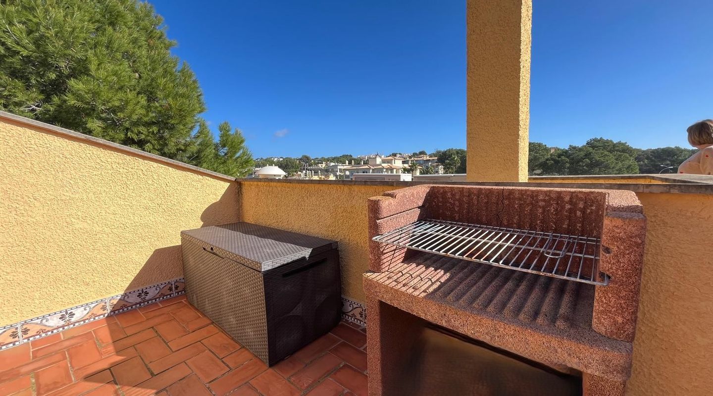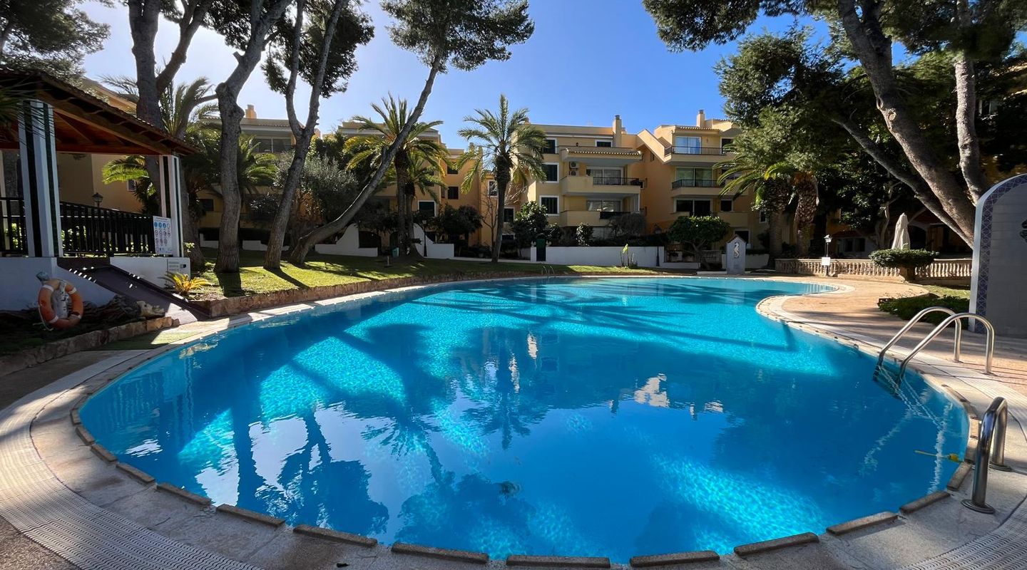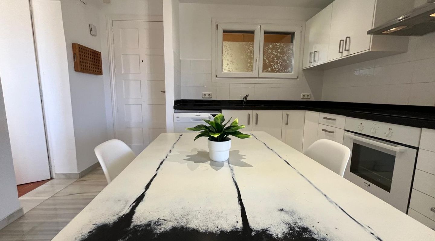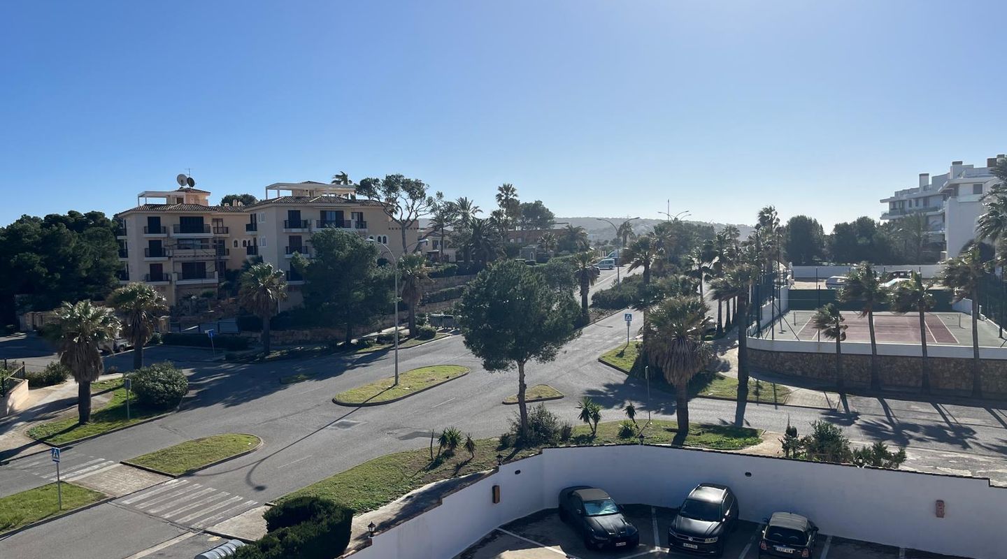 Bright apartment in the residential complex Ambassador Park with direct access to the sea and 2 coves in Nova Santa Ponsa, a luxury residential area on the southwest coast of Mallorca. The living space of approximately 90 m² is divided as follows: on the main level there is an entrance hall, a spacious living room with fireplace adjacent to a dining room and an open plan kitchen / dining room, 1 bedroom, 1 newly renovated bathroom and a laundry room. The living room has access to a covered terrace, from it the stairs lead to the private roof terrace solarium, ideal for sunbathing. Here you will find an additional bedroom with a bathroom, it is like a private apartment. The penthouse is equipped with 2 new air conditioning / heat, Climalit windows, marble floors and fitted wardrobes. The residential complex is located directly on the coast, offers concierge service, community parking, a garden with areas for children's games, and 2 swimming pools; the building has an elevator. A few minutes drive from the residence there are several shops, supermarkets and numerous restaurants with exquisite local and international cuisine. Several sandy beaches and yacht clubs, popular golf courses and the luxury marina Port Adriano can be reached in 5 minutes by car. 2 months guarantee, electricity is not included. Available from November 1st. Mínimum rental period of 11 months.