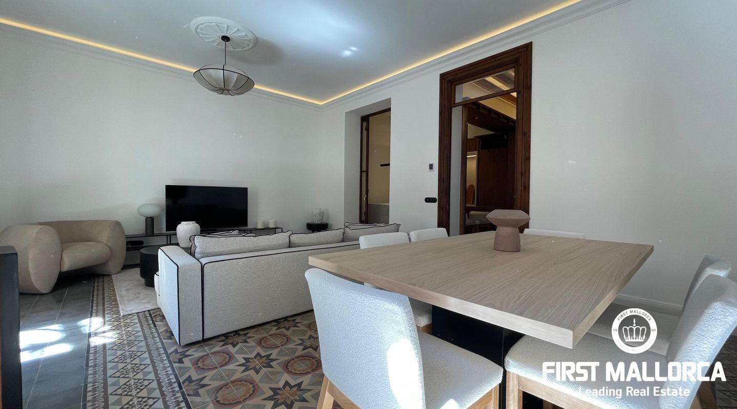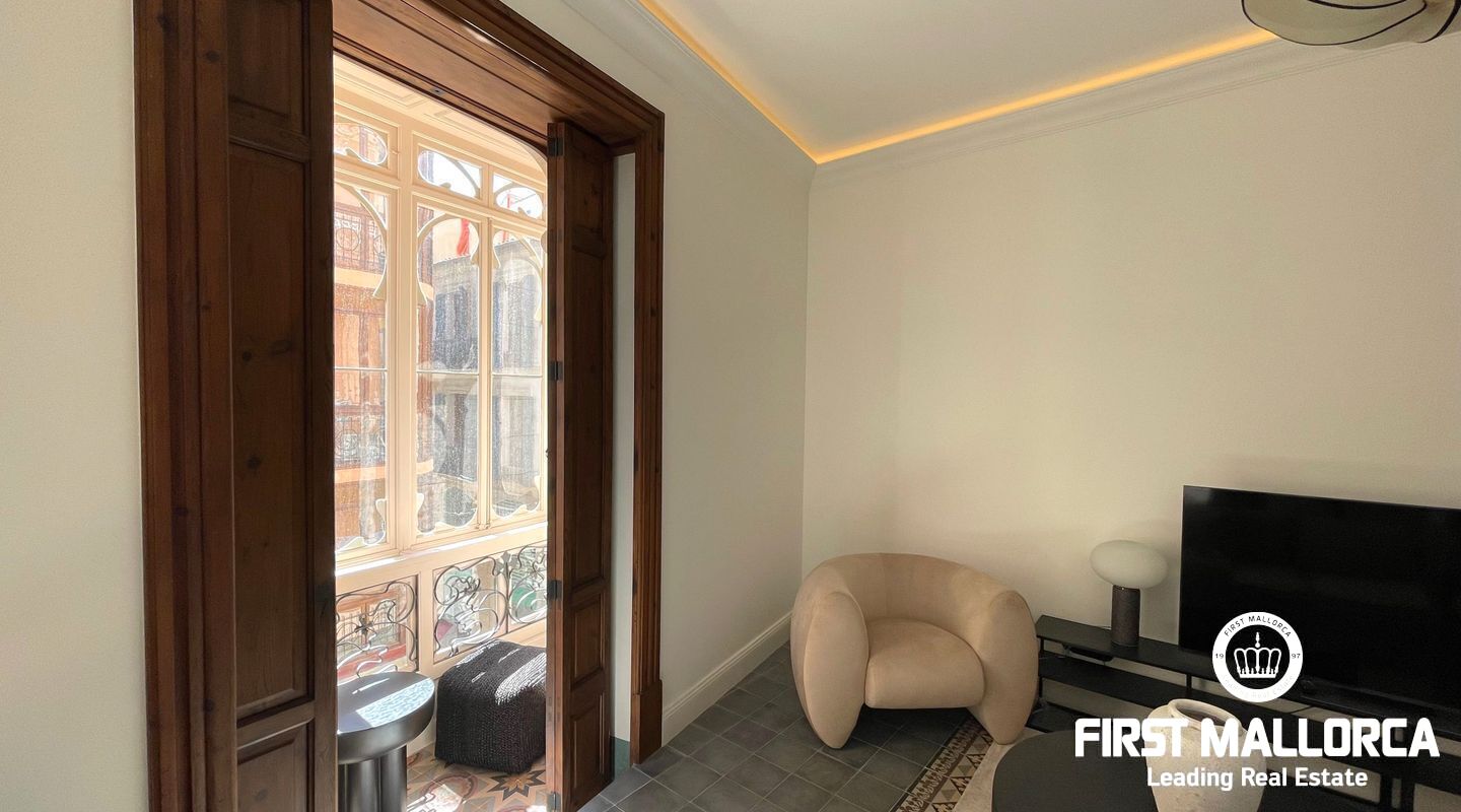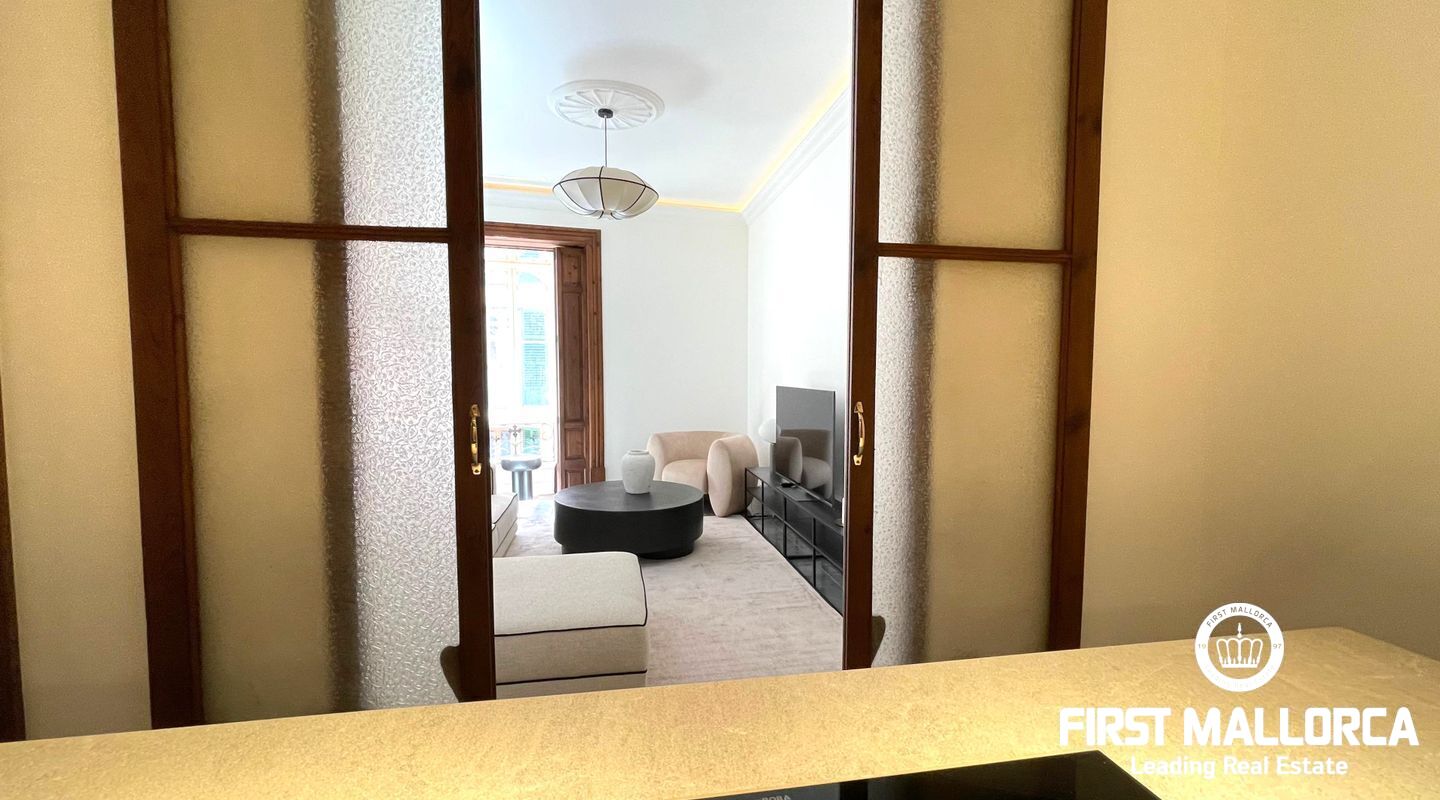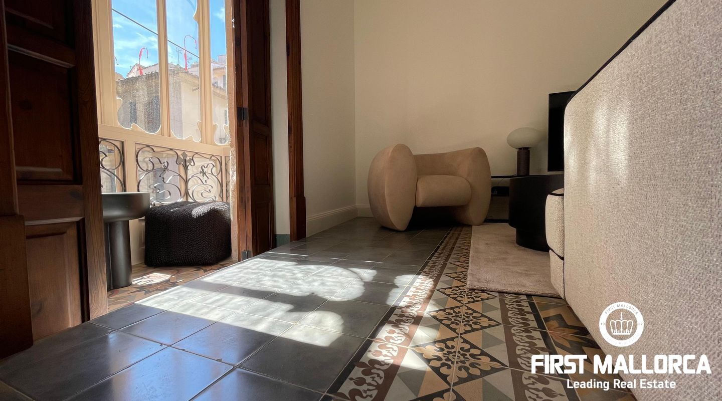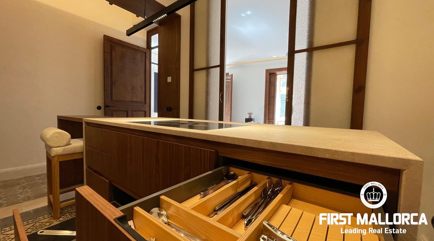 When you enter the apartment you face an elegant kitchen featuring wood finishes, a marble-topped island, and an integrated sink, all outfitted with high-end Miele appliances. Restored glass sliding doors lead from the kitchen into a spacious and bright living room, complete with antique tiled floors and two French balconies overlooking the street below. Custom-made furniture complements the modern design while respecting the classic Mallorcan tiled floors.