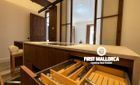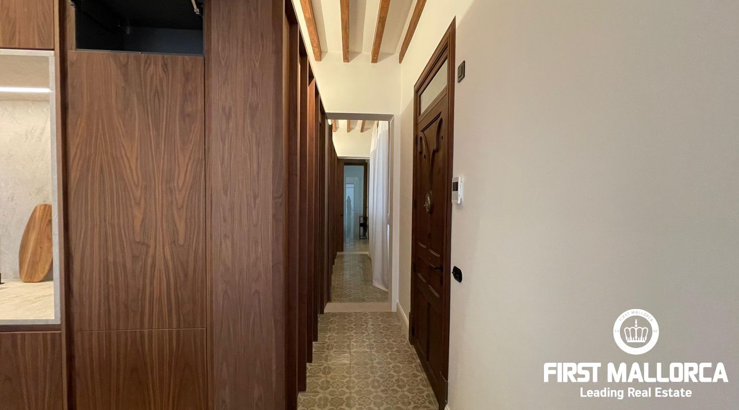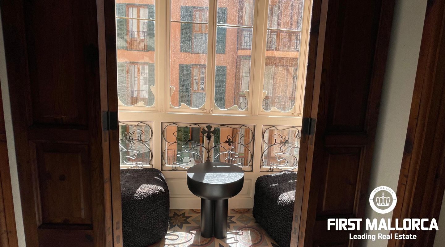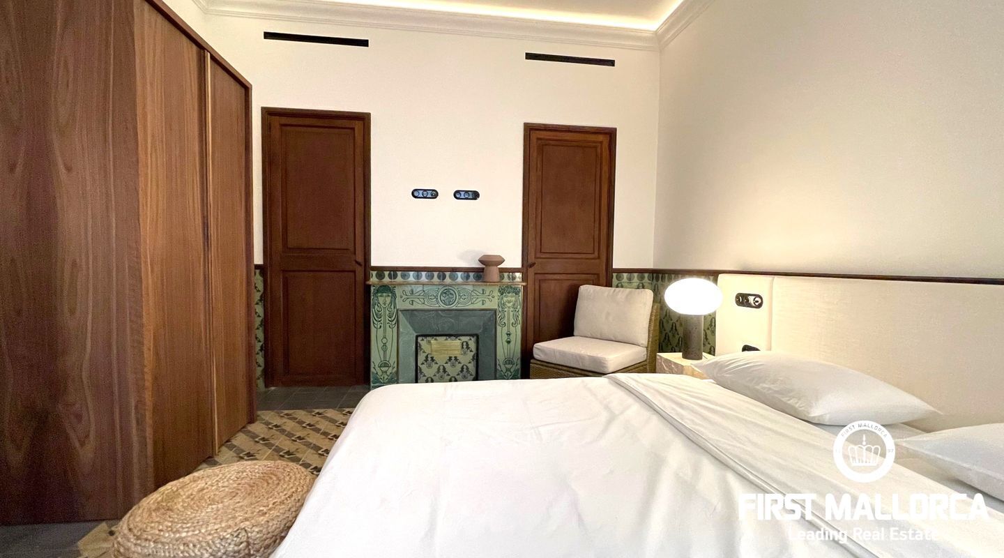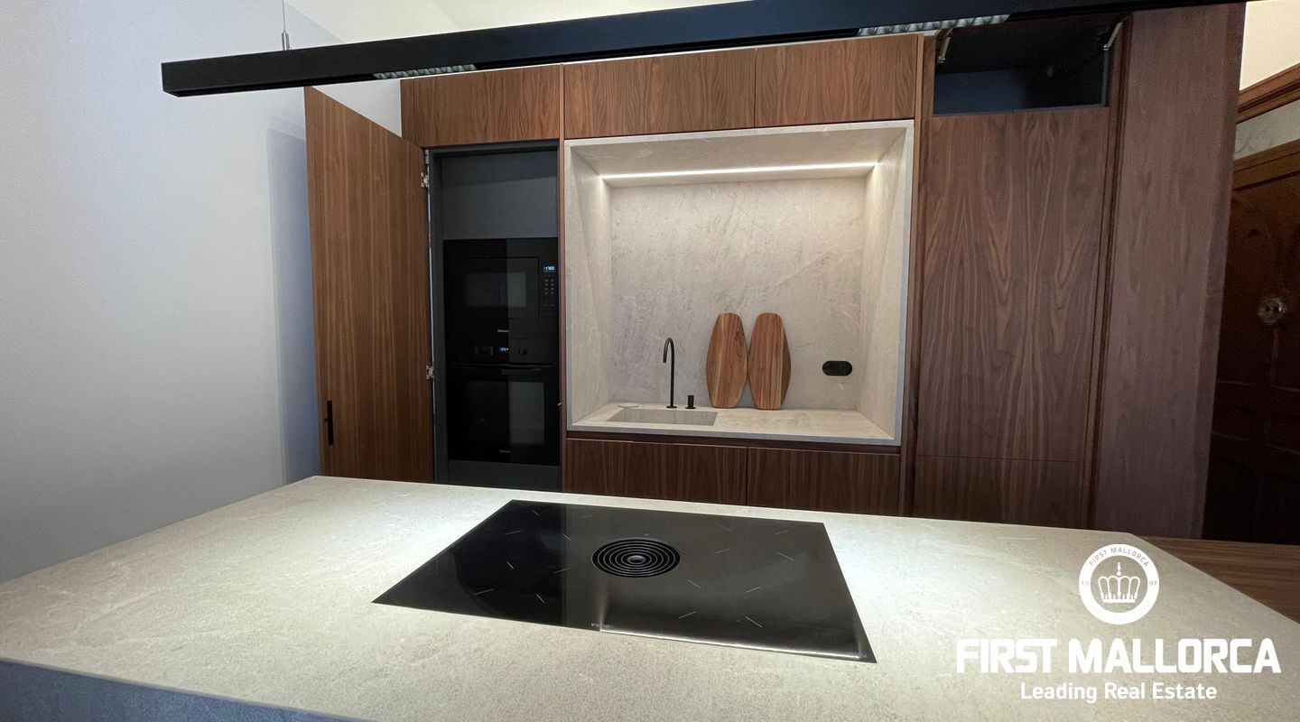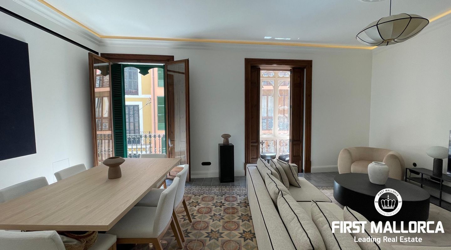 When you enter the apartment you face an elegant kitchen featuring wood finishes, a marble-topped island, and an integrated sink, all outfitted with high-end Miele appliances. Restored glass sliding doors lead from the kitchen into a spacious and bright living room, complete with antique tiled floors and two French balconies overlooking the street below. Custom-made furniture complements the modern design while respecting the classic Mallorcan tiled floors.