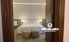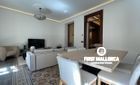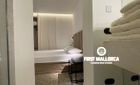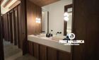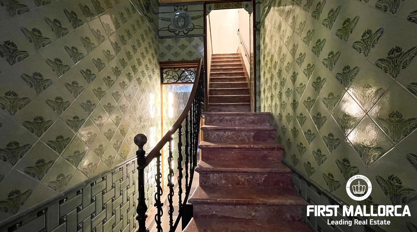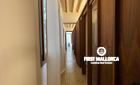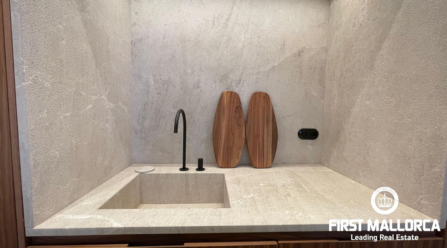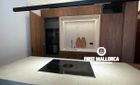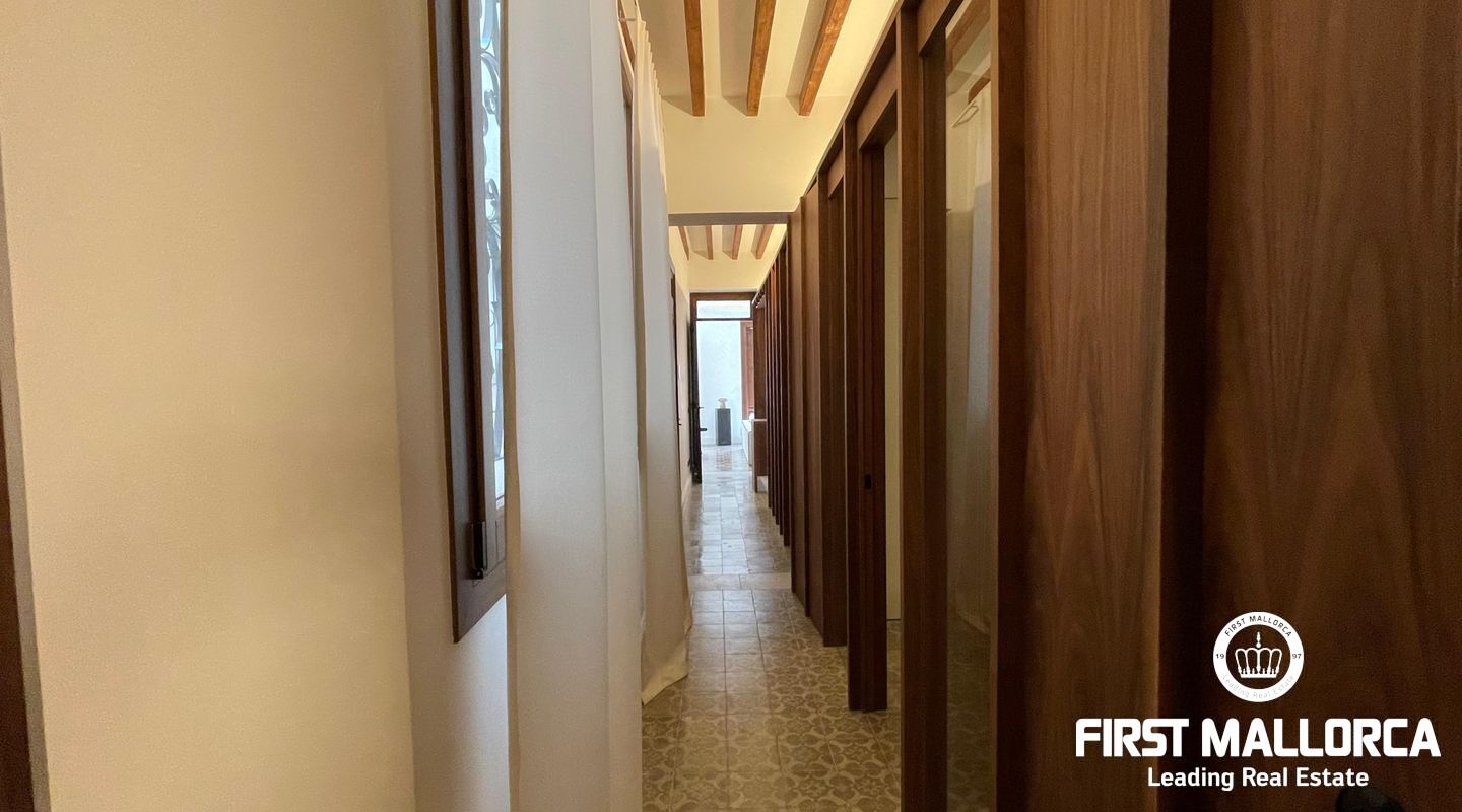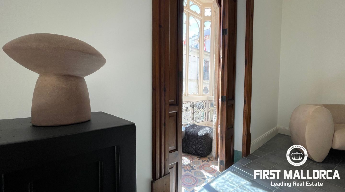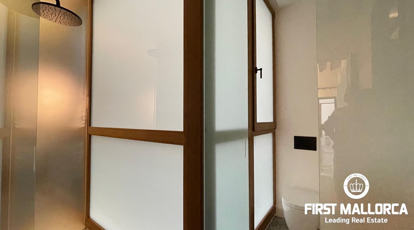 When you enter the apartment you face an elegant kitchen featuring wood finishes, a marble-topped island, and an integrated sink, all outfitted with high-end Miele appliances. Restored glass sliding doors lead from the kitchen into a spacious and bright living room, complete with antique tiled floors and two French balconies overlooking the street below. Custom-made furniture complements the modern design while respecting the classic Mallorcan tiled floors.