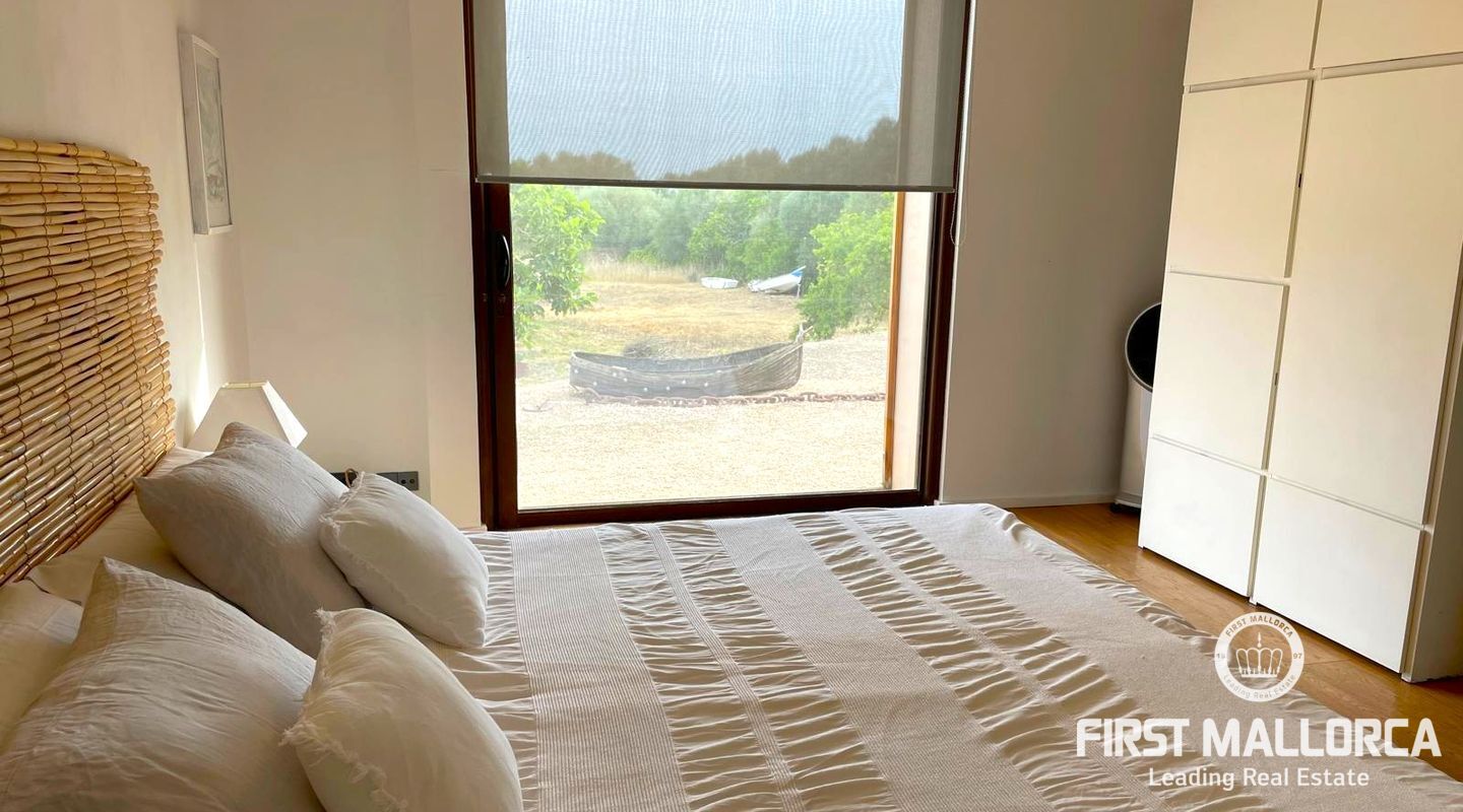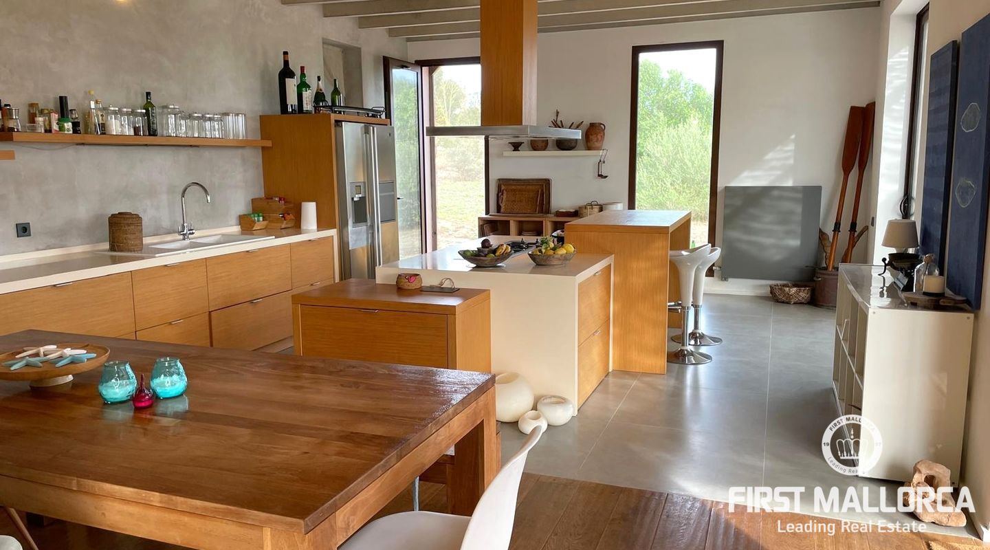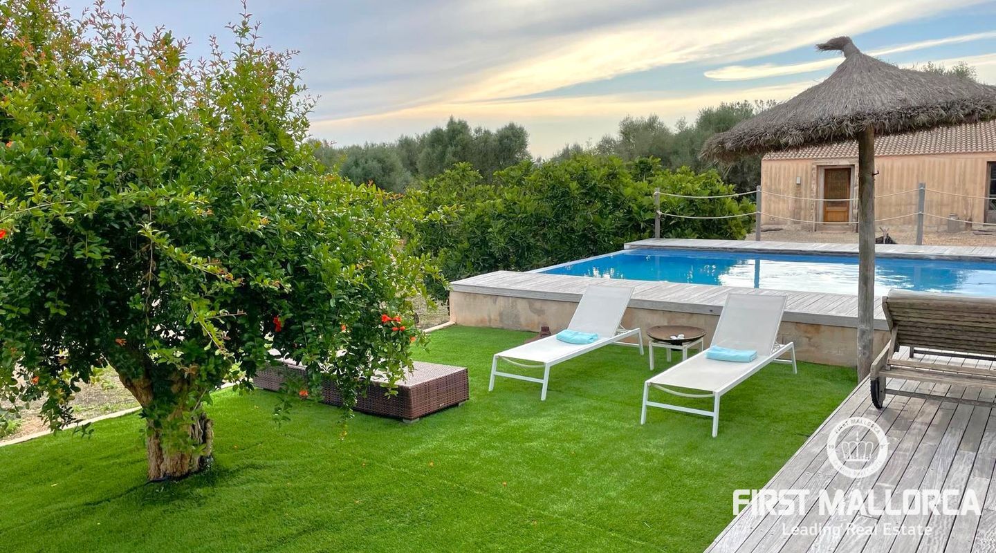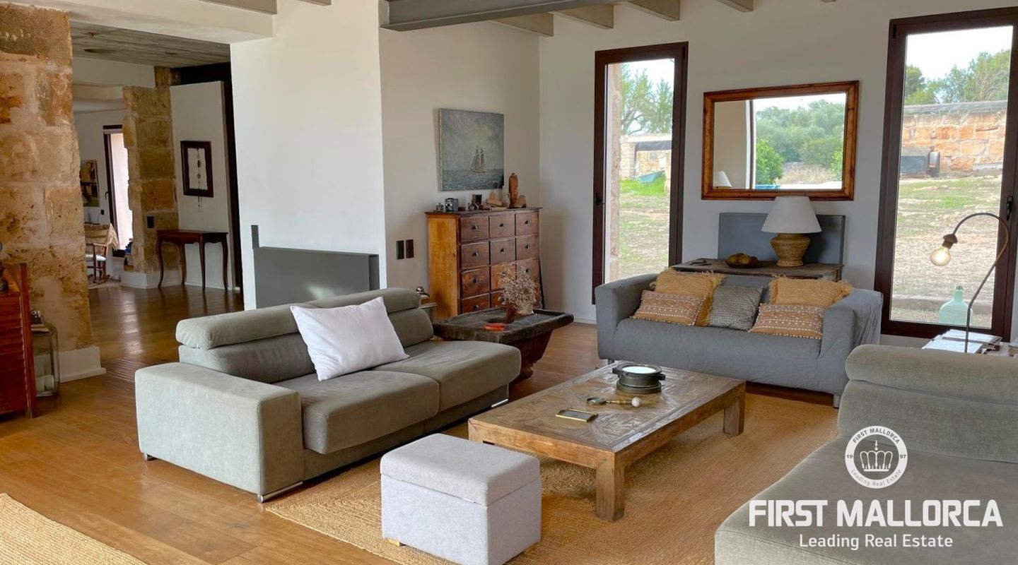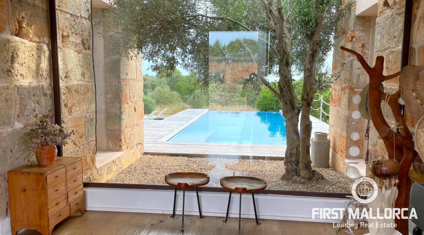 This charming and stylishly designed finca is located in a peaceful setting between Campos and the famous natural beach of Es Trenc. It combines rustic elements such as natural stone walls and warm wooden accents with a modern open-plan layout and high-quality parquet flooring – a true architectural gem crafted with great attention to detail. Upon entering the property, you are immediately greeted by the spacious pool area, framed by a magnificent olive tree that becomes a natural centerpiece thanks to the floor-to-ceiling panoramic windows. The living space is distributed on one level and impresses with clean lines, high ceilings with exposed wooden beams, and a harmonious color scheme using natural materials. The right wing of the house features three bright bedrooms with floor-to-ceiling windows that not only allow plenty of natural light but also offer beautiful views of the surrounding greenery. Two elegant bathrooms with stone and designer elements complete this part of the house. On the left side, you'll find the impressive open-plan living and dining area with a generous sofa landscape, cozy atmosphere, and seamless transition into the modern fitted kitchen with high-quality wooden finishes and ample workspace. From here, you have direct access to the covered terrace with a comfortable seating area – ideal for relaxing or entertaining guests. The approximately 14,050 m² plot offers not only maximum privacy but also a well-maintained garden, a stylish pool area, and various terraces. Toward the rear of the property lies a separate guest house with its own bedroom, bathroom, and garage – perfect for visitors or as a private retreat. Comfort throughout the year is ensured by modern air conditioning, ceiling fans, and classic radiators, making the property suitable for year-round living. A true gem for nature lovers, design enthusiasts, and anyone seeking tranquility, style, and proximity to the coast.