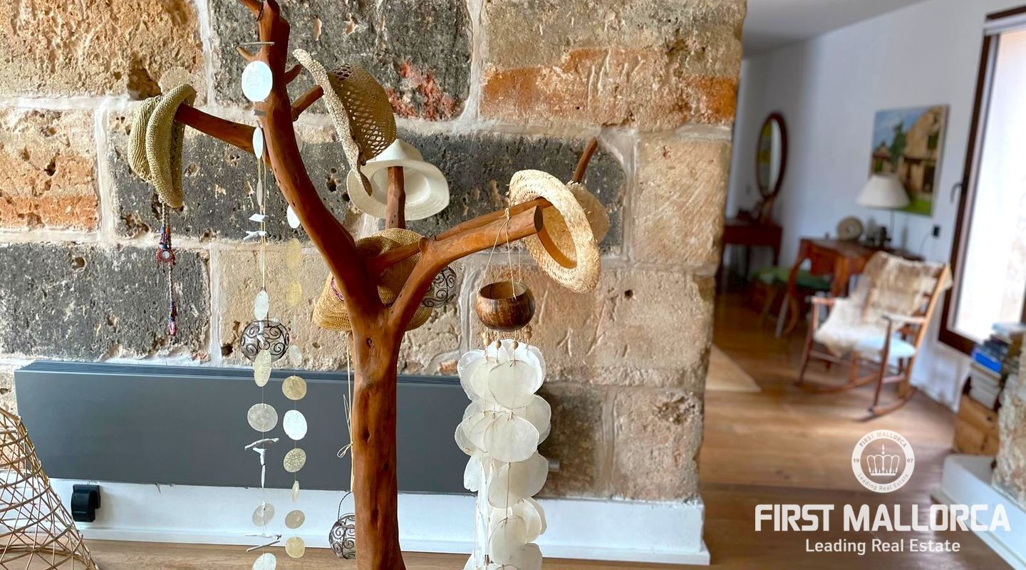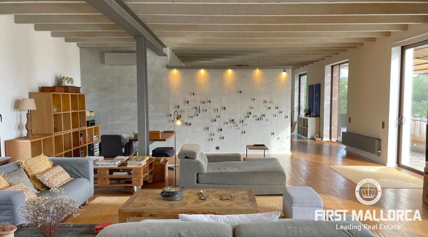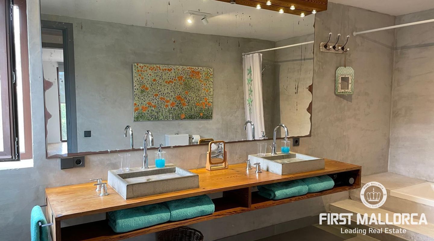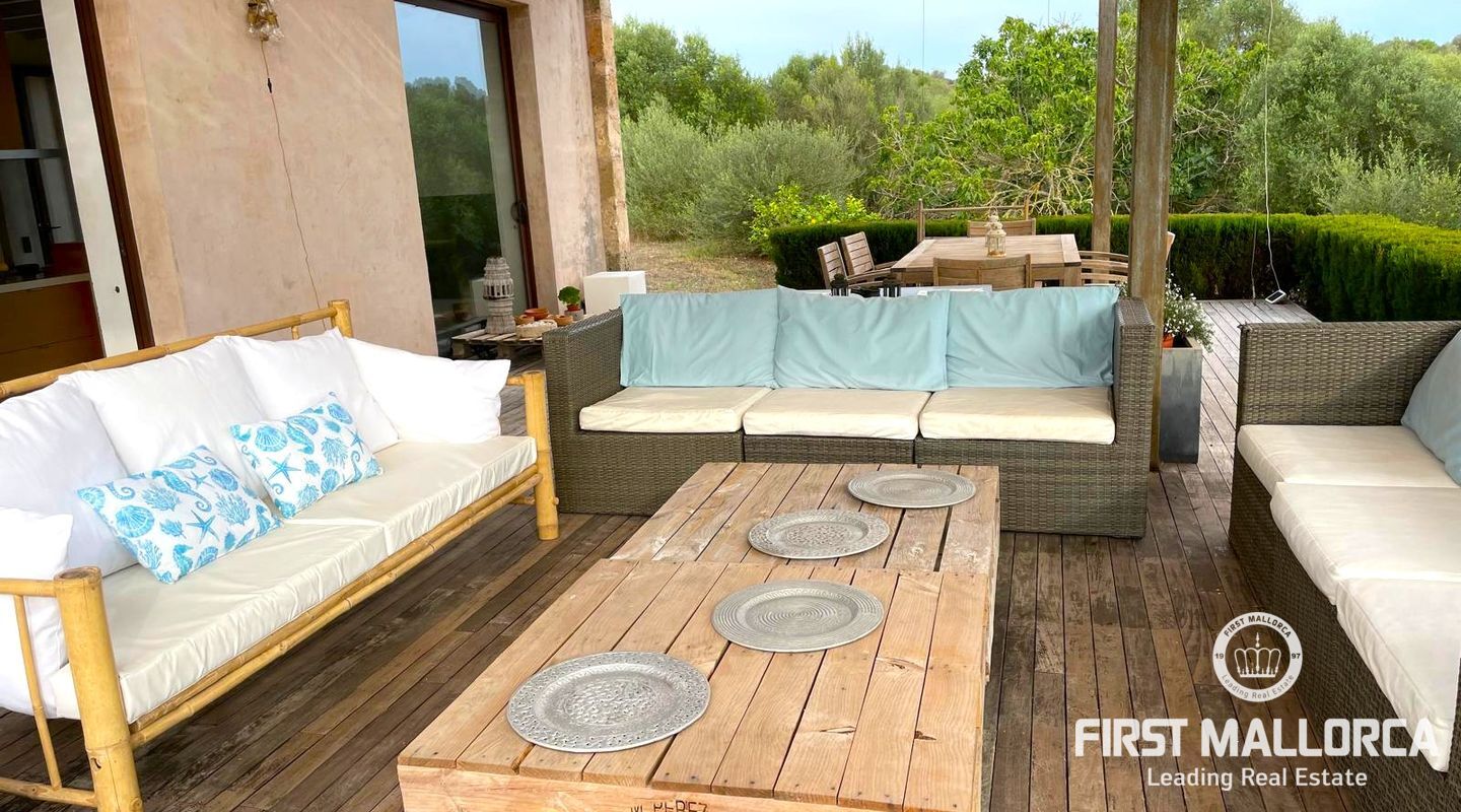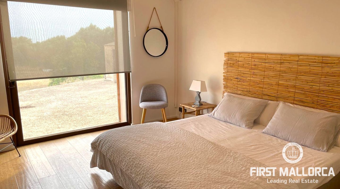 This charming and stylishly designed finca is located in a peaceful setting between Campos and the famous natural beach of Es Trenc. It combines rustic elements such as natural stone walls and warm wooden accents with a modern open-plan layout and high-quality parquet flooring – a true architectural gem crafted with great attention to detail. Upon entering the property, you are immediately greeted by the spacious pool area, framed by a magnificent olive tree that becomes a natural centerpiece thanks to the floor-to-ceiling panoramic windows. The living space is distributed on one level and impresses with clean lines, high ceilings with exposed wooden beams, and a harmonious color scheme using natural materials. The right wing of the house features three bright bedrooms with floor-to-ceiling windows that not only allow plenty of natural light but also offer beautiful views of the surrounding greenery. Two elegant bathrooms with stone and designer elements complete this part of the house. On the left side, you'll find the impressive open-plan living and dining area with a generous sofa landscape, cozy atmosphere, and seamless transition into the modern fitted kitchen with high-quality wooden finishes and ample workspace. From here, you have direct access to the covered terrace with a comfortable seating area – ideal for relaxing or entertaining guests. The approximately 14,050 m² plot offers not only maximum privacy but also a well-maintained garden, a stylish pool area, and various terraces. Toward the rear of the property lies a separate guest house with its own bedroom, bathroom, and garage – perfect for visitors or as a private retreat. Comfort throughout the year is ensured by modern air conditioning, ceiling fans, and classic radiators, making the property suitable for year-round living. A true gem for nature lovers, design enthusiasts, and anyone seeking tranquility, style, and proximity to the coast.