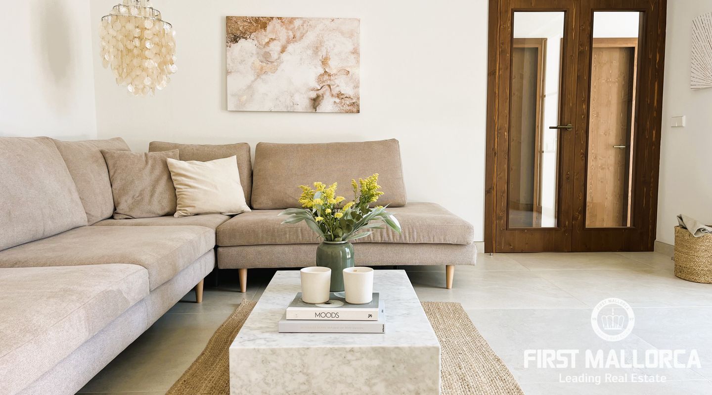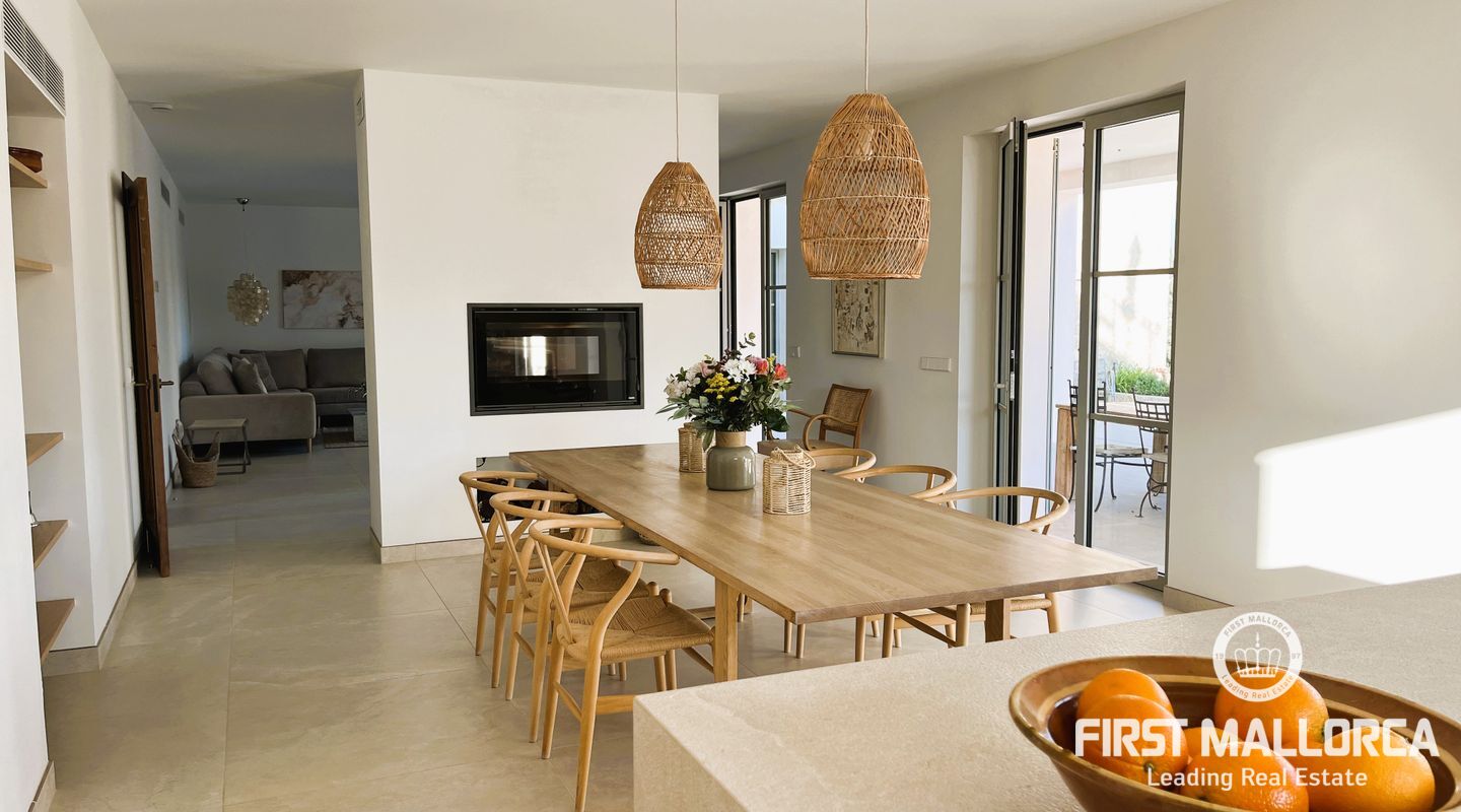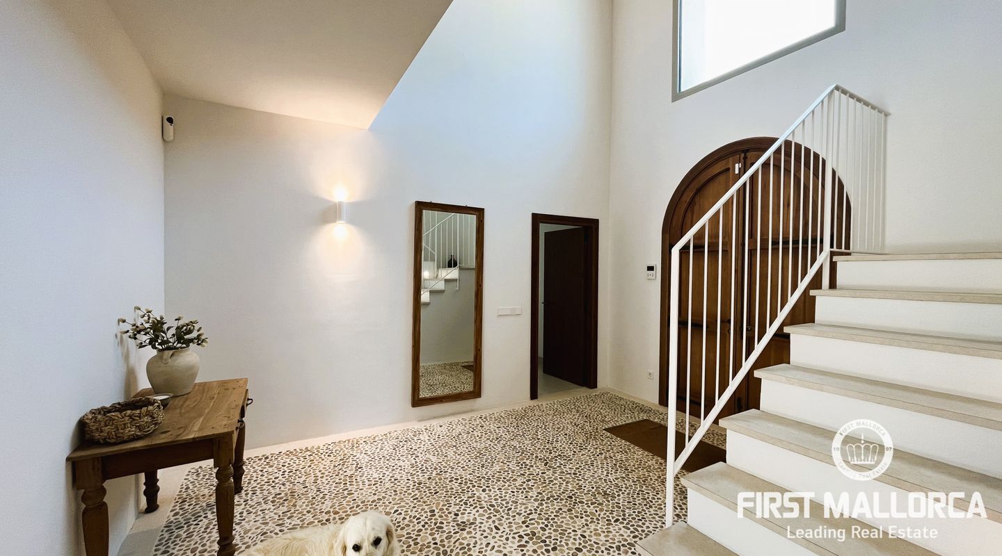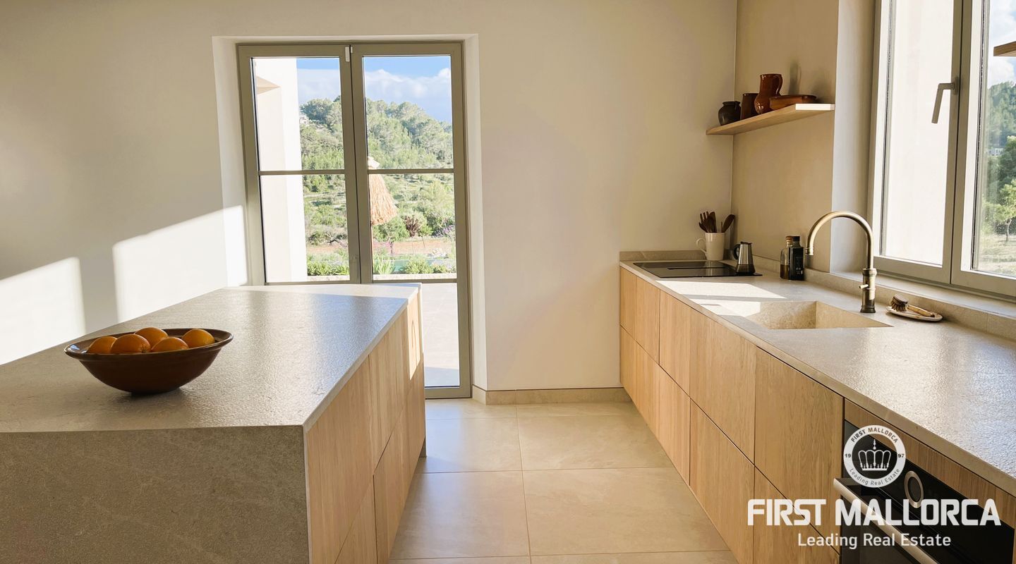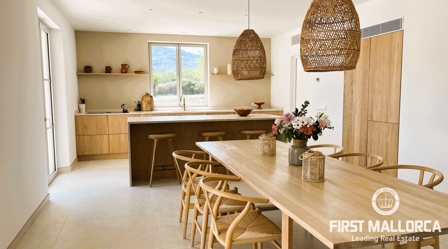 The impressive entrance hall with cobblestone flooring leads into a spacious open-plan living area encompassing the kitchen, dining, and lounge, with four sets of double doors opening onto a large terrace. The oak kitchen features a natural Mallorcan stone worktop, complemented by earth-toned walls and Scandinavian furnishings.